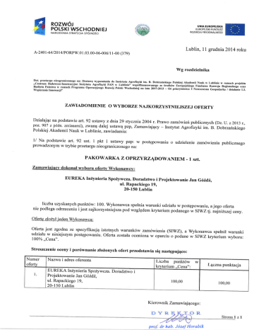 ROZWOJ POLSKI WSCHODNIEJ NARODOWA STRATECIA A-240 | -64 t20 I 4/poRpw.0 1 UNIA EUROPEJSKA EUROPEJSKI FUNDUSZ ROZWOJU REGIONALNEGO SPOJ NOSCI . 03. 00_06_006/ Lublin, 11 grudnia 2014 roku I I _00 (3 79) Wg rozdzielnika stawg wyposaienia do Instytutu Agrofzyki im. B. Dobrzafskiego pols y lllljl "', wsp6lfinansowanego ze Srodk6w E Operacyjnego Rozwrii polski Wscbodniej na lata 20i7_2013 _ OS prio Lublinie w ramach projektu tutu Agrofizyki PAN gonoju Regionatn ego oraz Gospodarka / dzialanie L3. ZAWIADOMIENIE O WYBORZE NAJKORZYSTNIEJSZEJ OF'ERTY Dziataj4c na podstawie art.92 ustawy z dnia29 stycznia2}}4 r. Prawo zam6wief publicznych (Dz.u.22013 r., poz' 907 z p6in' zmianami), zwanq dalej ustaw pzp, zamawiaj4cy 4 - Instytut Agroirzyki im. B. Dobrzafskiego Polskiej Akademii Nauk w Lublinie, zawiadamii: l/ Na podstawie art' 92 ust. 1 pkt 1 ustawy pzp: w postgpowaniu o udzielenie zam6wienia public znego prowadzonym w trybie pr zetar gu nieo graniczone go na: PAKOWARKA Z OPRZYRZADOWANIEM - 1 szt. EUREKA Iniynieria Spozlwcza. Doradztwo i Projektowanie Jan Gbtdt, ul. Rapackiego 19, 20-150 Lublin liczba uzyskanych punkt6w: 100. wykonawca spelnia warunki udziattw postgpowaniu, ajego oferta nie podlega odrzuceniu i jest najkorzystniejszapod wzglgdem kryterium podanego * stwz tj. najnizszej ceny. OfertQ zloZyl jeden Wlzkonawca: oferta jest zgodna ze specyfikacj4 istotnych warunk6w zam6wienia (SIWZ), a wykonawca spelnil warunki udzialu w niniejszym postgpowaniu' oferta zostaLa oceniona w oparciu o podane w SIWZ kryterium wyboru: 100%o ,,Cena". streszczenie oceny i por6wnanie zloionych ofert przedstawia sig nastgpui4co: Nazwa i adres oferenta Liczba punkt6w w tr-4czna punktacja EUREKA InLynieria Spoiryw cza. Doraddwo i Proj ektowan ie J an G o1dL, ul. Rapackiego 79, 20-150 Lublin Kierownik Zamawiaj p 4cego : dr hab. JdzeJ Horabik