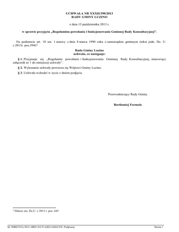 UCHWAŁA NR XXXII/390/2013 RADY GMINY LUZINO z dnia 15 października 2013 r. w sprawie przyjęcia „Regulaminu powołania i funkcjonowania Gminnej Rady Konsultacyjnej”. Na podstawie art. 18 ust. 1 ustawy z dnia 8 marca 1990 roku o samorządzie gminnym (tekst jedn. Dz. U. z 2013r. poz.594)1) Rada Gminy Luzino uchwala, co następuje: § 1. Przyjmuje się „Regulamin powołania i funkcjonowania Gminnej Rady Konsultacyjnej, stanowiący załącznik nr 1 do niniejszej uchwały”. § 2. Wykonanie uchwały powierza się Wójtowi Gminy Luzino. § 3. Uchwała wchodzi w życie z dniem podjęcia. Przewodniczący Rady Gminy Bartłomiej Formela 1) Dalsze zm. Dz.U. z 2013 r. poz. 645 Id: 96BD743A-9431-4B03-81C9-A8D1A8462358. Podpisany Strona 1 Załącznik Nr 1 do Uchwały Nr XXXII/390/2013 Rady Gminy Luzino z 15.10.2013r. Regulamin powołania i funkcjonowania Gminnej Rady Konsultacyjnej I. Cele powołania Rady: 1. Stworzenie moŜliwości ciągłego dialogu społeczności lokalnych z PGNiG SA w celu wymiany informacji dotyczących poszukiwania gazu ze złóŜ niekonwencjonalnych na terenie Gminy Luzino. 2. Gminna Rada Konsultacyjna pracuje z mandatu społecznego, w sposób przejrzysty i jawny, w celu rzetelnej reprezentacji oczekiwań i potrzeb społeczności lokalnej w relacji z PGNiG SA, w duchu współpracy z inwestorem oraz w celu twórczego i aktywnego poszukiwania konstruktywnych i obopólnie satysfakcjonujących rozwiązań. II. Liczba członków Rady: Liczba członków Rady to maksymalnie 10 osób. III. Rekomendowany skład Rady i sposób jej powołania: 1. Mieszkańcy: • 3 członków rekomendowanych przez mieszkańców Gminy Luzino, • osoba rekomendowana powinna dostać na piśmie poparcie od minimum 10 osób, w przypadku duŜej liczby kandydatów decydować będzie liczba osób popierających daną kandydaturę. 2. Organizacje społeczne/pozarządowe: • 2 członków rekomendowanych przez organizacje społeczne/pozarządowe (dotyczy to zarówno organizacji formalnie zarejestrowanych w KRS, jak i nieformalnych kół, zrzeszeń, itp.) działające na terenie Gminy Luzino, • rekomendacja musi być poparta przez przedstawicieli władz przynajmniej trzech organizacji, w przypadku duŜej liczby kandydatów decydować będzie liczba organizacji popierających daną kandydaturę. 3. Rada Gminy: 1 Id: 96BD743A-9431-4B03-81C9-A8D1A8462358. Podpisany Strona 2 • 2 członków rekomendowanych przez Radę Gminy, spośród przedstawicieli władz samorządowych, • rekomendacja musi być poparta przez Radę Gminy. 4. Wójt Gminy Luzino. 5. KaŜda osoba rekomendowana do Rady musi wyrazić na piśmie zgodę na przyjęcie funkcji członka Gminnej Rady Konsultacyjnej. IV. Zasady działania Rady: 1. Uczestnictwo w Radzie ma charakter społeczny. 2. Członkowie Rady za pracę w Radzie nie pobierają wynagrodzenia. 3. Rada na pierwszym spotkaniu wybiera ze swojego grona Przewodniczącego lub Przewodniczącą. 4. Przewodniczący/ca nie powinien/na w Ŝaden sposób być powiązany z instytucjami podejmującymi decyzje w procesie inwestycyjnym ani nie powinien czerpać Ŝadnych korzyści materialnych w związku z realizacją inwestycji – neutralność Przewodniczącego/cej jest jednym z kluczowych warunków powodzenia prac Rady Konsultacyjnej. 5. Zadaniem Przewodniczącego/cej Rady jest zwołanie oraz prowadzenie spotkań Rady. 6. W przypadku nieobecności Przewodniczącego/cej, spotkania prowadzi wyznaczona przez Przewodniczącego/cą na piśmie osoba, która takŜe spełnia kryterium neutralności. 7. Przewodniczący/ca powinien pisemnie potwierdzić przyjęcie roli Przewodniczącego/cej Gminnej Rady Konsultacyjnej. V. Prawa członków Rady: 1. Zwołanie spotkania Rady (zarówno z udziałem przedstawiciela PGNiG SA, jak i bez niego), w celu przedyskutowania waŜnej kwestii, zadania pytań, wyjaśnienia wątpliwości. 2. Kontakt bezpośredni (telefoniczny, mailowy, osobisty) z wyznaczonym przedstawicielem PGNiG SA w sytuacjach wymagających wyjaśnień, odpowiedzi na pytania itp. 3. Wgląd do dokumentacji nie objętej klauzulą „poufne”, ogólnodostępnej, dotyczącej realizacji inwestycji na terenie działania Rady. 4. Wizyty na wiertni podczas prac, po uzyskaniu zgody kierownika ruchu, w uzgodnieniu z wyznaczonym do kontaktów z Radą przedstawicielem PGNiG SA. 5. Korzystania z konsultacji ekspertów z Izby Gospodarczej Gazownictwa. 6. Jeśli Rada uzna za stosowne moŜe konsultować swoje stanowisko z przedstawicielami społeczności lokalnej w ustalonym przez siebie trybie. 2 Id: 96BD743A-9431-4B03-81C9-A8D1A8462358. Podpisany Strona 3 VI. Zadania członków Rady: 1. BieŜący kontakt z mieszkańcami Gminy w kwestiach dotyczących prowadzonych przez PGNiG SA inwestycji. 2. Zgłaszanie do PGNiG SA uwag i pytań przekazywanych przez przedstawicieli społeczności Gminy. 3. Uczestnictwo w cyklicznych spotkaniach Rady z PGNiG SA, organizowanych przez PGNiG SA. Pierwsze w ciągu miesiąca od powołania Rady, kolejne - nie rzadziej niŜ raz na kwartał. 4. Sporządzanie notatek/protokołów ze spotkań Rady. Główne ustalenia ze spotkań Rady zamieszczane są na stronie Urzędu Gminy oraz na stronie www.pgnig.pl 5. Odbieranie korespondencji kierowanej od mieszkańców gminy w sprawach związanych z inwestycją. VII. Tryb pracy Rady: 1. Rada spotyka się cyklicznie z przedstawicielami PGNiG SA, nie rzadziej niŜ jeden raz na kwartał. Terminy spotkań ustalane są z minimum trzytygodniowym wyprzedzeniem. Ze spotkań tych tworzone są notatki/protokoły pisemne dostępne publicznie (dla wszystkich mieszkańców gminy). 2. Rada moŜe się spotykać takŜe bez przedstawiciela PGNiG SA, aby przedyskutować i ustalić wspólne stanowisko przed spotkaniem z PGNiG SA, terminy spotkań są ustalane z wyprzedzeniem minimum 24h. 3. Rada moŜe teŜ ustalać wspólne stanowisko za pośrednictwem kontaktu mailowego, bez konieczności spotkań bezpośrednich. Zgoda danego członka Rady na ustalenia musi zostać prz