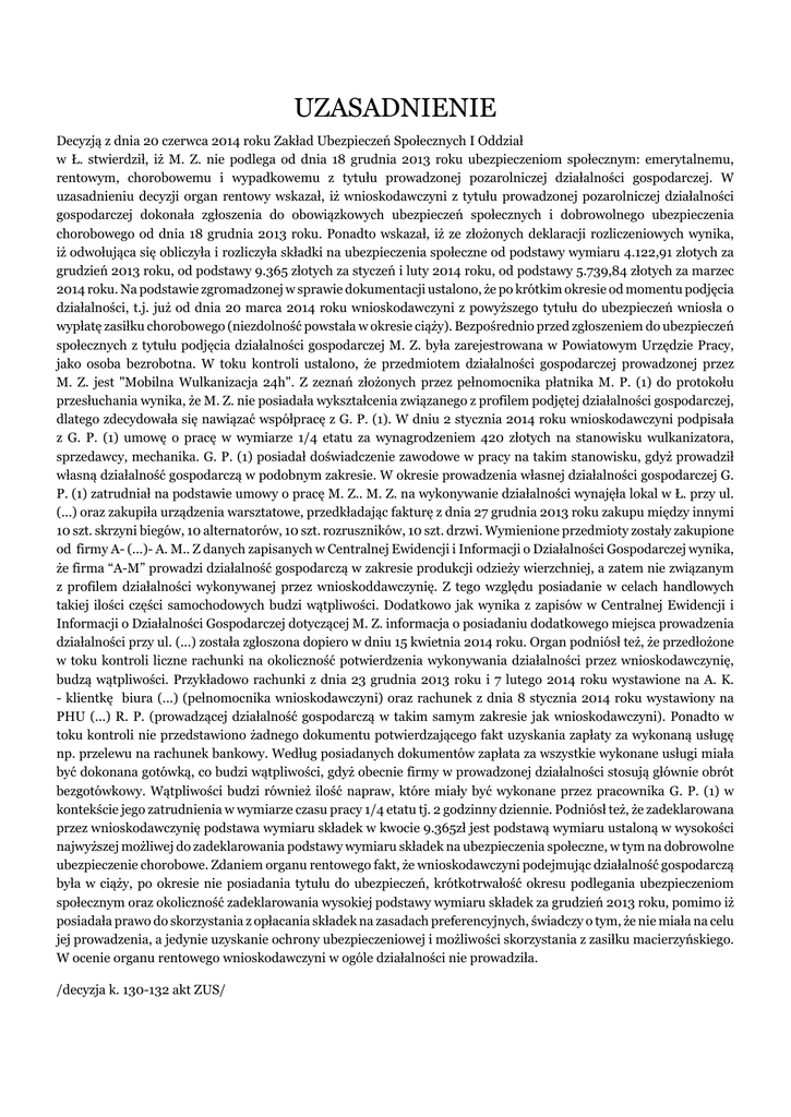 UZASADNIENIE Decyzją z dnia 20 czerwca 2014 roku Zakład Ubezpieczeń Społecznych I Oddział w Ł. stwierdził, iż M. Z. nie podlega od dnia 18 grudnia 2013 roku ubezpieczeniom społecznym: emerytalnemu, rentowym, chorobowemu i wypadkowemu z tytułu prowadzonej pozarolniczej działalności gospodarczej. W uzasadnieniu decyzji organ rentowy wskazał, iż wnioskodawczyni z tytułu prowadzonej pozarolniczej działalności gospodarczej dokonała zgłoszenia do obowiązkowych ubezpieczeń społecznych i dobrowolnego ubezpieczenia chorobowego od dnia 18 grudnia 2013 roku. Ponadto wskazał, iż ze złożonych deklaracji rozliczeniowych wynika, iż odwołująca się obliczyła i rozliczyła składki na ubezpieczenia społeczne od podstawy wymiaru 4.122,91 złotych za grudzień 2013 roku, od podstawy 9.365 złotych za styczeń i luty 2014 roku, od podstawy 5.739,84 złotych za marzec 2014 roku. Na podstawie zgromadzonej w sprawie dokumentacji ustalono, że po krótkim okresie od momentu podjęcia działalności, t.j. już od dnia 20 marca 2014 roku wnioskodawczyni z powyższego tytułu do ubezpieczeń wniosła o wypłatę zasiłku chorobowego (niezdolność powstała w okresie ciąży). Bezpośrednio przed zgłoszeniem do ubezpieczeń społecznych z tytułu podjęcia działalności gospodarczej M. Z. była zarejestrowana w Powiatowym Urzędzie Pracy, jako osoba bezrobotna. W toku kontroli ustalono, że przedmiotem działalności gospodarczej prowadzonej przez M. Z. jest "Mobilna Wulkanizacja 24h". Z zeznań złożonych przez pełnomocnika płatnika M. P. (1) do protokołu przesłuchania wynika, że M. Z. nie posiadała wykształcenia związanego z profilem podjętej działalności gospodarczej, dlatego zdecydowała się nawiązać współpracę z G. P. (1). W dniu 2 stycznia 2014 roku wnioskodawczyni podpisała z G. P. (1) umowę o pracę w wymiarze 1/4 etatu za wynagrodzeniem 420 złotych na stanowisku wulkanizatora, sprzedawcy, mechanika. G. P. (1) posiadał doświadczenie zawodowe w pracy na takim stanowisku, gdyż prowadził własną działalność gospodarczą w podobnym zakresie. W okresie prowadzenia własnej działalności gospodarczej G. P. (1) zatrudniał na podstawie umowy o pracę M. Z.. M. Z. na wykonywanie działalności wynajęła lokal w Ł. przy ul. (...) oraz zakupiła urządzenia warsztatowe, przedkładając fakturę z dnia 27 grudnia 2013 roku zakupu między innymi 10 szt. skrzyni biegów, 10 alternatorów, 10 szt. rozruszników, 10 szt. drzwi. Wymienione przedmioty zostały zakupione od firmy A- (...)- A. M.. Z danych zapisanych w Centralnej Ewidencji i Informacji o Działalności Gospodarczej wynika, że firma “A-M” prowadzi działalność gospodarczą w zakresie produkcji odzieży wierzchniej, a zatem nie związanym z profilem działalności wykonywanej przez wnioskoddawczynię. Z tego względu posiadanie w celach handlowych takiej ilości części samochodowych budzi wątpliwości. Dodatkowo jak wynika z zapisów w Centralnej Ewidencji i Informacji o Działalności Gospodarczej dotyczącej M. Z. informacja o posiadaniu dodatkowego miejsca prowadzenia działalności przy ul. (...) została zgłoszona dopiero w dniu 15 kwietnia 2014 roku. Organ podniósł też, że przedłożone w toku kontroli liczne rachunki na okoliczność potwierdzenia wykonywania działalności przez wnioskodawczynię, budzą wątpliwości. Przykładowo rachunki z dnia 23 grudnia 2013 roku i 7 lutego 2014 roku wystawione na A. K. - klientkę biura (...) (pełnomocnika wnioskodawczyni) oraz rachunek z dnia 8 stycznia 2014 roku wystawiony na PHU (...) R. P. (prowadzącej działalność gospodarczą w takim samym zakresie jak wnioskodawczyni). Ponadto w toku kontroli nie przedstawiono żadnego dokumentu potwierdzającego fakt uzyskania zapłaty za wykonaną usługę np. przelewu na rachunek bankowy. Według posiadanych dokumentów zapłata za wszystkie wykonane usługi miała być dokonana gotówką, co budzi wątpliwości, gdyż obecnie firmy w prowadzonej działalności stosują głównie obrót bezgotówkowy. Wątpliwości budzi również ilość napraw, które miały być wykonane przez pracownika G. P. (1) w kontekście jego zatrudnienia w wymiarze czasu pracy 1/4 etatu tj. 2 godzinny dziennie. Podniósł też, że zadeklarowana przez wnioskodawczynię podstawa wymiaru składek w kwocie 9.365zł jest podstawą wymiaru ustaloną w wysokości najwyższej możliwej do zadeklarowania podstawy wymiaru składek na ubezpieczenia społeczne, w tym na dobrowolne ubezpieczenie chorobowe. Zdaniem organu rentowego fakt, że wnioskodawczyni podejmując działalność gospodarczą była w ciąży, po okresie nie posiadania tytułu do ubezpieczeń, krótkotrwałość okresu podlegania ubezpieczeniom społecznym oraz okoliczność zadeklarowania wysokiej podstawy wymiaru składek za grudzień 2013 roku, pomimo iż posiadała prawo do skorzystania z opłacania składek na zasadach preferencyjnych, świadczy o tym, że nie miała na celu jej prowadzenia, a jedynie uzyskanie ochrony ubezpieczeniowej i możliwości skorzystania z zasiłku macierzyńskiego. W ocenie organu rentowego wnioskodawczyni w ogóle działalności nie prowadziła. /decyzja k. 130-132 akt ZUS/ Wnioskodawczyni M. Z. zakwestionowała zasadność powyższej decyzji i w dniu 23 lipca 2014 roku złożyła odwołanie. Wniosła o zmianę zaskarżonej decyzji w całości poprzez uznanie, iż jako osoba prowadząca pozarolniczą działalność gospodarczą podlega obowiązkowemu ubezpieczeniu emerytalnemu, rentowemu, wypadkowemu oraz dobrowolnemu ubezpieczeniu chorobowemu od dnia 18 grudnia 2013 roku, oraz o zasądzenie kosztów postępowania według norm przepisanych. W odwołaniu wskazała, że wbrew stanowisku organu rentowego nie budzą wątpliwości powiązania pomiędzy różnymi podmiotami, które obsługiwane są przez biuro (...). Wyjaśniła, że biuro rachunkowe cieszy się powszechnie znakomitą opinią, zostało jej polecone przez A. K.