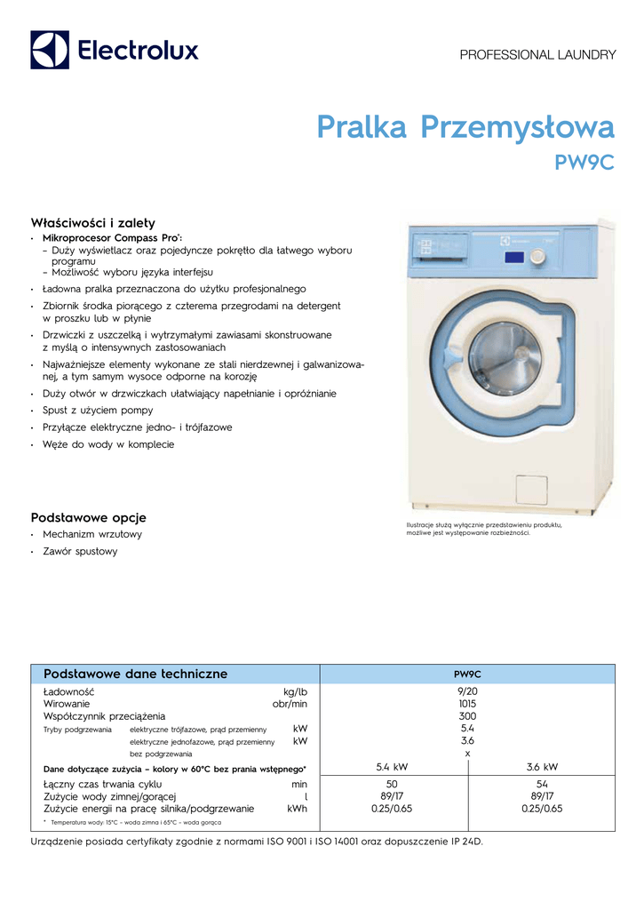 PROFESSIONAL LAUNDRY Pralka Przemysłowa PW9C Właściwości i zalety • Mikroprocesor Compass Pro®: –Duży wyświetlacz oraz pojedyncze pokrętło dla łatwego wyboru programu –Możliwość wyboru języka interfejsu • Ładowna pralka przeznaczona do użytku profesjonalnego • Zbiornik środka piorącego z czterema przegrodami na detergent w proszku lub w płynie • Drzwiczki z uszczelką i wytrzymałymi zawiasami skonstruowane z myślą o intensywnych zastosowaniach • Najważniejsze elementy wykonane ze stali nierdzewnej i galwanizowanej, a tym samym wysoce odporne na korozję • Duży otwór w drzwiczkach ułatwiający napełnianie i opróżnianie • Spust z użyciem pompy • Przyłącze elektryczne jedno- i trójfazowe • Węże do wody w komplecie Podstawowe opcje Ilustracje służą wyłącznie przedstawieniu produktu, możliwe jest występowanie rozbieżności. • Mechanizm wrzutowy • Zawór spustowy Podstawowe dane techniczne PW9C Ładowność kg/lb Wirowanie obr/min Współczynnik przeciążenia Tryby podgrzewania elektryczne trójfazowe, prąd przemiennykW elektryczne jednofazowe, prąd przemiennykW bez podgrzewania Dane dotyczące zużycia – kolory w 60°C bez prania wstępnego* Łączny czas trwania cyklu Zużycie wody zimnej/gorącej Zużycie energii na pracę silnika/podgrzewanie 9/20 1015 300 5.4 3.6 x 5.4 kW min 50 l 89/17 kWh 0.25/0.65 * Temperatura wody: 15°C – woda zimna i 65°C – woda gorąca Urządzenie posiada certyfikaty zgodnie z normami ISO 9001 i ISO 14001 oraz dopuszczenie IP 24D. 3.6 kW 54 89/17 0.25/0.65 Połączenia elektryczne* Możliwe Napięcie Moc Moc Zalecany bezpiecznik rodzaje grzewcza całkowita podgrzewania Hz kW kW A Podgrzewanie elektryczne 220-240V 1 ~ 380-415V 3N ~ 50/60 50/60 3.0/5.4 3.0/5.4 Para lub 220-480V 1 ~ 50/60 bez podgrzewania 3.1/5.5 3.1/5.5 - 16/25 16/25 1.0 10 A 1 3 PW9C Zawory wody DN Ciśnienie wody kPa Przepustowość przy 300 kPa l/min Średnica zaworu spustowego (opcjonalnego) ø mm Wydajność spustu (pompa) l/min (zawór spustowy) l/min Liczba dopływów płynnych środków piorących (opcjonalnych) 20 150-400 16 50/75 30 160 3 Przyłącze wody i pary 2 C Wymagania dotyczące podłoża 16.9 1.4 ± 0.5 Częstość oddziaływania siły dynamicznej Hz Nacisk na posadzkę przy maksymalnych obrotach kN Poziomy hałasu Poziom mocy akustycznej w powietrzu 71 dB(A) Strona przednia Ciepło wypromieniowywane 5 wartość maksymalna (% mocy zainstalowanej) B Parametry transportowe* Masa Gabaryty transportowe 135 kg netto 0.81 m 3 Wymiary mm 720 1130 1113 408 721 831 80 1030 224 124 1010 910 278 98 239 1 2 3 4 5 D E Widok z boku 6 Dopływy płynnych środków piorących Panel sterowniczy Otwór załadunkowy o średnicy 310 mm 7 Zawór spustowy 8 Przyłącze elektryczne Zbiornik środka piorącego 9 Przyłącze pary Woda zimna 10 Przyłącze wody zawracanej Woda gorąca * Dane średnie. Waga brutto/objętość transportowa zależy od konfiguracji. W celu uzyskania dokładnych danych proszę skontaktować się z działem logistyki. I G J 10 5 4 9 6 8 L F K H 700 mm ± 50 mm M Pompa www.electrolux.com/professional Share more of our thinking at www.electrolux.com O Tył 7 Art. No. 438919529PL/2015.01.14 N Zastrzega się prawo do zmiany danych technicznym bez powiadomienia. ASzerokość BGłębokość CWysokość D E F G H I J K L M N O