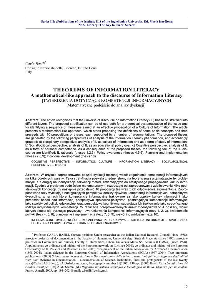 Series III: ePublications of the Institute ILS of the Jagiellonian University. Ed. Maria Kocójowa No 5. Library: The Key to Users’ Success Carla Basili * Consiglio Nazionale delle Ricerche, Istituto Ceris Italy THEOREMS OF INFORMATION LITERACY A mathematical-like approach to the discourse of Information Literacy [TWIERDZENIA DOTYCZĄCE KOMPETENCJI INFORMACYJNYCH Matematyczne podejście do analizy dyskusji] Abstract: The article recognises that the universe of discourse on Information Literacy (IL) has to be stratified into different layers. The proposed stratification can be of use both for a theoretical systematisation of the issue and for identifying a sequence of measures aimed at an effective propagation of a Culture of Information. The article presents a mathematical-like approach, which starts proposing the definitions of some basic concepts and then proceeds with 10 propositions or theses, each supported by a number of argumentations. The proposed theses are generated by the following perspectives of analysis of the Information Literacy phenomenon, and accordingly grouped: a) disciplinary perspective: analysis of IL as culture of Information and as a form of study of information; b) Social/political perspective: analysis of IL as an educational policy goal; c) Cognitive perspective: analysis of IL as a form of personal competence. As a consequence of the proposed theses, the following foci of the IL discourse are identified: IL rationale (theses 1,2,3); Policy awareness (theses 4,5,6); Planning and implementation (theses 7,8,9); Individual development (thesis 10). COGNITIVE PERSPECTIVE – INFORMATION CULTURE – INFORMATION LITERACY – SOCIAL/POLITICAL PERSPECTIVE – THEORY Abstrakt: W artykule zaproponowano podział dyskusji toczonej wokół zagadnienia kompetencji informacyjnych na kilka odrębnych warstw. Taka stratyfikacja pozwala z jednej strony na teoretyczną systematyzację tej problematyki, a z drugiej na identyfikacje sekwencji metod, zmierzających do efektywnego propagowania kultury informacji. Zgodnie z przyjętym podejściem matematycznym, rozpoczęto od zaproponowania zdefiniowania kilku podstawowych koncepcji, by następnie przedstawić 10 propozycji tez wraz z ich odpowiednią argumentacją. Zaproponowane tezy wynikają z następujących perspektyw analizy zjawiska kompetencji informacyjnych: perspektywa dyscypliny, w ramach której kompetencje informacyjne traktowane są jako przejaw kultury informacji i jako przedmiot badań nad informacją, perspektywa społeczno-polityczna, postrzegająca kompetencje informacyjne jako swoisty cel polityki edukacyjnej oraz perspektywa kognitywna, sugerująca ich traktowanie jako specyficznego rodzaju indywidualnych kompetencji. W rezultacie przeprowadzonych analiz zidentyfikowano 4 obszary, wokół których skupia się dyskusja: przyczyny i uwarunkowania kompetencji informacyjnych (tezy 1, 2, 3), świadomość polityki (tezy 4, 5, 6), planowanie i implementacja (tezy 7, 8, 9), rozwój indywidualny (teza 10). INFORMACYJNE UMIEJĘTNOŚCI – KOGNITYWNA PERSPEKTYWA – KULTURA INFORMACJI – SPOŁECZNOPOLITYCZNA PERSPEKTYWA – TEORIA INFORMACJI NAUKOWEJ * Professor CARLA BASILI, Current position: Senior researcher at the Italian National Research Council (since 1988); associate professor of documentation in the Faculty of Humanities, Università degli Studi di Macerata (since 1995); associate professor in Communication Studies, Faculty of Humanities, Libera Università Maria SS. Assunta (LUMSA) (since 1998). Appointments: co-ordinator and initiator of the European network on IL (since 2001); co-ordinator and initiator of the European Observatory on IL Policies and Research (since 2006); vice-president of the Italian Association for Advanced Documentation (1998-2004); Italian delegate in the European Council of Information Associations (ECIA) (1997–2004). Two important publications: (2003) Scienza nella documentazione – Documentazione della scienza. Istituzioni, fatti e protagonisti degli ultimi venti anni (Science in Documentation – Documentation of Science. Institutions, facts and protagonists of the last twenty years)/Carla BASILI (ed.), «AIDAInformazioni», Monographic number 21(2003), 130 pp.; (2003) Basili, Carla La diffusione dei risultati scientifici, [In:] A.M. Scarda (ed.) Rapporto sul sistema scientifico e tecnologico in Italia. Elementi per un'analisi. Franco Angeli, 2003, pp. 191–202. E-mail: [email protected] 15 Series III: ePublications of the Institute ILS of the Jagiellonian University. Ed. Maria Kocójowa No 5. Library: The Key to Users’ Success * * * Introduction* Nearly twenty years after the historical ALA report [http://www.infolit.org/documents/89Report.htm], in which Information Literacy (IL) is defined as “the ability to access, evaluate and use information from a variety of sources” the configuration of discourse about the IL phenomenon appears focused around the following key issues: the promoter community of the IL problem is the librarian one; in the Library and Information Science (LIS) field a large consent about IL importance do exists, but a universally accepted definition of the concept is still lacking; outside the LIS community a very scarce awareness of the question and of the distinction between the concepts of “Information” and “Informatics” persists and prevails; a great number of tools of self-teaching has been developed, in the form of tutorials, mostly by initiative of libraries; a great amount of specialised literature about IL is available, however it’s needed an agreement about concrete actions, agents and ways for an effective embodiment of the IL objective. The IL territory has been ironically defined as "the IL land of confusion" [http://lorenzen.blogspot.com/]. In view of the above, we strongly believe that coherent pragmatic decisions can derive from coherent theoretical premises. Therefore, with such intent, we want to propose here several theses, w