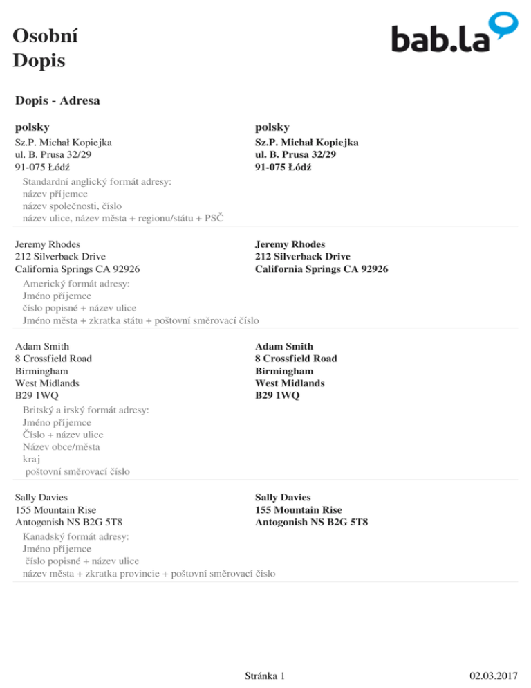 Osobní Dopis Dopis - Adresa polsky polsky Sz.P. Michał Kopiejka ul. B. Prusa 32/29 91-075 Łódź Standardní anglický formát adresy: název příjemce název společnosti, číslo název ulice, název města + regionu/státu + PSČ Sz.P. Michał Kopiejka ul. B. Prusa 32/29 91-075 Łódź Jeremy Rhodes Jeremy Rhodes 212 Silverback Drive 212 Silverback Drive California Springs CA 92926 California Springs CA 92926 Americký formát adresy: Jméno příjemce číslo popisné + název ulice Jméno města + zkratka státu + poštovní směrovací číslo Adam Smith 8 Crossfield Road Birmingham West Midlands B29 1WQ Britský a irský formát adresy: Jméno příjemce Číslo + název ulice Název obce/města kraj poštovní směrovací číslo Adam Smith 8 Crossfield Road Birmingham West Midlands B29 1WQ Sally Davies Sally Davies 155 Mountain Rise 155 Mountain Rise Antogonish NS B2G 5T8 Antogonish NS B2G 5T8 Kanadský formát adresy: Jméno příjemce číslo popisné + název ulice název města + zkratka provincie + poštovní směrovací číslo Stránka 1 02.03.2017 Osobní Dopis Celia Jones 47 Herbert Street Floreat Perth WA 6018 Australský formát adresy: Jméno příjemce Číslo popisné + název ulice název provincie název obce/města + poštovní směrovací číslo Celia Jones 47 Herbert Street Floreat Perth WA 6018 Alex Marshall 745 King Street West End Wellington 0680 Novozélandský formát adresy: Jméno příjemce Číslo + název ulice číslo části města/ PO box obec/město + PSČ Alex Marshall 745 King Street West End Wellington 0680 Dopis - Úvod polsky polsky Drogi Janie, Drogi Janie, Neformální, standardní způsob při psaní kamarádovi Droga Mamo/Drogi Tato, / Kochani Rodzice, Neformální, standardní způsob při psaní rodičům Droga Mamo/Drogi Tato, / Kochani Rodzice, Drogi Wujku, Drogi Wujku, Neformální, standardní způsob při psaní členům rodiny Cześć Michale, Cześć Michale, Neformální, standardní způsob při psaní kamarádovi Hej Janku, Hej Janku, Velmi neformální, standardní způsob při psaní kamarádovi Stránka 2 02.03.2017 Osobní Dopis Janku, Neformální, přímý způsob při psaní kamarádovi Janku, Mój Drogi/Moja Droga, Mój Drogi/Moja Droga, Velmi neformální, používá se při psaní svému milovanému/své milované Mój Najdroższy/Moja Najdroższa, Mój Najdroższy/Moja Najdroższa, Velmi neformální, používá se při psaní svému partnerovi Najdroższy/Najdroższa, Neformální, používá se při psaní svému partnerovi Najdroższy/Najdroższa, Dziękuję za Twój list. Používá se při odpovídání na korespondenci Dziękuję za Twój list. Cieszę się, że się odezwałeś/-aś. Používá se při odpovídání na korespondenci Cieszę się, że się odezwałeś/-aś. Przepraszam, że nie pisałem/-am tak długo. Przepraszam, że nie pisałem/-am tak długo. Používá se při psaní se starým přítelem, kterého jste chvíli nekontaktovali Minęło sporo czasu od naszego ostatniego kontaktu. Minęło sporo czasu od naszego ostatniego kontaktu. Používá se při psaní se starým přítelem, které jste nekontaktovali už nějakou dobu Dopis - Hlavní část polsky polsky Piszę, by przekazać Ci... Používá se pro důležité zprávy Piszę, by przekazać Ci... Czy masz już plany na...? Czy masz już plany na...? Používá se v případě, že chcete někoho pozvat na událost nebo se s nimi potkat Dziękuję bardzo za Dziękuję bardzo za przesłanie/zaproszenie/załączenie... przesłanie/zaproszenie/załączenie... Používá se při děkování někomu za poslání něčeho/pozvání někoho někam/přiložení nějaké informace Stránka 3 02.03.2017 Osobní Dopis Jestem Ci bardzo wdzięczny za poinformowanie Jestem Ci bardzo wdzięczny za poinformowanie mnie/zaoferowanie mi/napisanie mi... mnie/zaoferowanie mi/napisanie mi... Používá se, když chcete někomu upřímně poděkovat za to, že vám něco řekl/něco vám nabídl/kvůli něčemu vám napsal Jak miło, że do mnie napisałeś/mnie zaprosiłeś Jak miło, że do mnie napisałeś/mnie zaprosiłeś do/przesłałeś mi... do/przesłałeś mi... Používá se, když chcete upřímně ocenit něco, co vám někdo napsal/poslal/na něco pozval Z przyjemnością powiadamiam, że... Z przyjemnością powiadamiam, że... Používá se při oznamování kamarádům nějakou dobrou zprávu Ucieszyłem się słysząc, że... Používá se při předávání zprávy nebo novinky Ucieszyłem się słysząc, że... Z przykrością piszę, że... Z przykrością piszę, że... Používá se při oznamování smutných zpráv kamarádům Tak przykro mi słyszeć, że... Tak przykro mi słyszeć, że... Používá se pro utěšení kamaráda ohledně špatné zprávy Dopis - Závěr polsky polsky Ucałuj ode mnie ... i przekaż im, jak bardzo za nimi Ucałuj ode mnie ... i przekaż im, jak bardzo za nimi tęsknię. tęsknię. Používá se, když chcete říci někomu, že vám chybí přes příjemce daného dopisu Pozdrowienia od... Používá se při zmínění pozdravů od někoho Pozdrowienia od... Pozdrów ode mnie... Pozdrów ode mnie... Používá se, když chcete pozdravit někoho dalšího přes osobu, které píšete Czekam na Twoją odpowiedź. Používá se, když chcete na dopis dostat odpověď Czekam na Twoją odpowiedź. Stránka 4 02.03.2017 Osobní Dopis Odpisz szybko. Odpisz szybko. Přímé, používá se, když chcete na dopis dostat odpověď Odpisz, gdy... Odpisz, gdy... Používá se, když chcete dostat odpověď pouze, když budou nějaké novinky Napisz, gdy będziesz miał jakieś nowe informacje. Napisz, gdy będziesz miał jakieś nowe informacje. Používá se, když chcete dostat odpověď pouze, když budou nějaké novinky Trzymaj się ciepło. Používá se při psaní s rodinou a přáteli Trzymaj się ciepło. Kocham Cię. Používá se při psaní svému partnerovi Kocham Cię. Pozdrawiam serdecznie,