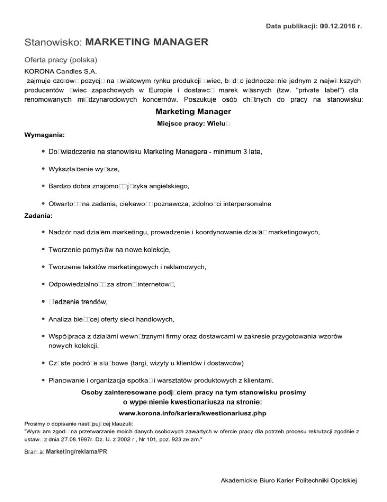 Data publikacji: 09.12.2016 r. Stanowisko: MARKETING MANAGER Oferta pracy (polska) KORONA Candles S.A. zajmuje czo³ow± pozycjê na ¶wiatowym rynku produkcji ¶wiec, bêd±c jednocze¶nie jednym z najwiêkszych producentów ¶wiec zapachowych w Europie i dostawc± marek w³asnych (tzw. "private label") dla renomowanych miêdzynarodowych koncernów. Poszukuje osób chêtnych do pracy na stanowisku: Marketing Manager Miejsce pracy: Wieluñ Wymagania: Do¶wiadczenie na stanowisku Marketing Managera - minimum 3 lata, Wykszta³cenie wy¿sze, Bardzo dobra znajomo¶æ jêzyka angielskiego, Otwarto¶æ na zadania, ciekawo¶æ poznawcza, zdolno¶ci interpersonalne Zadania: Nadzór nad dzia³em marketingu, prowadzenie i koordynowanie dzia³añ marketingowych, Tworzenie pomys³ów na nowe kolekcje, Tworzenie tekstów marketingowych i reklamowych, Odpowiedzialno¶æ za stronê internetow±, ¦ledzenie trendów, Analiza bie¿±cej oferty sieci handlowych, Wspó³praca z dzia³ami wewnêtrznymi firmy oraz dostawcami w zakresie przygotowania wzorów nowych kolekcji, Czêste podró¿e s³u¿bowe (targi, wizyty u klientów i dostawców) Planowanie i organizacja spotkañ i warsztatów produktowych z klientami. Osoby zainteresowane podjêciem pracy na tym stanowisku prosimy o wype³nienie kwestionariusza na stronie: www.korona.info/kariera/kwestionariusz.php Prosimy o dopisanie nastêpuj±cej klauzuli: "Wyra¿am zgodê na przetwarzanie moich danych osobowych zawartych w ofercie pracy dla potrzeb procesu rekrutacji zgodnie z ustaw± z dnia 27.08.1997r. Dz. U. z 2002 r., Nr 101, poz. 923 ze zm." Bran¿a: Marketing/reklama/PR Akademickie Biuro Karier Politechniki Opolskiej