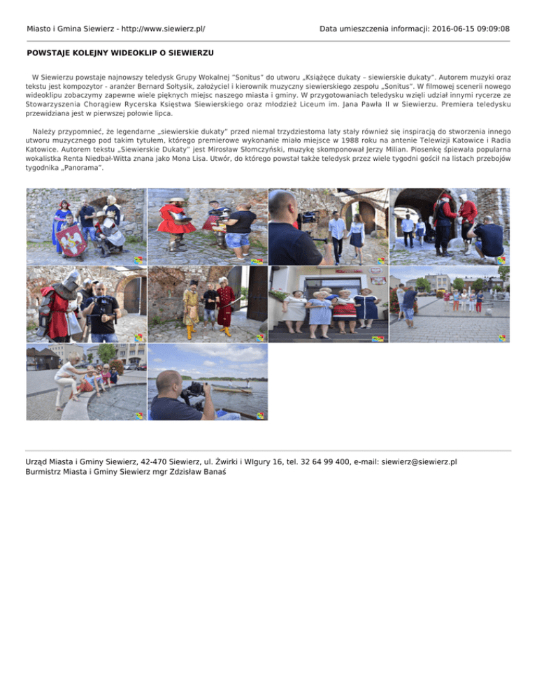 Miasto i Gmina Siewierz - http://www.siewierz.pl/ Data umieszczenia informacji: 2016-06-15 09:09:08 POWSTAJE KOLEJNY WIDEOKLIP O SIEWIERZU W Siewierzu powstaje najnowszy teledysk Grupy Wokalnej ”Sonitus” do utworu „Książęce dukaty – siewierskie dukaty”. Autorem muzyki oraz tekstu jest kompozytor - aranżer Bernard Sołtysik, założyciel i kierownik muzyczny siewierskiego zespołu „Sonitus”. W filmowej scenerii nowego wideoklipu zobaczymy zapewne wiele pięknych miejsc naszego miasta i gminy. W przygotowaniach teledysku wzięli udział innymi rycerze ze Stowarzyszenia Chorągiew Rycerska Księstwa Siewierskiego oraz młodzież Liceum im. Jana Pawła II w Siewierzu. Premiera teledysku przewidziana jest w pierwszej połowie lipca. Należy przypomnieć, że legendarne „siewierskie dukaty” przed niemal trzydziestoma laty stały również się inspiracją do stworzenia innego utworu muzycznego pod takim tytułem, którego premierowe wykonanie miało miejsce w 1988 roku na antenie Telewizji Katowice i Radia Katowice. Autorem tekstu „Siewierskie Dukaty” jest Mirosław Słomczyński, muzykę skomponował Jerzy Milian. Piosenkę śpiewała popularna wokalistka Renta Niedbał-Witta znana jako Mona Lisa. Utwór, do którego powstał także teledysk przez wiele tygodni gościł na listach przebojów tygodnika „Panorama”. Urząd Miasta i Gminy Siewierz, 42-470 Siewierz, ul. Żwirki i WIgury 16, tel. 32 64 99 400, e-mail: [email protected] Burmistrz Miasta i Gminy Siewierz mgr Zdzisław Banaś