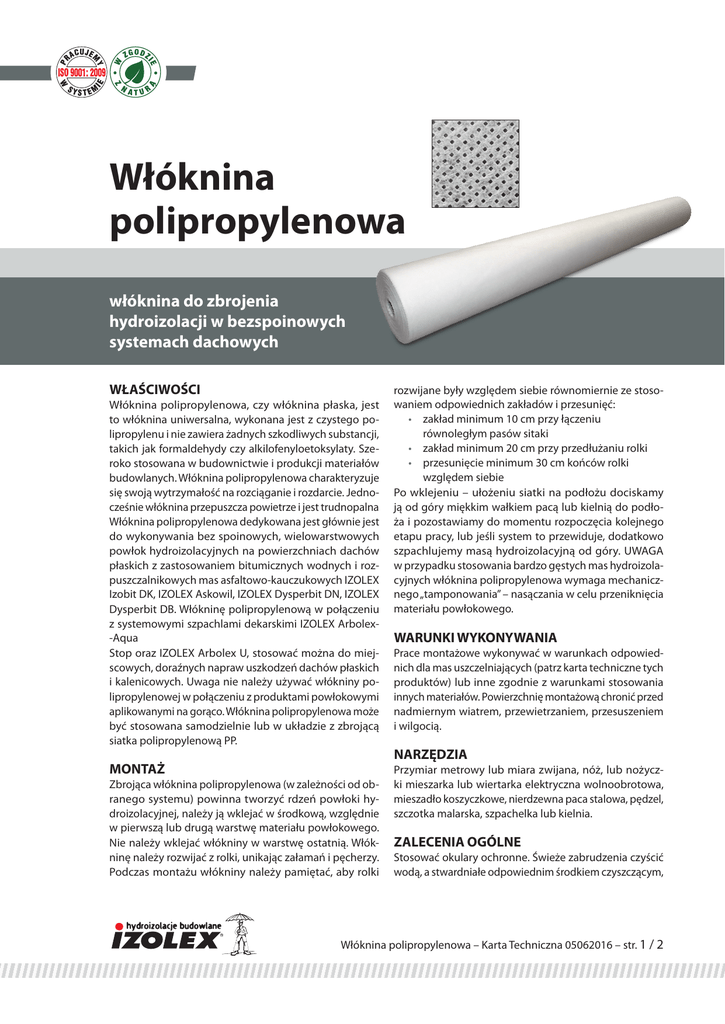 Włóknina polipropylenowa włóknina do zbrojenia hydroizolacji w bezspoinowych systemach dachowych WŁAŚCIWOŚCI Włóknina polipropylenowa, czy włóknina płaska, jest to włóknina uniwersalna, wykonana jest z czystego polipropylenu i nie zawiera żadnych szkodliwych substancji, takich jak formaldehydy czy alkilofenyloetoksylaty. Szeroko stosowana w budownictwie i produkcji materiałów budowlanych. Włóknina polipropylenowa charakteryzuje się swoją wytrzymałość na rozciąganie i rozdarcie. Jednocześnie włóknina przepuszcza powietrze i jest trudnopalna Włóknina polipropylenowa dedykowana jest głównie jest do wykonywania bez spoinowych, wielowarstwowych powłok hydroizolacyjnych na powierzchniach dachów płaskich z zastosowaniem bitumicznych wodnych i rozpuszczalnikowych mas asfaltowo-kauczukowych IZOLEX Izobit DK, IZOLEX Askowil, IZOLEX Dysperbit DN, IZOLEX Dysperbit DB. Włókninę polipropylenową w połączeniu z systemowymi szpachlami dekarskimi IZOLEX Arbolex-Aqua Stop oraz IZOLEX Arbolex U, stosować można do miejscowych, doraźnych napraw uszkodzeń dachów płaskich i kalenicowych. Uwaga nie należy używać włókniny polipropylenowej w połączeniu z produktami powłokowymi aplikowanymi na gorąco. Włóknina polipropylenowa może być stosowana samodzielnie lub w układzie z zbrojącą siatka polipropylenową PP. MONTAŻ Zbrojąca włóknina polipropylenowa (w zależności od obranego systemu) powinna tworzyć rdzeń powłoki hydroizolacyjnej, należy ją wklejać w środkową, względnie w pierwszą lub drugą warstwę materiału powłokowego. Nie należy wklejać włókniny w warstwę ostatnią. Włókninę należy rozwijać z rolki, unikając załamań i pęcherzy. Podczas montażu włókniny należy pamiętać, aby rolki rozwijane były względem siebie równomiernie ze stosowaniem odpowiednich zakładów i przesunięć: • zakład minimum 10 cm przy łączeniu równoległym pasów sitaki • zakład minimum 20 cm przy przedłużaniu rolki • przesunięcie minimum 30 cm końców rolki względem siebie Po wklejeniu – ułożeniu siatki na podłożu dociskamy ją od góry miękkim wałkiem pacą lub kielnią do podłoża i pozostawiamy do momentu rozpoczęcia kolejnego etapu pracy, lub jeśli system to przewiduje, dodatkowo szpachlujemy masą hydroizolacyjną od góry. UWAGA w przypadku stosowania bardzo gęstych mas hydroizolacyjnych włóknina polipropylenowa wymaga mechanicznego „tamponowania” – nasączania w celu przeniknięcia materiału powłokowego. WARUNKI WYKONYWANIA Prace montażowe wykonywać w warunkach odpowiednich dla mas uszczelniających (patrz karta techniczne tych produktów) lub inne zgodnie z warunkami stosowania innych materiałów. Powierzchnię montażową chronić przed nadmiernym wiatrem, przewietrzaniem, przesuszeniem i wilgocią. NARZĘDZIA Przymiar metrowy lub miara zwijana, nóż, lub nożyczki mieszarka lub wiertarka elektryczna wolnoobrotowa, mieszadło koszyczkowe, nierdzewna paca stalowa, pędzel, szczotka malarska, szpachelka lub kielnia. ZALECENIA OGÓLNE Stosować okulary ochronne. Świeże zabrudzenia czyścić wodą, a stwardniałe odpowiednim środkiem czyszczącym, Włóknina polipropylenowa – Karta Techniczna 05062016 – str. 1 / 2 niepowodującym niszczenia taśm. Producent nie odpowiada za szkody wynikłe z nieumiejętnego lub niezgodnego z przeznaczeniem użycia wyrobu. Prace prowadzić zgodnie z projektem, kartą techniczną, zasadami sztuki budowlanej i przepisami BHP. TRANSPORT I PRZECHOWYWANIE Transportować w oryginalnych opakowaniach, w pozycji poziomej, zabezpieczając przed uszkodzeniami mechanicznymi. Przechowywać w pomieszczeniach chroniących przed uszkodzeniami mechanicznymi. Producent nie ma wpływu na niewłaściwe użycie materiału, jego zastosowanie do innych celów lub w innych warunkach niż wyżej opisane. W przypadkach wątpliwych należy wykonywać własne próby lub zasięgnąć porady producenta. Prawidłowe, a tym samym skuteczne, stosowanie preparatu nie podlega naszej kontroli, dlatego gwarancją objęta jest tylko jakość naszego wyrobu. Producent ani jego upoważniony przedstawiciel nie może ponosić odpowiedzialności za straty poniesione wskutek nieprawidłowego użycia lub przechowywania produktu. Data aktualizacji 02-01-2014 CZYSZCZENIE NARZĘDZI PRODUCENT Bezpośrednio po zakończeniu prac, czystą wodą, po związaniu mechanicznie. Rolki ofoliowane Włóknina polipropylenowa rolka 160 m2 – szt. 1 Izolex sp. z o.o. ul. Górna 5, 83-250 Skarszewy tel. +48 58 588 22 24, +48 58 560 12 20 tel./fax +48 58 588 03 22 e-mail: [email protected] www.izolex.pl DANE TECHNICZNE DORADZTWO TECHNICZNE OPAKOWANIA • Aprobata Techniczna AT/2000-11-0063, KDZ 03/04 Masa powierzchniowa 50 g/m2 e-mail faks telefon GSM [email protected] 58-588-03-22 58-560-12-25 608-583-401 [email protected] 58-588-03-22 58-560-12-35 666-073-885 Włóknina polipropylenowa – Karta Techniczna 05062016 – str. 2 / 2