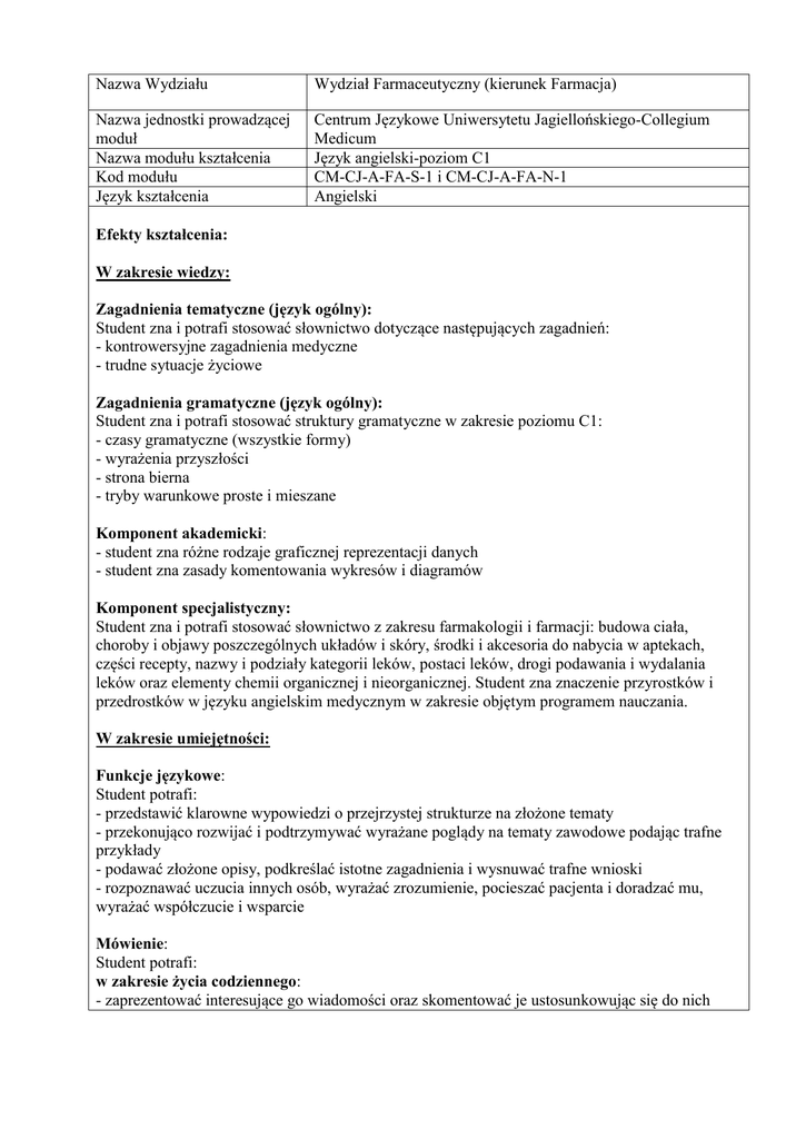 Nazwa Wydziału Wydział Farmaceutyczny (kierunek Farmacja) Nazwa jednostki prowadzącej moduł Nazwa modułu kształcenia Kod modułu Język kształcenia Centrum Językowe Uniwersytetu Jagiellońskiego-Collegium Medicum Język angielski-poziom C1 CM-CJ-A-FA-S-1 i CM-CJ-A-FA-N-1 Angielski Efekty kształcenia: W zakresie wiedzy: Zagadnienia tematyczne (język ogólny): Student zna i potrafi stosować słownictwo dotyczące następujących zagadnień: - kontrowersyjne zagadnienia medyczne - trudne sytuacje życiowe Zagadnienia gramatyczne (język ogólny): Student zna i potrafi stosować struktury gramatyczne w zakresie poziomu C1: - czasy gramatyczne (wszystkie formy) - wyrażenia przyszłości - strona bierna - tryby warunkowe proste i mieszane Komponent akademicki: - student zna różne rodzaje graficznej reprezentacji danych - student zna zasady komentowania wykresów i diagramów Komponent specjalistyczny: Student zna i potrafi stosować słownictwo z zakresu farmakologii i farmacji: budowa ciała, choroby i objawy poszczególnych układów i skóry, środki i akcesoria do nabycia w aptekach, części recepty, nazwy i podziały kategorii leków, postaci leków, drogi podawania i wydalania leków oraz elementy chemii organicznej i nieorganicznej. Student zna znaczenie przyrostków i przedrostków w języku angielskim medycznym w zakresie objętym programem nauczania. W zakresie umiejętności: Funkcje językowe: Student potrafi: - przedstawić klarowne wypowiedzi o przejrzystej strukturze na złożone tematy - przekonująco rozwijać i podtrzymywać wyrażane poglądy na tematy zawodowe podając trafne przykłady - podawać złożone opisy, podkreślać istotne zagadnienia i wysnuwać trafne wnioski - rozpoznawać uczucia innych osób, wyrażać zrozumienie, pocieszać pacjenta i doradzać mu, wyrażać współczucie i wsparcie Mówienie: Student potrafi: w zakresie życia codziennego: - zaprezentować interesujące go wiadomości oraz skomentować je ustosunkowując się do nich - ustosunkować się do usłyszanych treści, wyrażając opinię i podejmując dyskusję - umówić się na spotkanie i zmienić termin spotkania w zakresie języka specjalistycznego: - prowadzić rozmowę z pacjentem/klientem apteki na tematy jego stanu zdrowia w zakresie koniecznym do realizacji recepty lub zakupu leku bez recepty - udzielić klient owi szczegółowej porady, także w sytuacjach delikatnych wymagających wrażliwości oraz jasnych i precyzyjnych informacji dotyczących zakupu leków bez recepty - wyjaśnić pacjentowi/klientowi apteki skomplikowane dla niego informacje zawarte w ulotkach lub na opakowaniach produktów sprzedawanych w aptece - płynnie opisać zakres obowiązków farmaceuty w aptece - poprawnie wymawiać objęte programem nauczania terminy medyczne i farmaceutyczne w zakresie języka akademickiego: - potrafi podjąć ustalenia na temat wymagań, terminów prac itp. - potrafi interpretować różne rodzaje graficznej reprezentacji danych - potrafi klarownie przedstawić na forum publicznym ustną interpretację wykresu lub diagramu - potrafi płynnie i bez wysiłku odpowiadać na pytania po wystąpieniu dotyczącym interpretacji danych, oraz podjąć dyskusję stosownie reagując na kontrargumenty i formułując własne wnioski Słuchanie: Student/ka w zakresie życia codziennego: - rozumie rozmowę osób trzecich w sytuacjach mniej formalnych w zakresie języka specjalistycznego: - rozumie prelekcje i nagrania dotyczące tematów farmaceutycznych oraz medycznych spoza swojej specjalizacji - w pełni rozumie rozmowę z pacjentem/klientem apteki przeprowadzoną przez osobę trzecią (np. współpracownika). - rozumie rozmowę swoich współpracowników lub innych osób związanych z apteką na tematy zawodowe w zakresie języka akademickiego: - rozumie i wykonuje polecenia nauczyciela na temat ćwiczeń wykonywanych w klasie i zadań domowych - rozumie ze szczegółami prelekcje i wykłady w zakresie objętym programem nauczania Pisanie: Student potrafi: w zakresie życia codziennego: - napisać Curriculum Vitae w zakresie języka specjalistycznego: - sporządzić dokładne notatki z wysłuchanego wystąpienia w celu przygotowania się do zadawania pytań lub dyskusji - napisać tekst wyrażający opinię na tematy farmaceutyczne - napisać ulotkę farmaceutyczną we współpracy z innymi członkami zespołu w zakresie języka akademickiego: - sporządzić szczegółowe notatki w czasie prelekcji/wykładu - napisać tekst ustosunkowując się do informacji z wielu źródeł i wyrażając opinię Czytanie: Student potrafi: w zakresie języka codziennego: - rozumie bardziej skomplikowane teksty prasowe dotyczące współczesnego świata w zakresie języka specjalistycznego: - szybko odnaleźć potrzebne dane w tekstach informacyjnych na tematy farmaceutyczne (ulotki dołączone do leków, opisy i instrukcje na opakowaniach produktów sprzedawanych w aptece, broszury na tematy medyczne, strony internetowe itp.) oraz w artykułach specjalistycznych - zrozumieć szczegółowo teksty z podręczników farmaceutycznych - zrozumieć istotne argumenty w artykułach na tematy farmaceutyczne lub powiązane z tą tematyką oraz określić ich treść i wagę w zakresie języka akademickiego: - dokonać syntezy informacji pochodzących z różnych źródeł na nieznany sobie temat Treści kształcenia: Rok 1 - części ciała i narządy znajdujące się w jamach ciała - budowa skóry i zmiany skórne - ogólna budowa układu oddechowego i choroby oraz objawy tego układu - ogólna budowa układu pokarmowego oraz choroby i objawy tego układu - ogólna budowa układu nerwowego oraz choroby i objawy tego układu - ogólna budowa układu sercowo-naczyniowego oraz choroby i objawy tego układu - ogólna budowa układu moczowego oraz choroby i objawy tego układ - profesjonalne obowiązki farmaceuty, środki i akcesoria dostępne w aptece - części recepty - dostępne postaci leków - nazwy ka