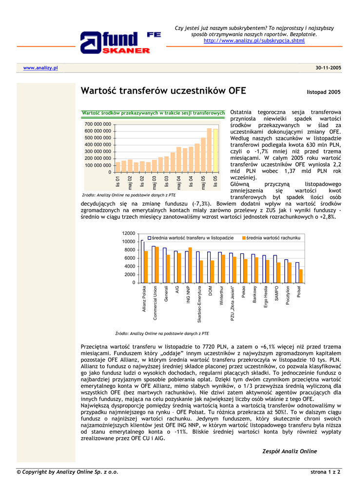 Czy jesteś już naszym subskrybentem? To najprostszy i najszybszy sposób otrzymywania naszych raportów. Bezpłatnie. http://www.analizy.pl/subskrypcja.shtml www.analizy.pl 30-11-2005 Wartość transferów uczestników OFE listopad 2005 Ostatnia tegoroczna sesja transferowa przyniosła niewielki spadek wartości 700 000 000 środków przekazywanych w ślad za 600 000 000 uczestnikami dokonującymi zmiany OFE. 500 000 000 Według naszych szacunków w listopadzie 400 000 000 transferowi podlegała kwota 630 mln PLN, 300 000 000 czyli o -1,7% mniej niż przed trzema miesiącami. W całym 2005 roku wartość 200 000 000 transferów uczestników OFE wyniosła 2,2 100 000 000 mld PLN wobec 1,37 mld PLN rok 0 wcześniej. Główną przyczyną listopadowego zmniejszenia się wartości kwot Źródło: Analizy Online na podstawie danych z PTE transferowych był spadek ilości osób decydujących się na zmianę funduszu (-7,3%). Bowiem dodatni wpływ na wartość środków zgromadzonych na emerytalnych kontach miały zarówno przelewy z ZUS jak i wyniki funduszy średnio w ciągu trzech miesięcy zanotowaliśmy wzrost wartości jednostek rozrachunkowych o +2,8%. 12000 lis 05 maj 05 lis 04 maj 04 lis 03 maj 03 lis 02 maj 02 lis 01 Wartość środków przekazywanych w trakcie sesji transferowych średnia wartość transferu w listopadzie 10000 średnia wartość rachunku 8000 6000 4000 2000 Polsat Pocztylion SAMPO Ergo Hestia Bankowy Pekao PZU „Złota Jesień" Winterthur DOM Skarbiec-Emerytura ING NNP AIG Generali Commercial Union Allianz Polska 0 Źródło: Analizy Online na podstawie danych z PTE Przeciętna wartość transferu w listopadzie to 7720 PLN, a zatem o +6,1% więcej niż przed trzema miesiącami. Funduszem który „oddaje” innym uczestników z najwyższym zgromadzonym kapitałem pozostaje OFE Allianz, w którym średnia wartość transferu przekroczyła w listopadzie 10 tys. PLN. Allianz to fundusz o najwyższej średniej składce płaconej przez uczestników, co pozwala klasyfikować go jako fundusz ludzi o wysokich dochodach, regularni płacących składki. To jednocześnie fundusz o najbardziej przyjaznym sposobie pobierania opłat. Dzięki tym dwóm czynnikom przeciętna wartość emerytalnego konta w OFE Allianz, mimo słabych wyników, o 1/3 przewyższa średnią wyliczoną dla wszystkich OFE (bez martwych rachunków). Nie dziwi zatem aktywność agentów pracujących dla innych funduszy, mająca na celu pozyskanie jak największej liczby osób właśnie z tego OFE. Największą dysproporcję pomiędzy średnią wartością konta a wartością transferów odnotowaliśmy w przypadku najmniejszego na rynku – OFE Polsat. Tu różnica przekracza aż 50%!. To w dalszym ciągu fundusz o najniższej wartości rachunku. Jedynym funduszem, który skutecznie chroni swoich najzamożniejszych klientów jest OFE ING NNP, w którym wartość listopadowego transferu była niższa od stanu emerytalnego konta o -11%. Bliskie średniej wartości konta były również wypłaty zrealizowane przez OFE CU i AIG. Zespół Analiz Online © Copyright by Analizy Online Sp. z o.o. strona 1 z 2 Czy jesteś już naszym subskrybentem? To najprostszy i najszybszy sposób otrzymywania naszych raportów. Bezpłatnie. http://www.analizy.pl/subskrypcja.shtml www.analizy.pl Wartość transferów członków OFE 30-11-2005 Spółka Analizy Online jest niezależną firmą analityczną zajmującą się monitoringiem rynku polskich i zagranicznych instytucji zbiorowego lokowania środków: funduszy inwestycyjnych, emerytalnych oraz ubezpieczeniowych funduszy kapitałowych). W zakres analiz rynku funduszy wchodzą między innymi rankingi funduszy, ocena efektywności działań zarządzających oraz analiza ich wpływu na polski rynek finansowy. Zakres działalności firmy obejmuje również monitoring zmian akcjonariatu polskich spółek publicznych oraz analizę rynku polskich papierów dłużnych. Niniejsze opracowanie zostało sporządzone wyłącznie w celu informacyjnym zgodnie z najlepszą wiedzą i starannością autorów. Dane wykorzystane przy tworzeniu opracowania pochodzą ze źródeł uważanych przez firmę Analizy Online Sp. z o.o. za wiarygodne i dokładne, lecz nie istnieje gwarancja, iż są one kompletne i odzwierciedlają stan faktyczny. Opinie zawarte w niniejszym opracowaniu częściowo bazują na wartościach szacunkowych, wyznaczanych zgodnie z metodologią stosowaną przez Analizy Online Sp. z o.o., które mogą odbiegać od danych rzeczywistych. Spółka Analizy Online Sp. z o.o. nie ponosi odpowiedzialności za ewentualne szkody spowodowane wykorzystaniem opinii i informacji zawartych w niniejszym opracowaniu. Niniejsze opracowanie jest przeznaczone do wyłącznego, własnego użytku Klientów spółki Analizy Online Sp. z o.o., którzy otrzymali je bezpośrednio od spółki Analizy Online Sp. z o.o. Publikowanie niniejszego opracowania w prasie, internecie i innych środkach masowego przekazu w całości bądź w części, jak również przytaczanie zawartych w nim opinii wymaga pisemnej zgody spółki Analizy Online Sp. z o.o. © Copyright by Analizy Online Sp. z o.o. strona 2 z 2