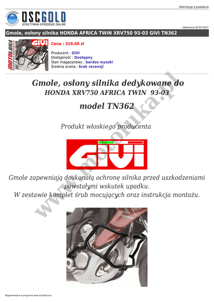 Informacje o produkcie Utworzono 03-03-2017 Gmole, osłony silnika HONDA AFRICA TWIN XRV750 93-03 GIVI TN362 Cena : 329,00 zł Producent : GIVI Dostępność : Dostępny Stan magazynowy : bardzo wysoki Średnia ocena : brak recenzji a. pl Gmole, osłony silnika dedykowane do HONDA XRV750 AFRICA TWIN 93-03 uk model TN362 .m ot ol Produkt włoskiego producenta w w w Gmole zapewniają doskonałą ochronę silnika przed uszkodzeniami powstałymi wskutek upadku. W zestawie komplet śrub mocujących oraz instrukcja montażu. Wygenerowano w programie www.oscGold.com w w w ot .m a. pl uk ol