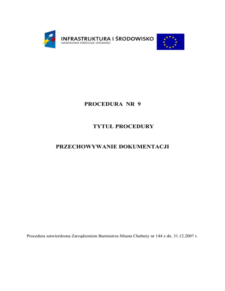 PROCEDURA NR 9 TYTUŁ PROCEDURY PRZECHOWYWANIE DOKUMENTACJI Procedura zatwierdzona Zarządzeniem Burmistrza Miasta ChełmŜy nr 144 z dn. 31.12.2007 r. 2 SPIS TREŚCI: 1. CEL I ZAKRES..................................................................................................................................................3 2. ODPOWIEDZIALNOŚĆ I PRZESTRZEGANIE..........................................................................................3 3. PROCEDURA PRZECHOWYWANIA PISM WCHODZĄCYCH I WYCHODZĄCYCH.....................3 4. PROCEDURA PRZECHOWYWANIA DOKUMENTACJI FINANSOWEJ............................................3 5. PROCEDURA PRZECHOWYWANIA DOKUMENTACJI PRZETARGOWEJ ORAZ ZAWARTYCH UMÓW.........................................................................................................................................4 5.1 PRZECHOWYWANIE DOKUMENTACJI PRZETARGOWEJ....................................................................................................4 5.2 PRZECHOWYWANIE ZAWARTYCH UMÓW...................................................................................................................4 6. OKRES PRZECHOWYWANIA DOKUMENTACJI....................................................................................5 7. DOKUMENTY POWIĄZANE I ZAŁĄCZNIKI............................................................................................5 8. ROZDZIELNIK.................................................................................................................................................5 3 1. Cel i zakres Celem procedury jest określenie zasad i trybu przechowywania dokumentacji związanej z realizacją Projektu „Budowa i modernizacja kanalizacji sanitarnej i deszczowej miasta ChełmŜy”. 2. Odpowiedzialność i przestrzeganie Procedura dotyczy Kierownika JRP, pracowników JRP, MAO oraz w zakresie dokumentacji finansowej Skarbnika Miasta oraz pracownika Wydziału Finasowo-Księgowego Urzędu Miasta ChełmŜy na stanowisku ds. rachunkowości i sprawozdawczości budŜetowej. Odpowiedzialność za prawidłowe stosowanie Procedury ponosi Kierownik JRP i MAO oraz w zakresie dokumentacji finansowej Skarbnik Miasta. 3. Procedura przechowywania pism wchodzących i wychodzących Oryginały pism wchodzących oraz kserokopia załączników jest przechowywana i archiwizowana przez pracownika Zespołu Organizacyjno-Prawnego w segregatorach w kolejności wpływu. Kserokopie pism wchodzących wraz oryginałami załączników są przechowywane i archiwizowane przez poszczególnych pracowników JRP, zgodnie z dekretacją Kierownika JRP. Oryginały pism wychodzących wraz z załącznikami są przechowywane i archiwizowane przez pracownika Zespołu Organizacyjno-Prawnego w segregatorach w kolejności ich wysłania wraz z potwierdzeniem odbioru dokumentu przez adresata (w przypadku wysłania dokumentu „za potwierdzeniem odbioru” lub odbioru osobistego). Kserokopie pism wychodzących wraz z załącznikami są przechowywane i archiwizowane przez pracowników sporządzających korespondencję. Dokumenty są przechowywane w opisanych segregatorach w sposób zapewniający zabezpieczenie przed dostępem osób trzecich, utratą, zniszczeniem oraz w sposób umoŜliwiający ich łatwe odszukanie. 4. Procedura przechowywania dokumentacji finansowej Oryginały dokumentów finansowych są przechowywane przez Zespół Finansowo-Księgowy JRP w osobnych teczkach w ustalonym porządku dostosowanym do sposobu prowadzenia ksiąg rachunkowych w podziale na miesiące w sposób pozwalający na ich odszukanie. Odpowiedzialność za prawidłową archiwizację oryginałów dokumentacji finansowej ponosi Kierownik JRP. Kopie dokumentów finansowych są przechowywane w Wydziale Finansowo-Księgowym Urzędu Miasta ChełmŜy w opisanych segregatorach w wydzielonych szafach w sposób 4 zapewniający zabezpieczenie przed utratą, zniszczeniem oraz w sposób umoŜliwiający ich łatwe odszukanie. Odpowiedzialność za prawidłową archiwizację kopii dokumentacji finansowej ponosi Skarbnik Miasta Chełmzy. Dokumenty finansowe przechowywane są przez JRP oraz Wydział Finansowo-Księgowy w segregatorach w podziale na wydatki kwalifikowane i niekwalifikowane. Raport z audytu finansowego oraz protokoły z kontroli finansowych przechowywane są w Wydziale Finansowo-Księgowym Urzędu Miasta. Dokumenty traktowane jako poufne powinny być dodatkowo zabezpieczone przed dostępem osób nieupowaŜnionych zgodnie z obowiązującymi w Urzędzie Miasta instrukcjami. Wydział Finansowo-Księgowy udostępnia kopie a JRP udostępnia oryginały dokumentacji finansowej Projektu zgodnie z Ustawą z dnia 6 września 2001r. o dostępie do informacji publicznej (Dz. U. z 2001 r., Nr 112, poz. 1198, ze zm.). 5. 5.1 Procedura przechowywania przetargowej oraz zawartych umów dokumentacji Przechowywanie dokumentacji przetargowej Pracownik Zespołu Technicznego jest odpowiedzialny za dokumentację związaną z przeprowadzanym zamówieniem. Przyjmowane lub przesyłane oferty Wykonawców w związku z uruchomionym postępowaniem będą rejestrowane w dzienniku korespondencji przychodzącej. Następnie zostaną ostemplowane i opatrzone adnotacją określającą dokładny termin wpłynięcia oferty (z podaniem daty, godziny i minuty). Pracownik Zespołu Technicznego sporządzi Rejestr przyjętych ofert, za którego prowadzenie odpowiedzialny jest Kierownik JRP. Zarejestrowane oferty do czasu ich otwarcia zostaną zabezpieczone w metalowej szafie zamykanej na klucz. W dniu otwarcia ofert a takŜe podczas posiedzeń KP pracownik Zespołu Technicznego przekazuje oferty odnoszące się do danego postępowania Przewodniczącemu Komisji. KaŜdorazowo po zakończeniu posiedzeń KP Przewodniczący zwraca pobrane oferty celem ich ponownego zabezpieczenia. Za udostępnianie dokumentacji związanej z prowadzonym postępowaniem odpowiada Przewodniczący KP. Po zakończeniu prowadzonego postępowania Przewodniczący KP