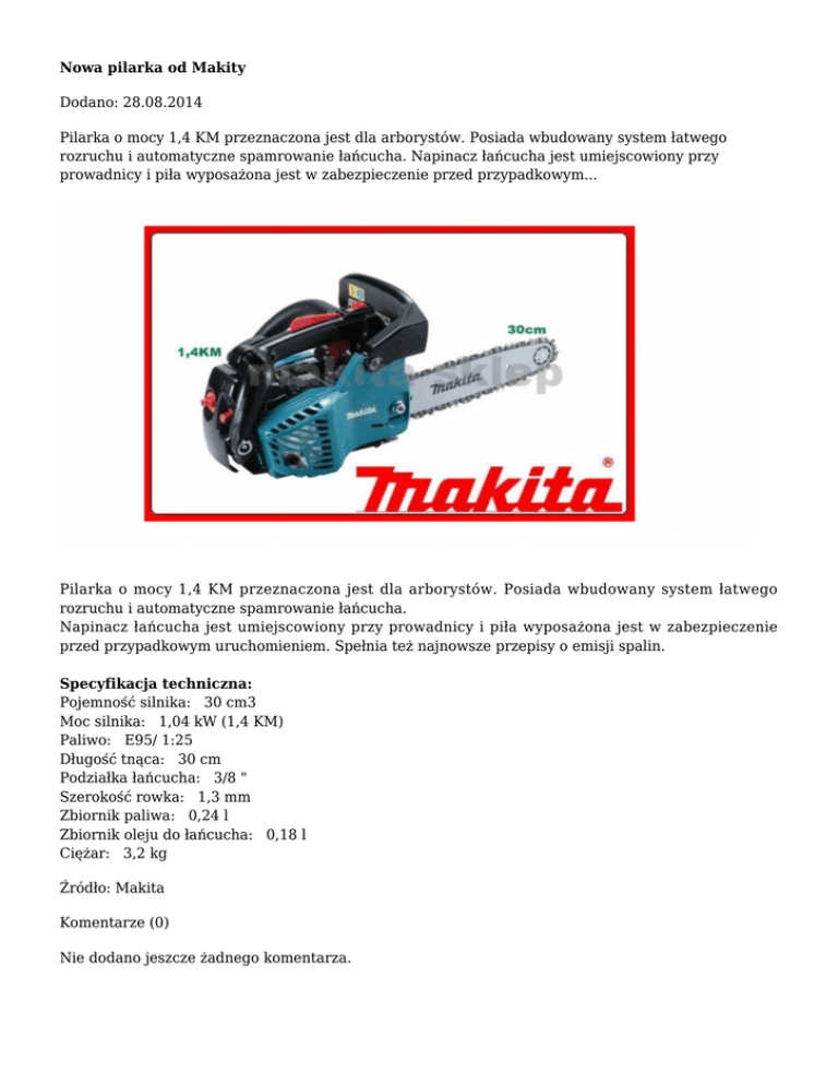 Nowa pilarka od Makity Dodano: 28.08.2014 Pilarka o mocy 1,4 KM przeznaczona jest dla arborystów. Posiada wbudowany system łatwego rozruchu i automatyczne spamrowanie łańcucha. Napinacz łańcucha jest umiejscowiony przy prowadnicy i piła wyposażona jest w zabezpieczenie przed przypadkowym... Pilarka o mocy 1,4 KM przeznaczona jest dla arborystów. Posiada wbudowany system łatwego rozruchu i automatyczne spamrowanie łańcucha. Napinacz łańcucha jest umiejscowiony przy prowadnicy i piła wyposażona jest w zabezpieczenie przed przypadkowym uruchomieniem. Spełnia też najnowsze przepisy o emisji spalin. Specyfikacja techniczna: Pojemność silnika: 30 cm3 Moc silnika: 1,04 kW (1,4 KM) Paliwo: E95/ 1:25 Długość tnąca: 30 cm Podziałka łańcucha: 3/8 " Szerokość rowka: 1,3 mm Zbiornik paliwa: 0,24 l Zbiornik oleju do łańcucha: 0,18 l Ciężar: 3,2 kg Źródło: Makita Komentarze (0) Nie dodano jeszcze żadnego komentarza.