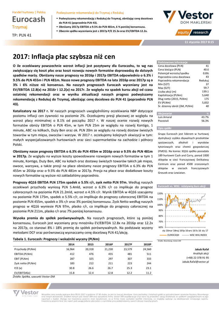 Handel hurtowy | Polska Eurocash Trzymaj Podwyższenie rekomendacji do Trzymaj z Redukuj Podwyższamy rekomendację z Redukuj do Trzymaj, obniżając cenę docelowa do PLN 41 (poprzednio PLN 43). Obniżamy 2017p EBITDA o 9.5% do PLN 481m, 6 % poniżej konsensusu. Obecnie spółka wyceniania jest z 2017p P/E 25.3x oraz EV/EBITDA 12.2x. TP: PLN 41 11 stycznia 2017 8:15 2017: Inflacja płac szybsza niż cen O ile oczekiwany powszechnie wzrost inflacji jest pozytywny dla Eurocashu, to wg nas zwiększający się koszt płac oraz koszt rozwoju nowych formatów doprowadzą do dalszych spadków marży. Obniżamy nasze prognozy na 2016p i 2017p EBITDA odpowiednio o 6.3% i 9.5% do PLN 455m i PLN 481m. Nasze nowe prognozy EBITDA na lata 2016p oraz 2017p są o 3% i 6% niższe niż konsensus. Na naszych prognozach Eurocash wyceniany jest na EV/EBITDA 12.8(x) na 2016r i 12.2(x) na 2017r. Ze względu na spadek kursu akcji od czasu ostatniej rekomendacji oraz w wyniku aktualizacji naszych prognoz podwyższamy rekomendację z Redukuj do Trzymaj, obniżając cenę docelowa do PLN 41 (poprzednio PLN 43). Katalizatory na 2017 r. W naszych prognozach uwzględniliśmy oczekiwania NBP dotyczące poziomu inflacji cen żywności na poziomie 2%. Oczekujemy presji płacowej ze względu na wzrost płacy minimalnej o 8.1% od początku 2017 r. W naszej ocenie rozwój nowych formatów obniży EBITDA o PLN 45m, w tym PLN 25m ze względu na rozwój Kontigo, 1 minute, ABC na kółkach, Duży Ben oraz ok. PLN 20m ze względu na rozwój dostaw świeżych towarów w tym mięsa, owoców i warzyw. W 2017 r. oczekujemy kolejnych akwizycji w tym: małych wyspecjalizowanych hurtowniach oraz sieci supermarketów na zachodzie i północy Polski. Obniżamy nasze prognozy EBITDA o 6.3% do PLN 455m w 2016p oraz o 9.5% do PLN 481m w 2017p. Ze względu na wyższe koszty spowodowane rozwojem nowych formatów w tym 1 minute, Kontigo, Duży Ben, ABC na kołach oraz dostawy świeżych towarów takich jak mięso, owoce, warzywa, a także presji na płace obniżamy nasze prognozy EBITDA o 6.3% do PLN 455m w 2016p oraz o 9.5% do PLN 481m w 2017p. Presja na płace oraz dodatkowe koszty nowych formatów są wyższe niż zakładaliśmy poprzednio. Prognozy 4Q16 EBITDA PLN 175m spadek o 5.5% r/r, zysk netto PLN 97m. Według naszych oczekiwań przychody wyniosą PLN 5.4mld, wzrost o 6.3% r/r co implikuje do prognoz całorocznych na poziomie PLN 21.2mld, wzrost o 4.5% r/r. Wynik EBITDA w 4Q16 szacujemy na poziomie PLN 175m, spadek o 5.5% r/r, co implikuje do prognozy całorocznej EBITDA na poziomie PLN 455m, spadek o 3% r/r oraz 3% poniżej konsensusu. Zysk Netto według naszych prognoz w 4Q16 wyniesie PLN 97m, płasko r/r, co implikuje do prognozy całorocznej na poziomie PLN 211m, płasko r/r oraz 7% poniżej konsensusu. Wysoka premia do spółek porównywalnych. Na naszych prognozach, które są poniżej konsensusu, Eurocash jest wyceniany przy mnożniku EV/EBITDA 12.8x na 2016p oraz 12.2x na 2017p, co stanowi 8% i 18% premię do spółek porównywalnych. Na podstawie wyceny metodami DCF oraz porównawczą wyznaczamy cenę docelową PLN 41/akcję. Tabela 1. Eurocash: Prognozy i wskaźniki wyceny (PLNm) Przychody (PLNm) Akcjonariat Luis Amaral Pozostali 41 40.6 0.8% 43 Redukuj 37 59.7 139.1 5,640 175 5,832 40 % 43.7% 56.3% Opis spółki Grupa Eurocash jest liderem w hurtowej dystrybucji szybko zbywalnych produktów spożywczych, alkoholi i wyrobów tytoniowych oraz chemii gospodarczej (FMCG). Na koniec 3Q16 spółka posiadała 189 hurtowni Cash and Carry, ponad 1000 sklepów w sieci franczyzowej Delikatesy Centrum oraz ponad 4500 zrzeszonych sklepów w sieciach franczyzowych Groszek oraz Lewiatan. Eurocash vs. WIG: relatywny kurs akcji 120% 110% 100% 90% 80% 70% 60% sty 16mar 16maj 16lip 16 wrz 16 lis 16 sty 17 EUROCASH WSE WIG INDEX Źródło: Bloomberg, Vestor DM 2014 2015 2016P 2017P 2018P 16,964 20,318 21,230 23,579 24,560 EBITDA (PLNm) 412 476 455 481 511 EBIT (PLNm) 287 325 297 307 333 Zysk netto (PLNm) 183 212 211 223 244 P/E (x) 30.8 26.6 26.7 25.3 23.1 15.8 12.4 12.8 12.2 11.2 EV/EBITDA(x) Źródło: Spółka, szacunki Vestor DM Podstawowe informacje Cena docelowa (PLN) Cena bieżąca (PLN) Potencjał wzrostu/spadku Poprzednia cena docelowa Poprzednia rekomendacja Min (52T) Max (52T) Liczba akcji (m) Kapitalizacja (PLNm) Dług netto (2015, PLNm) EV (PLNm) Śr. dzienny obrót (3M, PLNm) Jakub Rafał Analityk akcji (+48) 22 378 91 95 [email protected] Wszystkie ceny zostały pobrane dnia 09.01.2017 o godzinie 17:30 chyba, że jest to inaczej określone. Ceny pochodzą z lokalnych giełd za pośrednictwem serwisów Reutera, Bloomberga oraz innych dostawców. Źródłem danych jest Vestor DM oraz opisywane firmy. Vestor DM współpracuje oraz stara się prowadzić swoją działalność ze spółkami uwzględnionymi w jego raportach z badań. Dlatego też inwestorzy powinni mieć świadomość, że w firmie może zachodzić konflikt interesów, co mogłyby wpłynąć na obiektywność niniejszego raportu. Inwestorzy powinni brać ten raport pod uwagę jedynie jako jeden z czynników przy podejmowaniu swoich decyzji inwestycyjnych. Eurocash | Styczeń 2017 Zastrzeżenie odpowiedzialności ZASTRZEŻENIA PRAWNE Niniejszy materiał został przygotowany przez Vestor Dom Maklerski S.A. (“Vestor DM”) z siedzibą w Warszawie, ul. Mokotowska 1, 00-640 Warszawa, wpisaną do rejestru przedsiębiorców przez Sąd Rejonowy dla m. st. Warszawy w Warszawie XII Wydział Gospodarczy Krajowego Rejestru Sądowego pod numerem KRS 0000277384, NIP 1080003081, REGON 140943747, kapitał w wysokości 1.811.570 PLN, w całości wpłacony, podmiot podlegający przepisom Ustawy z dnia 29 lipca 2005 r. o obrocie instrumentami finansowymi (Dz.U. z 2014 r., poz. 94 – j.t. z późn. zm.), Ustawy z dnia 29 lipca 2005 r. o ofercie publicznej i warunkach wprowadzania instrumentów finansowych do zorganizowanego systemu obrotu oraz o spółkach publicznych (Dz.U. z 2013 r