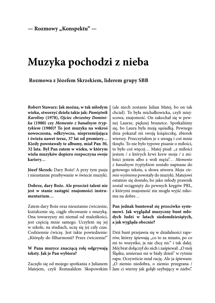 — Rozmowy „Konspektu” — Muzyka pochodzi z nieba Rozmowa z Józefem Skrzekiem, liderem grupy SBB Robert Stawarz: Jak można, w tak młodym wieku, stworzyć dzieła takie jak: Pamiętnik Karoliny (1978), Ojciec chrzestny Dominika (1980) czy Memento z banalnym tryptykiem (1980)? To jest muzyka na wskroś nowoczesna, odkrywcza, nieprzemijająca i świeża nawet teraz, 37 lat od premiery… Kiedy powstawały te albumy, miał Pan 30, 32 lata. Był Pan zatem w wieku, w którym wielu muzyków dopiero rozpoczyna swoje kariery… Józef Skrzek: Dary Boże! A przy tym pasja i nieustanne przebywanie w świecie muzyki. Dobrze, dary Boże. Ale przecież talent nie jest w stanie zastąpić znajomości instrumentarium… Zatem dary Boże oraz nieustanne ćwiczenie, kształcenie się, ciągłe obcowanie z muzyką. Ona towarzyszy mi niemal od maleńkości, jest częścią mnie samego. Uczyłem się jej w szkole, na studiach, uczę się jej cały czas. Codziennie ćwiczę. Jest takie powiedzenie: „Którędy do filharmonii? Przez ćwiczenia!” W Pana muzyce znaczącą rolę odgrywają teksty. Jak je Pan wybiera? Zaczęło się od mojego spotkania z Julianem Matejem, czyli Romualdem Skopowskim (ale niech zostanie Julian Matej, bo on tak chciał). To była michałkowicka, czyli miejscowa, znajomość. On zakochał się w pewnej Laurze, pięknej brunetce. Spotkaliśmy się, bo Laura była moją sąsiadką. Pewnego dnia pokazał mi swoją książeczkę, zbiorek wierszy. Przeczytałem je z uwagą i coś mnie tknęło. To nie było typowe pisanie o miłości, to było coś więcej… Matej pisał: „z miłości jestem / z których krwi krew moja / z miłości jestem albo z woli męża”… Memento z banalnym tryptykiem zostało napisane do gotowego tekstu, a słowa utworu Moja ziemio wyśniona powstały do muzyki. Matejowi ostatnio się dostało, bo jako młody prawnik został wciągnięty do pewnych kręgów PRL, z którymi znajomość nie mogła wyjść nikomu na dobre… Pan jednak buntował się przeciwko systemowi. Jak wyglądał muzyczny bunt młodych ludzi w latach siedemdziesiątych, a jak wygląda obecnie? Dziś bunt przejawia się w działalności raperów, którzy śpiewają „co to za miasto, po co mi to wszystko, ja nie chcę nic” i tak dalej. Mój brat dołączył do nich i zaśpiewał: „O mój Śląsku, umierasz mi w biały dzień” w rytmie rapu. Oczywiście miał rację. Ale ja śpiewam: „O ziemio niedobra, o ziemio przegrana / Jam ci wierny jak gołąb szybujący w niebo”. „Konspekt” 2/2015 (55) — Rozmowy „Konspektu” — 31 Robert Stawarz i Marcin Kania z Józefem Skrzekiem, budynek Narodowej Orkiestry Symfonicznej Polskiego Radia w Katowicach, lipiec 2015 r. To tekst napisany przez moją żonę Alinę. Jest romantyczny, sentymentalny, bo kobiety takie bywają i wtedy są nasze. Śląsk jeszcze w czasach mojego dzieciństwa był mocarstwem. Wojewodą był Jerzy Ziętek, powstał Stadion Śląski, park Śląski, gruby szły, orkiestry grały, to był fason! Żyliśmy w tyglu, który się nazywał PRL. I w tym czasie zaczęło się rodzić coś, co znakomicie wyraża tekst Marka Milika Freedom with Us: „I, I love freedom / You, you love freedom / Everyone, Everyone should love freedom”. Bo bez wolności nic nie może istnieć. Utwór Freedom był tak nośny, mocny, przenikliwy, że gdziekolwiek go graliśmy – czy w ozdobionej czerwonymi gwiazdami Czechosłowacji, czy w NRD – zawsze czuliśmy łączność ze słuchaczami. Na koncercie w NRD podchodzili do nas żołnierze niemieccy i mówili: „Solidarität ist gut”, ale wypowiadali to po cichu, bo bali się obecnych w tłumie tajnych służb… W tym czasie SBB wychodziło na scenę z mocą. Nie bali- śmy się. Dlatego też mieliśmy zakaz wjazdu do ZSRR. Nie mogliśmy w ogóle jeździć na Wschód, bo byliśmy za bardzo znani i poważani w świecie „zgniłego kapitalizmu”. Co ciekawe jednak, z ZSRR dostawaliśmy od słuchaczy wiele listów. Nasza muzyka docierała tam za pośrednictwem fal radiowych oraz przemycanych płyt. W roku 1978 SBB dało niezapomniany koncert w Roskilde w Danii… Tak! Jest 2 lipca 1978 r., obchodzę trzydzieste urodziny. Zapowiedziano, że gramy na jednej scenie z Bobem Marleyem, królem reggae. Żeby tam się dostać, musiałem przemycić naszego Greka Apostolisa Anthimosa. Wziąłem paszport technicznego i w ten sposób wjechaliśmy do Danii. Zagraliśmy koncert po Marleyu. Ktoś mu powiedział, że mam urodziny, zatem zaśpiewał Happy Birthday, po czym podał mi jakąś faję… 32 — Rozmowy „Konspektu” — „Konspekt” 2/2015 (55) W imponującej sali koncertowej NOSPR Sztachnąłem się, stanąłem jak wryty. Mówię: „Dajcie mi coś do picia, bo chyba tu padnę”. Koledzy cucili mnie colą… Potem zagraliśmy na sprzęcie Rolling Stonesów. To był europejski Woodstock, wielkie wydarzenie. Ekipa Boba Marleya próbowała nam zabrać polymooga, bo nie mogli uwierzyć, że muzycy zza żelaznej kurtyny mogą mieć taki sprzęt. Jaka była Pana droga do kariery? Wychowałem się w typowym śląskim domu, w rodzinie górniczej, gdzie ojciec robił na grubie, mama zaś zajmowała się domem. Ukończyłem Średnią Szkołę Muzyczną im. Mieczysława Karłowicza w Katowicach. Gdy umarł ojciec, byłem na drugim roku studiów w katowickiej Akademii Muzycznej. W domu bieda. Wtedy przyjąłem propozycję Tadeusza Nalepy i zacząłem grać z zespołem Breakout. Myślałem, że wystarczy na to urlop dziekański, ale los inaczej zadysponował moim talentem… Jestem zatem po drugim roku Akademii i nagle wchodzę na zawodową scenę muzyczną właśnie z Breakoutem. Nagrywamy album 70a (1970). Po czym schodzę do piwnicy i zaczynam grać z nieznanym wówczas zespołem Silesian Blues Band. Nie wracam już na studia, bo czuję, że mogę zrobić coś innego, nowego. Coś, o czym nie usłyszę w Akademii ani w innej szkole. Poznaję znakomitego gitarzystę Apostolisa Anthim