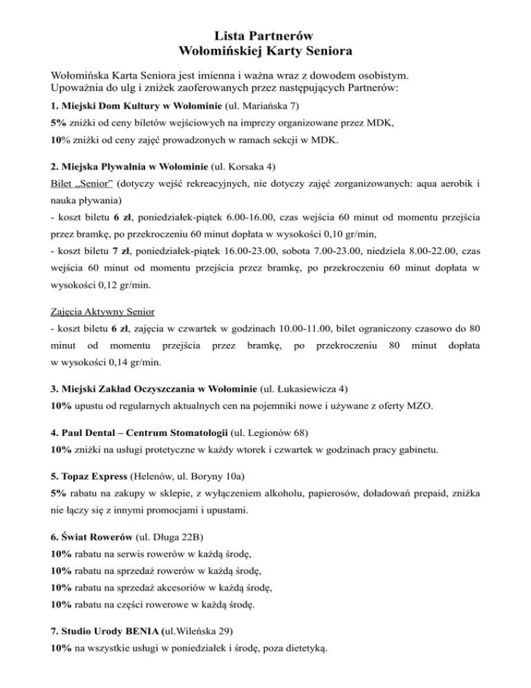 Lista Partnerów Wołomińskiej Karty Seniora Wołomińska Karta Seniora jest imienna i ważna wraz z dowodem osobistym. Upoważnia do ulg i zniżek zaoferowanych przez następujących Partnerów: 1. Miejski Dom Kultury w Wołominie (ul. Mariańska 7) 5% zniżki od ceny biletów wejściowych na imprezy organizowane przez MDK, 10% zniżki od ceny zajęć prowadzonych w ramach sekcji w MDK. 2. Miejska Pływalnia w Wołominie (ul. Korsaka 4) Bilet „Senior” (dotyczy wejść rekreacyjnych, nie dotyczy zajęć zorganizowanych: aqua aerobik i nauka pływania) - koszt biletu 6 zł, poniedziałek-piątek 6.00-16.00, czas wejścia 60 minut od momentu przejścia przez bramkę, po przekroczeniu 60 minut dopłata w wysokości 0,10 gr/min, - koszt biletu 7 zł, poniedziałek-piątek 16.00-23.00, sobota 7.00-23.00, niedziela 8.00-22.00, czas wejścia 60 minut od momentu przejścia przez bramkę, po przekroczeniu 60 minut dopłata w wysokości 0,12 gr/min. Zajęcia Aktywny Senior - koszt biletu 6 zł, zajęcia w czwartek w godzinach 10.00-11.00, bilet ograniczony czasowo do 80 minut od momentu przejścia przez bramkę, po przekroczeniu 80 minut dopłata w wysokości 0,14 gr/min. 3. Miejski Zakład Oczyszczania w Wołominie (ul. Łukasiewicza 4) 10% upustu od regularnych aktualnych cen na pojemniki nowe i używane z oferty MZO. 4. Paul Dental – Centrum Stomatologii (ul. Legionów 68) 10% zniżki na usługi protetyczne w każdy wtorek i czwartek w godzinach pracy gabinetu. 5. Topaz Express (Helenów, ul. Boryny 10a) 5% rabatu na zakupy w sklepie, z wyłączeniem alkoholu, papierosów, doładowań prepaid, zniżka nie łączy się z innymi promocjami i upustami. 6. Świat Rowerów (ul. Długa 22B) 10% rabatu na serwis rowerów w każdą środę, 10% rabatu na sprzedaż rowerów w każdą środę, 10% rabatu na sprzedaż akcesoriów w każdą środę, 10% rabatu na części rowerowe w każdą środę. 7. Studio Urody BENIA (ul.Wileńska 29) 10% na wszystkie usługi w poniedziałek i środę, poza dietetyką. 8. Restauracja Pobite Talerze (ul. Warszawska 21) 1 zł za dowolną kawę od poniedziałku do piątku, 10% rabatu na całe menu od poniedziałku do piątku. 9. Szkółka Pływacka SPLASH (tel. 726 306 606) 10% na zajęcia ruchowe w wodzie bez ograniczeń co do ilości i terminu zajęć. 10. Europejska Grupa Medyczna Spółka z o.o. Firma działa na terenie całej Polski i jest liderem w organizacji leczenia zaćmy za granicą wraz z refundacją NFZ. Najbliższa placówka w Warszawie przy ul. Domaniewskiej 47/10, tel. 22 290 61 61. 10% rabatu dla pakietów z finansowaniem: Podstawowego, Błękitnego oraz Srebrnego, 5% rabatu dla pakietów z finansowaniem: Srebrnego Plus oraz Złotego, 10% rabatu dla pakietów bez finansowania: Podstawowego, Błękitnego oraz Srebrnego, 5% rabatu dla pakietów z finansowaniem: Srebrnego Plus oraz Złotego. 11. Fenix Medical Fitness (ul. Przeskok 2) 10% zniżki na wszystkie usługi z wyjątkiem rehabilitacji oraz towarów sprzedawanych w recepcji. 12. Prywatny Gabinet Ortoptyczny, Optyk s.c. (ul. Wileńska 29 i Kościelna 6) 99 zł za okulary korekcyjne + badanie wzroku od poniedziałku do piątku w godzinach 10.00-18.00. 13. Caffe Carino (ul. Długa 39) 10% na cały asortyment poza alkoholem oraz okazjonalnymi tortami na zamówienie. 14. Brafitteria. Bielizna Wołomin (ul. Kościelna 9) 10% zniżki na cały asortyment. 15. PARAFARMACJA Sklep zielarsko-medyczny (ul. Legionów 34) 10% zniżki na cały asortyment oprócz artykułów dziecięcych w poniedziałki, wtorki i środy. 16. LIFE FIT STUDIO Beata Orłowska (ul. Mickiewicza 9) 20% zniżki na wejście jednorazowe na zajęcia fitness (zdrowy kręgosłup, pilates, joga), od poniedziałku do piątku 10% zniżki na karnet