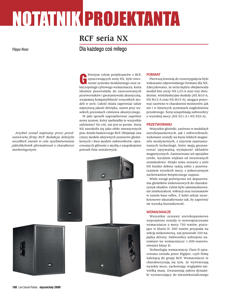NOTATNIK PROJEKTANTA RCF seria NX Filippo Rossi Dla każdego coś miłego Artykuł został napisany przez przedstawiciela firmy RCF. Redakcja dołożyła wszelkich starań w celu wyeliminowania jakichkolwiek sformułowań o charakterze marketingowym. łównym celem projektantów z RCF, opracowujących serię NX, było stworzenie systemu modularnego oraz takiej topologii cyfrowego wzmacniacza, która idealnie pasowałaby do zastosowanych przetworników i gwarantowała akustyczną, wzajemną kompatybilność wszystkich modeli w serii. Całość miała zapewniać także najwyższą jakość dźwięku, nawet przy wysokich poziomach ciśnienia akustycznego. W jaki sposób zaprojektować zupełnie nowy system, który spełniałby te wszystkie założenia? No cóż, nie jest to proste. Seria NX narodziła się jako efekt intensywnych prac działu badawczego RCF. Obejmuje ona cztery modele aktywnych zestawów głośnikowych i dwa modele subwooferów, opracowanych głównie z myślą o zaspokojeniu potrzeb firm rentalowych. G FORMAT Pierwszą kwestią do rozstrzygnięcia było wskazanie odpowiedniego formatu dla NX. Zdecydowano, że seria będzie obejmowała moduł line array NX L23-A oraz trzy dwudrożne, wielofunkcyjne moduły (NX M10-A, NX M12-A oraz NX M15-A), mogące pracować zarówno w charakterze monitorów, jak też i w liniowych systemach nagłośnienia przodowego. Serię uzupełniają subwoofery o wysokiej mocy (NX S21-A i NX S25-A). PRZETWORNIKI Wszystkie głośniki, zarówno w modułach szerokopasmowych, jak i subwooferach, wykonane zostały na bazie lekkich magnesów neodymowych, z użyciem zaawansowanych technologii, które mają gwarantować optymalną wydajność układów magnetycznych. Zastosowano też specjalne cewki, wyraźnie większe od stosowanych standardowo. Dzięki temu zestawy z serii NX bardzo dobrze radzą sobie z przetwarzaniem wysokich mocy, z jednoczesnym zachowaniem bezpiecznego zapasu. Wiele uwagi poświęcono też dopasowaniu głośników niskotonowych do charakterystyk obudów. Celem było zminimalizowanie zniekształceń, wibracji oraz rezonansów w tunelu bass reflex. Z kolei sekcje wysokotonowe ukształtowano tak, by zapewnić im wysoką kierunkowość. WZMACNIACZE Wszystkie zestawy szerokopasmowe wyposażone zostały w nowoopracowane wzmacniacze o mocy 750 watów, pracujące w klasie D. 500 watów przypada na sekcję niskotonową, zaś pozostałe 250 napędza drivery. Subwoofery uzbrojono natomiast we wzmacniacze 1.000-watowe, również klasy D. Technologia wzmacniaczy Class D opracowana została przez Digipro, czyli firmę należącą do grupy RCF. Wzmacniacze te charakteryzują się tym, że wytwarzają wysokie moce, zachowując względnie niewielką masę. Gwarantują zakres dynamiki wystarczający do niezniekształconego 100 Live Sound Polska styczeń/luty 2009 przetwarzania sygnału wejściowego, z odpowiednio dużym zapasem. Wzmacniacze Digipro działają w oparciu o zasadę modulacji szerokości impulsu (ang. Pulse Width Modulation – PWM). Ma ona tę zaletę, że pozwala wzmacniaczowi na efektywne wykorzystanie aż 90% dostarczanej energii. Ponieważ zaledwie 10 jej procent zamienia się w ciepło, toteż wnętrze wzmacniacza pozostaje stosunkowo chłodne. Jednak na wszelki wypadek wzmacniacze w modułach NX wyposażono w radiatory. Z kolei zastosowane zasilacze impulsowe sprawiają, że moduły NX można zasilić z dowolnej sieci, niezależnie od miejsca na świecie, w którym systemowi przyjdzie grać. To tyle, jeśli chodzi o ogólną charakterystykę systemu NX. Przejdźmy do zaznajomienia się z poszczególnymi elementami. MODUŁ LINIOWY NX L23-A Sekcja wysokotonowa tego modułu składa się z trzech driverów ciśnieniowych RCF Precision ND350. Są to, jak wspominałem, drivery z magnesami neodymowymi i membranami o średnicy 1,75 cala, wykonanymi z poliestru. Uzwojenie cewki tworzy drut miedziany o prostokątnym przekroju. Karkas zaś wykonany jest z odpornego na wysokie temperatury tworzywa, zwanego Kapton, a stworzonego w laboratoriach DuPont. Wylot każdego drivera ma średnicę 1 cala. Wszystkie trzy drivery osadzone są w jednej, nowozaprojektowanej tubie. Standardowa impedancja ND350 wynosi 8 omów. Jednak na potrzeby serii NX opracowano wersję 12-omową, co miało na celu zoptymalizowanie interakcji driverów ze wzmacniaczem. Tym samym zresztą celem kierowano się podczas opracowywania specjalnego wariantu 12-calowego głośnika niskotonowego LF 12N351. Innym priorytetem, przyjętym podczas opracowywania woofera, było zapewnienie liniowości odpowiedzi częstotliwościowej głośnika, przy minimalnych zniekształceniach. Unikalny, bardzo efektywny system wentylowania, zastosowany w LF 12N351, pozwala znacząco zredukować zjawisko kompresji mocy i pozwala głośnikowi na jej przetwarzanie z wysokim poziomem. Przed wooferem umieszczony został stały korektor fazy, który zapewnia czystość przetwarzania w środkowym zakresie częstotliwości, a także koherencję modułów ustawianych równolegle, jeden obok drugiego. Podobnie, jak inne modele z serii NX, tak i NX L23-A ma na pokładzie wzmacniacz Digipro 750. Na płytce złącz wejściowych znaleźć można przełączniki konfiguracyjne. Pierwszy z nich, Line/Array HF, zmienia charakterystykę korekcji sygnału ze zwykłej Drivery ciśnieniowe modułu liniowego NX L23-A. Modułu NX L23-A widziany od tyłu oraz ten sam moduł z wyciągniętym panelem tylnym, zawierającym wzmacniacz mocy pracujący w klasie D. NX M-12A zaprojektowano przede wszystkim jako monitor podłogowy, ale z możliwością użycia go do zbudowania niewielkiego systemu nagłośnieniowego. styczeń/luty 2009 Live Sound Polska 101 NOTATNIK PROJEKTANTA Głośniki LF21N451 o średnicy 21 cali, wykorzystywane w subwooferach NX S21-A. Zestaw 2 x NX S21-A plus 2 x NX L23-A. liniowej na odpowiednią dla systemu wyrównanego liniowo. Kolejne dwa przełączniki, czyli Cluster Size, umożliwiają wybór czterech różn
