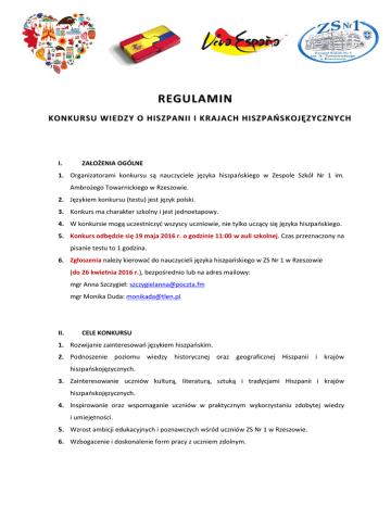 REGULAMIN KONKURSU WIEDZY O HISZPANII I KRAJACH HISZPAŃSKOJĘZYCZNYCH I. ZAŁOŻENIA OGÓLNE 1. Organizatorami konkursu są nauczyciele języka hiszpańskiego w Zespole Szkół Nr 1 im. Ambrożego Towarnickiego w Rzeszowie. 2. Językiem konkursu (testu) jest język polski. 3. Konkurs ma charakter szkolny i jest jednoetapowy. 4. W konkursie mogą uczestniczyć wszyscy uczniowie, nie tylko uczący się języka hiszpańskiego. 5. Konkurs odbędzie się 19 maja 2016 r. o godzinie 11:00 w auli szkolnej. Czas przeznaczony na pisanie testu to 1 godzina. 6. Zgłoszenia należy kierować do nauczycieli języka hiszpańskiego w ZS Nr 1 w Rzeszowie (do 26 kwietnia 2016 r.), bezpośrednio lub na adres mailowy: mgr Anna Szczygieł: [email protected] mgr Monika Duda: [email protected] II. CELE KONKURSU 1. Rozwijanie zainteresowań językiem hiszpańskim. 2. Podnoszenie poziomu wiedzy historycznej oraz geograficznej Hiszpanii i krajów hiszpańskojęzycznych. 3. Zainteresowanie uczniów kulturą, literaturą, sztuką i tradycjami Hiszpanii i krajów hiszpańskojęzycznych. 4. Inspirowanie oraz wspomaganie uczniów w praktycznym wykorzystaniu zdobytej wiedzy i umiejętności. 5. Wzrost ambicji edukacyjnych i poznawczych wśród uczniów ZS Nr 1 w Rzeszowie. 6. Wzbogacenie i doskonalenie form pracy z uczniem zdolnym. III. ZAKRES WIEDZY I UMIEJĘTNOŚCI 1. W roku szkolnym 2015/2016 konkurs obejmuje zakres zagadnień związany z historią, geografią i kulturą Hiszpanii oraz Kolumbii, a także podstawowe zagadnienia związane z pozostałymi krajami hiszpańskojęzycznymi. 2. Uczniowie przygotowują się do konkursu samodzielnie. 3. Konkurs ma charakter testowy (pytania zamknięte i otwarte – krótkiej odpowiedzi). TEMATYKA ZAGADNIEŃ HISZPANIA / KOLUMBIA geografia: położenie, państwa sąsiedzkie, powierzchnia, liczba ludności, wyspy, morza, oceany, góry, najdłuższe rzeki, klimat, fauna i flora, bogactwa naturalne, największe miasta (nazwy, z czego słyną) Hiszpania: podział na wspólnoty autonomiczne (stolice wspólnot), prowincje Kolumbia: podział na departamenty, gminy, corregimientos historia: najważniejsze daty i postacie historyczne, podróżnicy, konkwista Hiszpania: La Guerra Civil Española Kolumbia: La Violencia ustrój, polityka: władze, ustrój polityczny, flaga, herb, hymn, stolica, symbole, języki urzędowe literatura: najważniejsi pisarze i poeci (nazwiska, dzieła) znajomość książek: Hiszpania: „Don Quijote” („Don Kichot”) Miguel de Cervantes Kolumbia: „Cien años de soledad” („Sto lat samotności”) Gabriel García Márquez kultura: muzyka, taniec, sztuka (malarstwo, architektura), kino (reżyserzy), kuchnia (potrawy), święta i tradycje sport: kluby piłkarskie, znani piłkarze POZOSTAŁE KRAJE HISZPAŃSKOJĘZYCZNE IV. stolice NAGRODY 1. Wszyscy uczestnicy konkursu otrzymają pamiątkowe dyplomy. 2. Zwycięzcy konkursu (trzy najlepsze osoby) otrzymają atrakcyjne nagrody rzeczowe. V. DODATKOWE INFORMACJE 1. Podczas konkursu nie można korzystać z żadnych pomocy dydaktycznych (np. atlasy, podręczniki itp.), a także z telefonów komórkowych oraz innych urządzeń elektronicznych.