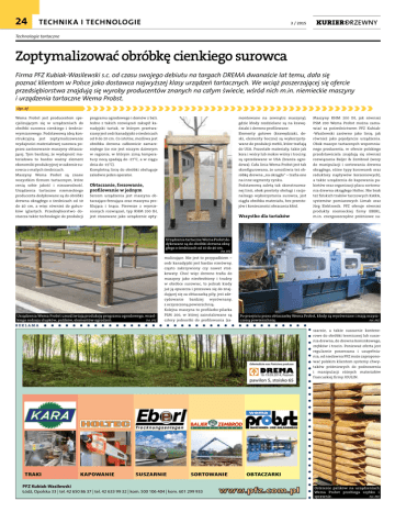24 TECHNIKA I TECHNOLOGIE 3 / 2015 Technologie tartaczne Zoptymalizować obróbkę cienkiego surowca Firma PFZ Kubiak-Wasilewski s.c. od czasu swojego debiutu na targach DREMA dwanaście lat temu, dała się poznać klientom w Polsce jako dostawca najwyższej klasy urządzeń tartacznych. We wciąż poszerzającej się ofercie przedsiębiorstwa znajdują się wyroby producentów znanych na całym świecie, wśród nich m.in. niemieckie maszyny i urządzenia tartaczne Wema Probst. Opr. bf Wema Probst jest producentem specjalizującym się w urządzeniach do obróbki surowca cienkiego i średniowymiarowego. Podstawową ideą konstrukcyjną jest zoptymalizowanie wydajności materiałowej surowca poprzez zastosowanie maszyny obtaczającej. Tym bardziej, że wydajność materiałowa to bardzo ważny element ekonomiki produkcyjnej w zakresie surowca o małych średnicach. Maszyny Wema Probst są znane wszystkim firmom tartacznym, które cenią sobie jakość i niezawodność. Urządzenia tartaczne niemieckiego producenta dedykowane są do obróbki drewna okrągłego o średnicach od 10 do 40 cm, a więc również do gatunków iglastych. Przedsiębiorstwo dostarcza także technologie do produkcji programu ogrodowego i domów z bali. Jedno z takich rozwiązań zakupił kanadyjski tartak, w którym przetwarzany jest cedr kanadyjski o średnicach od 8 do 20 cm. Co istotne, możliwa jest obróbka drewna całkowicie zamarzniętego (co nie jest niczym dziwnym w regionie, w którym zimą temperatury nocą spadają do -27°C, a w ciągu dnia do -15°C). Kompletną linię do obróbki obsługuje zaledwie jeden operator. montowane na zewnątrz maszyny), gdzie kłody rozdzielane są na krawędziaki i drewno profilowane. Elementy gotowe (krawędziaki, deski, elementy boczne) są wykorzystywane do produkcji mebli, które trafiają do USA. Pozostałe materiały, takie jak kora i wióry lub mokre wióry i trociny, są sprzedawane w USA (branża ogrodowa). Cała linia Wema Probst jest tak skonfigurowana, że umożliwia też obróbkę drewna „na okrągło” – trafia ono na inne segmenty rynku. Podstawową zaletą tak skonstruowanej linii, obok prostoty obsługi i racjonalnego wykorzystania surowca, jest ciągła obróbka materiału, bez przestojów i konieczności obracania kłód. Obtaczanie, frezowanie, profilowanie w jednym Sercem urządzenia jest maszyna obtaczająco-frezująca oraz maszyna profilująca i tnąca. Pierwsze z wymienionych rozwiązań, typ RHM 200 IH, jest stosowane jako urządzenie opty- Wszystko dla tartaków Maszyny RHM 200 IH, jak również PSM 200 Wema Probst można zamawiać za pośrednictwem PFZ Kubiak-Wasilewski zarówno jako linię, jak również jako pojedyncze urządzenia. Obok maszyn tartacznych wspomnianego producenta, w ofercie polskiego przedstawiciela znajdują się również rozwiązania Baljer & Zembrod (wozy do manipulacji i sortowania drewna okrągłego, różne typy korowarek oraz reduktory napływów korzeniowych), a także urządzenia do kapowania pakietów oraz organizacji placu sortowania drewna okrągłego Holtec. Nie brak też fińskich traków tarczowych KARA, systemów pomiarowych Limab oraz Jörg Elektronik. PFZ oferuje również produkty niemieckiej firmy EBERL, m.in. energooszczędne próżniowe su- Urządzenia tartaczne Wema Probst dedykowane są do obróbki drewna okrągłego o średnicach od 10 do 40 cm. Fot. PFZ Urządzenia Wema Probst umożliwiają produkcję programu ogrodowego, wszelkiego rodzaju słupków, palików, elementów ogrodzeń. Fot. PFZ malizujące. Nie jest to przypadkiem – cedr kanadyjski jest bardzo nierówny, często zakrzywiony czy nawet stożkowaty. Choć więc drewno trafia do maszyny jako nieobrobiony i trudny w obróbce surowiec, to jednak kiedy już ją opuszcza i przesuwa się do znajdującej się za obtaczarką piły, jest zdecydowanie bardziej wyrównany, z oczyszczoną powierzchnią. Kolejna maszyna to profilarko-pilarka PSM 200, w której zainstalowane są cztery jednostki do profilowania (za- Po przejściu przez obtaczarkę Wema Probst, kłody są wyrównane i mają oczyszczoną powierzchnię. Fot. PFZ REKLAMA Odwiedźcie nas Państwo podczas 16-19.09.2014, Poznań pawilon 5, stoisko 65 TRAKI KAPOWANIE SUSZARNIE SORTOWANIE PFZ Kubiak-Wasilewski Łódź, Opolska 33 | tel. 42 650 86 37 | tel. 42 633 99 32 | kom. 500 106 404 | kom. 601 299 933 szarnie, a także suszarnie kontenerowe do obróbki termicznej lub suszenia drewna, do drewna kominkowego, zrębków i trocin. Ponieważ oferta jest regularnie poszerzana i uzupełniania, od niedawna PFZ może zaproponować polskim klientom systemy chwytaków próżniowych do podnoszenia i manipulacji różnych materiałów francuskiej firmy JOULIN. OBTACZARKI www.pfz.com.pl Ostrzenie palików na urządzeniach Wema Probst przebiega szybko i Fot. PFZ sprawnie.