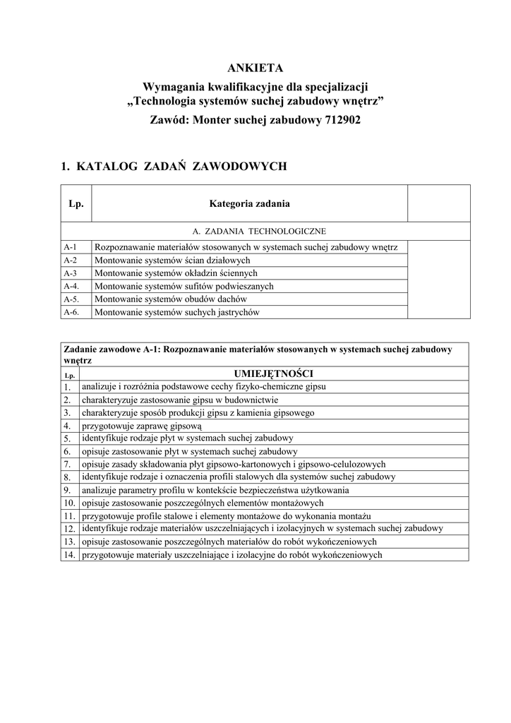ANKIETA Wymagania kwalifikacyjne dla specjalizacji „Technologia systemów suchej zabudowy wnętrz” Zawód: Monter suchej zabudowy 712902 1. KATALOG ZADAŃ ZAWODOWYCH Lp. Kategoria zadania A. ZADANIA TECHNOLOGICZNE A-1 A-2 A-3 A-4. A-5. A-6. Rozpoznawanie materiałów stosowanych w systemach suchej zabudowy wnętrz Montowanie systemów ścian działowych Montowanie systemów okładzin ściennych Montowanie systemów sufitów podwieszanych Montowanie systemów obudów dachów Montowanie systemów suchych jastrychów Zadanie zawodowe A-1: Rozpoznawanie materiałów stosowanych w systemach suchej zabudowy wnętrz Lp. 1. 2. 3. 4. 5. 6. 7. 8. 9. 10. 11. 12. 13. 14. UMIEJĘTNOŚCI analizuje i rozróżnia podstawowe cechy fizyko-chemiczne gipsu charakteryzuje zastosowanie gipsu w budownictwie charakteryzuje sposób produkcji gipsu z kamienia gipsowego przygotowuje zaprawę gipsową identyfikuje rodzaje płyt w systemach suchej zabudowy opisuje zastosowanie płyt w systemach suchej zabudowy opisuje zasady składowania płyt gipsowo-kartonowych i gipsowo-celulozowych identyfikuje rodzaje i oznaczenia profili stalowych dla systemów suchej zabudowy analizuje parametry profilu w kontekście bezpieczeństwa użytkowania opisuje zastosowanie poszczególnych elementów montażowych przygotowuje profile stalowe i elementy montażowe do wykonania montażu identyfikuje rodzaje materiałów uszczelniających i izolacyjnych w systemach suchej zabudowy opisuje zastosowanie poszczególnych materiałów do robót wykończeniowych przygotowuje materiały uszczelniające i izolacyjne do robót wykończeniowych Zadanie zawodowe A-2: Montowanie systemów ścian działowych Lp. 1. 2. 3. 4. 5. 6. 7. 8. 9. 10. 11. 12. 13. 14. 15. 16. 17. 18. UMIEJĘTNOŚCI rozróżnia rodzaje ścian działowych z płyt gipsowo-kartonowych rozróżnia podstawowe elementy konstrukcyjne ścian działowych identyfikuje rodzaje profili stalowych do wznoszenia konstrukcji ściany charakteryzuje płyty gipsowo-kartonowe ze względu na pożądane cechy ściany identyfikuje rodzaje materiału izolacyjnego wykorzystywanego w suchej zabudowie opisuje podstawowe etapy montażu ścian działowych rozróżnia rodzaje profili używanych do wykonywania otworów drzwiowych określa rozstaw wkrętów mocujących płyty w ścianie z jednowarstwowym poszyciem określa rozstaw wkrętów mocujących płyty każdej z warstw w poszyciu dwuwarstwowym dobiera rodzaj płyt gipsowo-kartonowych stosowanych w pomieszczeniach o podwyższonej wilgotności opisuje sposób gięcia płyty do montażu ściany łukowej opisuje zasady montażu płyt gipsowo-kartonowych opisuje etapy spoinowania płyt gipsowo-kartonowych charakteryzuje etapy montażu narożników wykonuje spoinowanie fragmentu ściany działowej wykonanej z płyt gipsowo-kartonowych identyfikuje rodzaje taśm zbrojących opisuje cechy podstawowych poziomów szpachlowania wykonuje obróbkę dowolnego naroża ścianki działowej Zadanie zawodowe A-3: Montowanie systemów okładzin ściennych Lp. 1. 2. 3. 4. 5. 6. 7. 8. 9. 10. 11. 12. 13. 14. 15. 16. 17. 18. 19. 20. UMIEJĘTNOŚCI rozróżnia rodzaje okładzin ściennych rozróżnia podstawowe elementy konstrukcyjne okładziny ściennej montowanej na profilach rozróżnia rodzaje profili stalowych do wznoszenia konstrukcji przedścianki charakteryzuje zalety okładzin ściennych rozróżnia materiał izolacyjny wykorzystywany w przedściankach i okładzinach ściennych dobiera system okładziny ściennej do montowanych płyt gipsowo-kartonowych opisuje etapy montażu suchego tynku rozróżnia rodzaje profili używanych do wykonywania okładziny ściennej określa rozstaw wkrętów mocujących płyty w ścianie z jednowarstwowym poszyciem określa rozstaw wkrętów mocujących płyty każdej z warstw w poszyciu dwuwarstwowym dobiera rodzaj płyty gipsowo-kartonowej stosowanej w pomieszczeniach o podwyższonej wilgotności opisuje zasady montażu płyt gipsowo-kartonowych wyznacza położenie suchego tynku na podstawie dokumentacji projektowej wykonuje montaż okładziny ściennej opisuje cechy podstawowych poziomów szpachlowania rozróżnia poziomy szpachlowania charakteryzuje etapy montażu narożników rozróżnia rodzaje taśm zbrojących wykonuje spoinowanie okładziny ściennej wykonuje obróbkę naroża wewnętrznego i zewnętrznego ścian z okładziną ścienną 2 Zadanie zawodowe A-4: Montowanie systemów sufitów podwieszanych Lp. 1. 2. 3. 4. 5. 6. 7. 8. 9. 10. 11. 12. 13. 14. 15. UMIEJĘTNOŚCI rozróżnia rodzaje sufitu podwieszanego na podstawie rysunku rozróżnia profile stosowane do montażu okładziny sufitowej wskazuje różnice pomiędzy sufitem o konstrukcji jednopoziomowej i dwupoziomowej opisuje charakterystyczne cechy okładziny sufitowej klasyfikuje sufity podwieszane wykonane w technologii suchej zabudowy ze względu na sposób montażu konstrukcji nośnej charakteryzuje etapy montażu sufitu podwieszanego o konstrukcji jednopoziomowej rozróżnia rodzaje profili używanych do wykonywania okładziny sufitowej określa rozstaw wkrętów mocujących płyty w suficie o konstrukcji jednopoziomowej w pierwszej warstwie poszycia określa rozstaw wkrętów mocujących płyty każdej z warstw w poszyciu dwuwarstwowym rozróżnia rodzaje płyt gipsowo-kartonowych stosowanych w pomieszczeniach o podwyższonej wilgotności opisuje zasady montażu płyt gipsowo-kartonowych w suficie podwieszanym charakteryzuje cechy podstawowego poziomu szpachlowania rozróżnia poziomy szpachlowania opisuje etapy szpachlowania finiszowego rozróżnia rodzaje taśm zbrojących 3 Zadanie zawodowe A-5: Montowanie systemów obudów dachów Lp. UMIEJĘTNOŚCI 1. 2. 3. 4. 5. 6. 7. 8. 9. 10. 11. rozróżnia materiały stosowane do obudowy dachu rozróżnia poszczególne elementy konstrukcji obudowy dachu opisuje zasady montażu elementów systemu obudowy dachu określa minimalną grubość materiału izolacyjnego stosowanego w systemach obudów dachów rozróżnia 