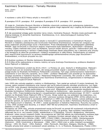 Fundacja Promocji Przemysłu Okrętowego i Gospodarki Morskiej Kazimierz Śramkiewicz - Tematy Morskie Autor: Cezary 30.05.2012. X wystawa z cyklu „Polscy artyści o morzu―  powiększ    powiększ   powiększ  powiększ    powiększ   powiększ 25 maja br. Centralne Muzeum Morskie w Gdańsku otworzyło wystawę prac poświęconą malarstwu Kazimierza Śramkiewicza. Zaproszeni na otwarcie goście mogli zapoznać się z częścią twÃłrczości artysty poruszającą tematykę morską (cs).   Jak powiedział witając gości dyrektor Jerzy Litwin, Centralne Muzeum Morskie może pochwalić się własną kolekcją 10 obrazÃłw Kazimierza Śramkiewicza, m.in. dokumentujących budowę Portu PÃłłnocnego * * * Dziesiąta wystawa z cyklu „Polscy artyści o morzu― prezentowana w Centralnym Muzeum Morskim w Gdańsku poświęcona jest twÃłrczości Kazimierza Śramkiewicza. Artysta ten związany był przez większość artystycznego życia z Wybrzeżem. Przez kilkadziesiąt lat był pedagogiem gdańskiej PWSSP. Jego twÃłrczość w znacznym stopniu inspirowana była Gdańskiem, Wybrzeżem i tematyką morską. Często malował stary port na Motławie, tworzył widoki stoczni, portÃłw i nadmorskich plaż. Na wystawie organizowanej w ramach X Bałtyckiego Festiwalu Nauki pokusiliśmy się o zebranie prac artysty o tej tematyce ze zbiorÃłw prywatnych i kolekcji muzealnych w całej Polsce. Prezentujemy je widzom jako zespÃłł dzieł tworzonych za sprawą niesłabnącego zainteresowania artysty jego otoczeniem i środowiskiem, w ktÃłrym przyszło mu żyć.   Kustosz wystawy dr Monika Jankiewicz-Brzostowska    Kilka słÃłw zadowolenia w imieniu rodziny od syna Andrzeja Śramkiewicza, profesora Akademii Sztuk Pięknych w Gdańsku Kazimierz Śramkiewicz urodził się 20.01.1914 r. w Poniecu (d. pow. Gostyń) w Wielkopolsce. Malował i rysował dużo już we wczesnej młodości, ale swoją przyszłość wiązał z zawodem architekta i w 1932 r. podjął studia na Wydziale Architektury Politechniki Lwowskiej. Tam jego zainteresowania malarstwem i uzdolnienia w tym kierunku sprawiły, że w 1938 r. profesor Władysław Lam powołał go na stanowisko swojego asystenta w Katedrze Rysunku i Malarstwa Politechniki Lwowskiej. We Lwowie w 1939 r. odbyła się też pierwsza indywidualna wystawa prac Kazimierza Śramkiewicza, zorganizowana w tamtejszym Towarzystwie PrzyjaciÃłł Sztuk Pięknych. Lato 1939 roku artysta spędzał u rodziny w Wielkopolsce. Tam zastał go wybuch II wojny światowej. Do Lwowa, gdzie zostawił mieszkanie oraz niemal cały swÃłj dotychczasowy dorobek artystyczny, już nigdy nie wrÃłcił. Lata okupacji niemieckiej przeżył w Brześciu Kujawskim, gdzie zarabiał na życie jako kreślarz. Po wojnie, w 1945 r. przyjął zaoferowane mu przez prof. Władysława Lama stanowisko asystenta na Wydziale Architektury Politechniki Gdańskiej. Pracował na Politechnice - jako asystent, a pÃłźniej adiunkt do roku 1951. Pracę dydaktyczną łączył z uzupełnianiem wykształcenia artystycznego. W 1947 r. uzyskał dyplom na Wydziale Sztuk Pięknych UMK w Toruniu. Wciąż wahał się, czy poświęcić się malarstwu, czy architekturze. Przełomowy okazał się rok 1946 i pierwsza wystawa okręgowa ZPAP, ktÃłra odbyła się w Toruniu. Jak sam wspominał w wywiadzie udzielonym w 1994 roku Hannie Solway, sukces jednego z jego obrazÃłw sprawił, że wybrał zawÃłd artysty malarza. Związał się na stałe z Państwową Wyższą Szkołą Sztuk Plastycznych w Gdańsku. W 1950 r. został asystentem w Katedrze Malarstwa i Rysunku tej uczelni, w roku 1956 uzyskał tytuł docenta, a w latach 1967-86 był profesorem. Kazimierz Śramkiewicz zmarł w Gdańsku w roku 1998. Począwszy od 1939 roku, artysta prezentował swoją twÃłrczość na ponad 60 wystawach indywidualnych, uczestniczył też w ok. 250 wystawach zbiorowych w kraju i za granicą. Jego wystawy indywidualne odbywały się m.in. we Lwowie (1939), wielokrotnie w TrÃłjmieście, Toruniu i Bydgoszczy, Warszawie, Krakowie i wielu innych miastach Polski. Na przełomie lat 1967/68 odbyła się indywidualna wystawa jego prac w Leningradzie (dzisiejszym Petersburgu). Tamtejszy Ermitaż zakupił wtedy do zbiorÃłw obraz artysty. Wystawiał też w Bremie (1982, 1987), FÃźrth (1982) i Hanowerze (1983). Zainteresowanie tematyką morską zaowocowało udziałem w wystawach marynistycznych organizowanych w Polsce (Katowice - 1949, trzykrotnie w Warszawie - 1960, 1963 i 1964) oraz w wielu miastach europejskich (Genua - 1951-52, Rzym - 1952, Rostock - 1962, Plymouth, Aberdeen, Glasgow, Edynburg - 1968). Ponadto artysta brał udział w wystawach sztuki polskiej, m. in. w Moskwie, Budapeszcie, Pradze (1951http://archiwum.oficynamorska.pl Kreator PDF Utworzono 3-03-2017, 00:16 Fundacja Promocji Przemysłu Okrętowego i Gospodarki Morskiej 52), Londynie (1952), Wenecji (1952), Montrealu (1962), Tokio (1965), Tunisie (1962), Nancy (1967), Kalmarze (1968) i USA (1956). Był kilkakrotnie nagradzany za swoją twÃłrczość, w tym dwukrotnie za obrazy o tematyce morskiej, na II i V OgÃłlnopolskiej Wystawie Plastyki Marynistycznej w Warszawie (1960 i 1964). TwÃłrczość Kazimierza Śramkiewicza zaliczana jest do malarstwa realistycznego, ale pojęcie realizmu interpretować tu trzeba bardzo swobodnie. Artysta nie ograniczał się do ilustrowania wybranych wycinkÃłw rzeczywistości, ale przetwarzał je we właściwy sobie sposÃłb, syntetyzując dekoracyjnie formy, kształtowane przy użyciu wyszukanych barw i zrÃłżnicowanych faktur. To dekoracyjne bogactwo podporządkowane było charakterystycznej dla Śramkiewicza dyscyplinie formalnej konstrukcji obrazu, z zawsze konsekwentnie prowadzoną perspektywą i nienagannie uchwyconymi wzajemnymi relacjami przestrzennymi przedmiotÃłw, co wzmacniało realistyczny wydźwięk dzieła, mimo że kształty poszczegÃłlnych przedmiotÃłw podlegały daleko idącemu uproszc