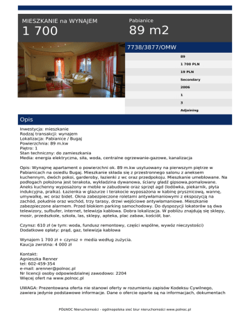 MIESZKANIE na WYNAJEM 1 700 Pabianice 89 m2 7738/3877/OMW 89 1 700 PLN 19 PLN Secondary 2006 1 3 Adjoining Opis Inwestycja: mieszkanie Rodzaj transakcji: wynajem Lokalizacja: Pabianice / Bugaj Powierzchnia: 89 m.kw Piętro: 1 Stan techniczny: do zamieszkania Media: energia elektryczna, siła, woda, centralne ogrzewanie-gazowe, kanalizacja Opis: Wynajmę apartament o powierzchni ok. 89 m.kw usytuowany na pierwszym piętrze w Pabianicach na osiedlu Bugaj. Mieszkanie składa się z przestronnego salonu z aneksem kuchennym, dwóch pokoi, garderoby, łazienki z wc oraz przedpokoju. Mieszkanie umeblowane. Na podłogach położona jest terakota, wykładzina dywanowa, ściany gładź gipsowa,pomalowane. Aneks kuchenny wyposażony w meble w zabudowie oraz sprzęt agd (lodówka, piekarnik, płyta indukcyjna, pralka). Łazienka w glazurze i terakocie wyposażona w kabinę prysznicową, wannę, umywalkę, wc oraz bidet. Okna zabezpieczone roletami antywłamaniowymi z ekspozycją na zachód, południe oraz wschód, trzy tarasy, drzwi wejściowe antywłamaniowe. Mieszkanie zabezpieczone alarmem. Przed blokiem parking samochodowy. Do dyspozycji lokatorów są dwa telewizory, sufbufer, internet, telewizja kablowa. Dobra lokalizacja. W pobliżu znajdują się sklepy, mosir, przedszkole, szkoła, las, sklepy, apteka, plac zabaw, kościół, bar. Czynsz: 610 zł (w tym: woda, fundusz remontowy, części wspólne, wywóz nieczystości) Dodatkowe opłaty: prąd, gaz, telewizja kablowa Wynajem 1 700 zł + czynsz + media według zużycia. Kaucja zwrotna: 4 000 zł Kontakt: Agnieszka Renner tel: 602-459-354 e-mail: [email protected] Nr licencji osoby odpowiedzialnej zawodowo: 2204 Więcej ofert na www.polnoc.pl UWAGA: Prezentowana oferta nie stanowi oferty w rozumieniu zapisów Kodeksu Cywilnego, zawiera jedynie podstawowe informacje. Dane o ofercie oparte są na informacjach, dokumentach PÓŁNOC Nieruchomości - ogólnopolska sieć biur nieruchomości www.polnoc.pl uzyskanych od Oferującego i mogą podlegać zmianom lub odbiegać od stanu faktycznego. Biuro nie odpowiada za ewentualne rozbieżności pomiędzy ofertą a stanem faktycznym. Oferta może być w danym momencie nieaktualna. Zapraszam do oglądania nieruchomości. Więcej ofert na stronie: http://www.polnoc.pl/pabianice Więcej ofert znajdziesz na naszej stronie www.polnoc.pl * UWAGA! Zamieszczone na naszych stronach oferty nie stanowią oferty w rozumieniu Kodeksu Cywilnego, a dane w nich zawarte mają jedynie charakter informacyjny. Agnieszka Renner tel. 602-459-354 email: [email protected] PÓŁNOC Nieruchomości - ogólnopolska sieć biur nieruchomości www.polnoc.pl Powered by TCPDF (www.tcpdf.org)