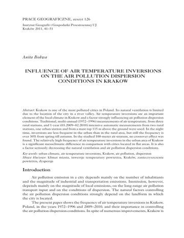 PRACE GEOGRAFICZNE, zeszyt 126 Instytut Geografii i Gospodarki Przestrzennej UJ Kraków 2011, 41–51 Anita Bokwa INFLUENCE OF AIR TEMPERATURE INVERSIONS ON THE AIR POLLUTION DISPERSION CONDITIONS IN KRAKOW Abstract: Krakow is one of the most polluted cities in Poland. Its natural ventilation is limited due to the location of the city in a river valley. Air temperature inversions are an important element of the local climate in Krakow and a factor strongly influencing air pollution dispersion conditions. Traditional, multi-annual (1972−1996) measurements of air temperature, from three rural stations, and 1-year (03.2009−02.2010) intensive automatic measurements from two rural stations, one urban station and from a mast top 115 m above the ground were used. In the night time, inversions are less frequent in the urban than in the rural area, but still the frequency is over 30% from spring till autumn. In the studied 100-meter air stratum, no crossover effect was found. The relatively high frequency of air temperature inversions in the urban area of Krakow is a significant mesoclimatic difference in comparison with cities located in flat areas. It is also a factor seriously decreasing the natural ventilation and air pollution dispersion conditions. Key words: urban climate, air temperature inversions, Krakow, air pollution, dispersion Słowa kluczowe: klimat miasta, inwersje temperatury powietrza, Kraków, zanieczyszczenie powietrza, dyspersja Introduction Air pollution emission in a city depends mainly on the number of inhabitants and the magnitude of industrial and transportation emissions. Immission, however, depends mainly on the magnitude of local emissions, on the long-range air pollution transport input and on the conditions of dispersion. The natural factors controlling the air pollution dispersion conditions strongly depend on the landform in which the city is located. The present paper shows the frequency of air temperature inversions in Krakow, Poland, in the years 1972−1996 and 2009−2010, and their importance in controlling the air pollution dispersion conditions. In spite of numerous improvements, Krakow is 42 PRACE GEOGRAFICZNE, ZESZYT 126 still one of the most polluted cities in Poland (Bokwa 2008). Therefore, it is necessary to study the factors which influence the aerosanitary conditions of the city, together with their multi-annual changes. The particular location of Krakow favours the occurrence of air temperature inversions which significantly hinders air pollution dispersion and causes an increase in its concentration. Krakow is a city in southern Poland, on the Wisla river, with about 750,000 inhabitants. The city’s area is 326.8 km2, and it is located in a concave landform. The historical city centre is placed in the Wisla river valley bottom (at about 200 m a.s.l.), going from the west to the east, and also on a limestone tectonic horst (the Wawel hill), emerging from the river valley. Other parts of Krakow occupy both areas in the river valley with its terraces, and on convex land forms to the south (the Carpathian Foothills, up to 370 m a.s.l.) and to the north (the Krakow-Czestochowa Upland, up to 300 m a.s.l.) of the city centre. The Wisla river valley is narrow in the western part of Krakow (about 1 km) and widens to about 10 km in the eastern part. In the western part there are several limestone tectonic horsts, reaching about 350 m a.s.l. The city area is not surrounded by the hills only from the east, which makes natural ventilation difficult (German 2007). According to J. Walczewski et al. (2000), the main meteorological factors controlling the air pollution dispersion conditions in Krakow are: 1) prevalent low wind speed, i.e. poor horizontal ventilation; 2) high intensity and varied vertical range of air temperature inversions, i.e. limited vertical ventilation; 3) precipitation washing out air pollution; 4) synoptic situation. Previous studies on air temperature inversions in Krakow Various methods are used to study the vertical structure of air temperature above a city. Sensors are located on towers, either already existing or constructed especially for the need of a particular study. Balloons and airplanes are used for mobile measurements of larger vertical and horizontal extent. Sodar measurements allow to obtain information of only qualitative character. Another method, used in cities located in valleys, is a comparison of the data from stations located 2 m above the ground, in various places in the cross-section of a valley with similar land use. J. Walczewski (1994) showed that the results from the “surface profiles” and e.g. balloon sounding are in a good accordance. Regardless the landform in which the city is located, usually during the night time, the isothermal or adiabatic lapse rate can be observed over the urbanised area while in rural areas an inversion occurs at the same time (Bornstein 1968, Oke 1982 after: Godowitch et al. 1985). Additionally, in cities located in valleys, katabatic flows can occur and significantly modify the air temperature spatial pattern in comparison with cities located in flat areas (e.g. Hildebrand, Ackerman 1984; Dupont et al. 1999; Kolev et al. 2000). The first studies on air temperature inversions in Krakow were organised by W. Milata and later described in the work of his wife, also engaged in the research. W. Milata compared the data from the city centre and the river valley bottom (i.e. INFLUENCE OF AIR TEMPERATURE INVERSIONS ON THE AIR POLLUTION... 43 from the climatological station of the Jagiellonian University in the Botanical Garden) with the data from a non-urban station, located about 100 m higher, south of the city centre (Libertow). He pointed out the limited possibilities of such a comparison due to differences in both relief and land use between the stations. Nevertheless, he found out that an inversion occurred during about 200 days per year and reached a mean intensity of 1.3°C (M