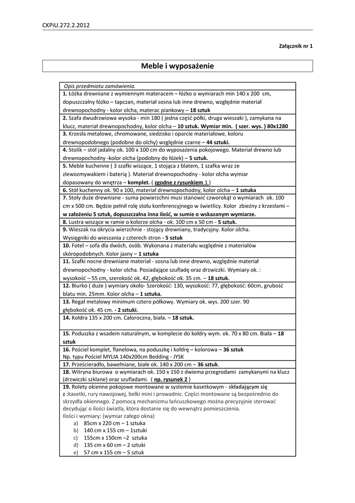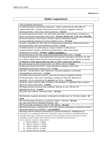 CKPiU.272.2.2012 Załącznik nr 1 Meble i wyposażenie Opis przedmiotu zamówienia. 1. Łóżka drewniane z wymiennym materacem – łóżko o wymiarach min 140 x 200 cm, dopuszczalny łóżko – tapczan, materiał sosna lub inne drewno, względnie materiał drewnopochodny - kolor olcha, materac piankowy – 18 sztuk 2. Szafa dwudrzwiowa wysoka - min 180 ( jedna część półki, druga wieszaki ), zamykana na klucz, materiał drewnopochodny, kolor olcha – 10 sztuk. Wymiar min. ( szer. wys. ) 80x1280 3. Krzesła metalowe, chromowane, siedzisko i oparcie materiałowe, koloru drewnopodobnego (podobne do olchy) względnie czarne – 44 sztuki. 4. Stolik – stół jadalny ok. 100 x 100 cm do wyposażenia pokojowego. Materiał drewno lub drewnopochodny -kolor olcha (podobny do łóżek) – 5 sztuk. 5. Meble kuchenne ( 3 szafki wiszące, 1 stojąca z blatem, 1 szafka wraz ze zlewozmywakiem i baterią ). Materiał drewnopochodny - kolor olcha wymiar dopasowany do wnętrza – komplet. ( zgodne z rysunkiem 1 ) 6. Stół kuchenny ok. 90 x 100, materiał drewnopochodny, kolor olcha – 1 sztuka 7. Stoły duże drewniane - suma powierzchni musi stanowić czworokąt o wymiarach ok. 100 cm x 500 cm. Będzie pełnił rolę stołu konferencyjnego w świetlicy. Kolor zbieżny z krzesłami – w założeniu 5 sztuk, dopuszczalna inna ilość, w sumie o wskazanym wymiarze. 8. Lustra wiszące w ramie o kolorze olcha - ok. 100 cm x 50 cm - 5 sztuk. 9. Wieszak na okrycia wierzchnie - stojący drewniany, tradycyjny. Kolor olcha. Wysięgniki do wieszania z czterech stron - 5 sztuk 10. Fotel – sofa dla dwóch, osób. Wykonana z materiału względnie z materiałów skóropodobnych. Kolor jasny – 1 sztuka 11. Szafki nocne drewniane materiał - sosna lub inne drewno, względnie materiał drewnopochodny - kolor olcha. Posiadające szufladę oraz drzwiczki. Wymiary ok. : wysokość – 55 cm, szerokość ok. 42, głębokość ok. 35 cm. – 18 sztuk. 12. Biurko ( duże ) wymiary około- Szerokość: 130, wysokość: 77, głębokość: 60cm, grubość blatu min. 25mm. Kolor olcha – 1 sztuka. 13. Regał metalowy minimum cztero półkowy. Wymiary ok. wys. 200 szer. 90 głębokość ok. 45 cm. - 2 sztuki. 14. Kołdra 135 x 200 cm. Całoroczna, biała. – 18 sztuk. 15. Poduszka z wsadem naturalnym, w komplecie do kołdry wym. ok. 70 x 80 cm. Biała – 18 sztuk 16. Pościel komplet, flanelowa, na poduszkę i kołdrę – kolorowa – 36 sztuk Np. typu Pościel MYLIA 140x200cm Bedding - JYSK 17. Prześcieradło, bawełniane, białe ok. 140 x 200 cm – 36 sztuk. 18. Witryna biurowa o wymiarach ok. 150 x 150 z dwiema przegrodami zamykanymi na klucz (drzwiczki szklane) oraz szufladami. ( np. rysunek 2 ) 19. Rolety okienne pokojowe montowane w systemie kasetkowym - składającym się z :kasetki, rury nawojowej, belki mini i prowadnic. Części montowane są bezpośrednio do skrzydła okiennego. Z pomocą mechanizmu łańcuszkowego można precyzyjnie sterować decydując o ilości światła, która dostanie się do wewnątrz pomieszczenia. Ilości i wymiary: (wymiar całego okna) a) 85cm x 220 cm – 1 sztuka b) 140 cm x 155 cm – 1sztuki c) 155cm x 150cm –2 sztuka d) 135 cm x 60 cm – 2 sztuki e) 57 cm x 155 cm – 5 sztuk CKPiU.272.2.2012 (kolor dostosowany do pomieszczenia, nie białe) 20. Zestaw kawowy Ilość filiżanek: 18 szt. Ilość spodków: 18 szt. Ilość cukiernic: 3 szt. Ilość imbryków do kawy: 3 szt. Ilość dzbanków do śmietany: 3 szt. - Patera na ciasto – 3 szt. 21. Zestaw obiadowy – ( ze wzorem ) Ilość talerzy głębokich: 18 szt. Ilość talerzy obiadowych: 18 szt. Ilość talerzy deserowych: 18 szt. 22. Kubki szklane – 18 szt. Przeźroczyste lub matowe, poj. około 250 ml. 23. Komplet przyborów kuchennych • Przybory ze stali nierdzewnej • Polerowane na połysk/ rączki satynowane Grubość: 1mm Skład: Łopatka – Łyżka bigosowa - Szumówka - Widelec - Nabierka - Nabierka do spaghetti Stojak z drutu stalowego 24. Komplet sztućców – 18x łyżka, 18 x łyżeczka, 18 x widelec, 18 x nóż Materiał: Sztućce z wysokiej jakości stali nierdzewnej 25. Komplet garnków, rondel i patelnia– 1 kpl. Zestaw 4 garnków ze stali nierdzewnej z rondlem i patelnią (powłoka wew. nieprzywierająca) ze szklanymi pokrywkami np. - garnek - średnica: 16,0 cm / pojemność: 1,9 litra - garnek - średnica: 18,0 cm / pojemność: 2,6 litra - garnek - średnica: 20,0 cm / pojemność: 3,6 litra - garnek - średnica: 24,0 cm / pojemność: 6,1 litra Wszystkie elementy z możliwością mycia w zmywarce i przystosowane do wszystkich rodzajów kuchni. Garnki z dnem akutermicznym, zapewniającym szybkie nagrzanie i długie utrzymywanie ciepła 26. Ręczniki - 50cm x 90 cm – 18 sztuk 27. Dywaniki wykładzinowe – około 160cm x 200cm - 7 sztuk (kolor dostosowany do pomieszczeń, nie białe) Meble winny być wykonane z płyt o grubości min. 18 mm.