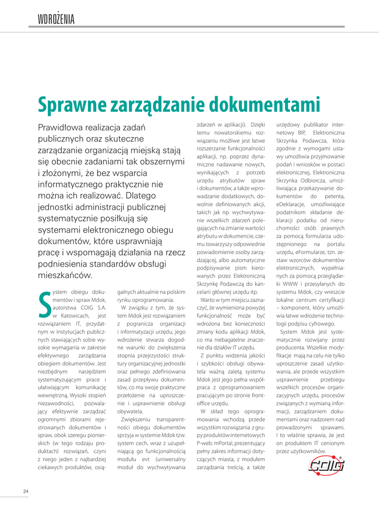 wdrożenia Sprawne zarządzanie dokumentami Prawidłowa realizacja zadań publicznych oraz skuteczne zarządzanie organizacją miejską stają się obecnie zadaniami tak obszernymi i złożonymi, że bez wsparcia informatycznego praktycznie nie można ich realizować. Dlatego jednostki administracji publicznej systematycznie posiłkują się systemami elektronicznego obiegu dokumentów, które usprawniają pracę i wspomagają działania na rzecz podniesienia standardów obsługi mieszkańców. S ystem obiegu dokumentów i spraw Mdok, autorstwa COIG S.A. w Katowicach, jest rozwiązaniem IT, przydatnym w instytucjach publicznych stawiających sobie wysokie wymagania w zakresie efektywnego zarządzania obiegiem dokumentów. Jest niezbędnym narzędziem systematyzującym prace i ułatwiającym komunikację wewnętrzną. Wysoki stopień niezawodności, pozwalający efektywnie zarządzać ogromnymi zbiorami rejestrowanych dokumentów i spraw, obok szeregu pionierskich (w tego rodzaju produktach) rozwiązań, czyni z niego jeden z najbardziej ciekawych produktów, osią- 24 galnych aktualnie na polskim rynku oprogramowania. W związku z tym, że system Mdok jest rozwiązaniem z pogranicza organizacji i informatyzacji urzędu, jego wdrożenie stwarza dogodne warunki do zwiększenia stopnia przejrzystości struktury organizacyjnej jednostki oraz pełnego zdefiniowania zasad przepływu dokumentów, co ma swoje praktyczne przełożenie na uproszczenie i usprawnienie obsługi obywatela. Zwiększeniu transparentności obiegu dokumentów sprzyja w systemie Mdok tzw. system cech, wraz z uzupełniającą go funkcjonalnością modułu evt (uniwersalny moduł do wychwytywania zdarzeń w aplikacji). Dzięki temu nowatorskiemu rozwiązaniu możliwe jest łatwe rozszerzanie funkcjonalności aplikacji, np. poprzez dynamiczne nadawanie nowych, wynikających z potrzeb urzędu atrybutów spraw i dokumentów, a także wprowadzanie dodatkowych, dowolnie definiowanych akcji, takich jak np. wychwytywanie wszelkich zdarzeń polegających na zmianie wartości atrybutu w dokumencie, czemu towarzyszy odpowiednie powiadomienie osoby zarządzającej, albo automatyczne podpisywanie pism kierowanych przez Elektroniczną Skrzynkę Podawczą do kancelarii głównej urzędu itp. Warto w tym miejscu zaznaczyć, że wymieniona powyżej funkcjonalność może być wdrożona bez konieczności zmiany kodu aplikacji Mdok, co ma niebagatelne znaczenie dla działów IT urzędu. Z punktu widzenia jakości i szybkości obsługi obywatela ważną zaletą systemu Mdok jest jego pełna współpraca z oprogramowaniem pracującym po stronie frontoffice urzędu. W skład tego oprogramowania wchodzą przede wszystkim rozwiązania z grupy produktów internetowych P-web: mPortal, prezentujący pełny zakres informacji dotyczących miasta, z modułem zarządzania treścią, a także urzędowy publikator internetowy BIP, Elektroniczna Skrzynka Podawcza, która zgodnie z wymogami ustawy umożliwia przyjmowanie podań i wniosków w postaci elektronicznej, Elektroniczna Skrzynka Odbiorcza, umożliwiająca przekazywanie dokumentów do petenta, eDeklaracje, umożliwiające podatnikom składanie deklaracji podatku od nieruchomości osób prawnych za pomocą formularza udostępnionego na portalu urzędu, eFormularze, tzn. zestaw wzorców dokumentów elektronicznych, wypełnianych za pomocą przeglądarki WWW i przesyłanych do systemu Mdok, czy wreszcie lokalne centrum certyfikacji – komponent, który umożliwia łatwe wdrożenie technologii podpisu cyfrowego. System Mdok jest systematycznie rozwijany przez producenta. Wszelkie modyfikacje mają na celu nie tylko uproszczenie zasad użytkowania, ale przede wszystkim usprawnienie przebiegu wszelkich procesów organizacyjnych urzędu, procesów związanych z wymianą informacji, zarządzaniem dokumentami oraz nadzorem nad prowadzonymi sprawami. I to właśnie sprawia, że jest on produktem IT cenionym przez użytkowników.