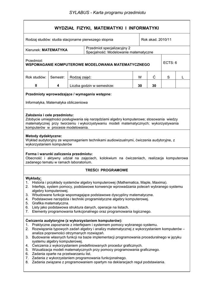 SYLABUS - Karta programu przedmiotu WYDZIAŁ FIZYKI, MATEMATYKI I INFORMATYKI Rodzaj studiów: studia stacjonarne pierwszego stopnia Kierunek: MATEMATYKA Rok akad. 2010/11 Przedmiot specjalizacyjny 2 Specjalność: Modelowanie matematyczne Przedmiot: WSPOMAGANIE KOMPUTEROWE MODELOWANIA MATEMATYCZNEGO Rok studiów: Semestr: II 4 ECTS: 6 Rodzaj zajęć: W Ć Liczba godzin w semestrze: 30 30 S L Przedmioty wprowadzające / wymagania wstępne: Informatyka, Matematyka obliczeniowa Założenia i cele przedmiotu: Zdobycie umiejętności posługiwania się narzędziami algebry komputerowe; stosowania wiedzy matematycznej przy tworzeniu i wykorzystywaniu modeli matematycznych; wykorzystywania komputerów w procesie modelowania. Metody dydaktyczne: Wykład audytoryjny ze wspomaganiem technikami audiowizualnymi, ćwiczenia audytoryjne, z wykorzystaniem komputerów Forma i warunki zaliczenia przedmiotu: Obecność i aktywny udział na zajęciach, kolokwium na ćwiczeniach, realizacja komputerowa zadanego tematu w ramach laboratorium. TREŚCI PROGRAMOWE Wykłady: 1. Historia i przykłady systemów algebry komputerowej (Mathematica, Maple, Maxima). 2. Interfejs, system pomocy, podstawowe konwencje wprowadzania poleceń wybranego systemu algebry komputerowej. 3. Wbudowane funkcje wspomagające podstawowe dyscypliny matematyczne. 4. Podstawowe narzędzia i techniki programistyczne algebry komputerowej. 5. Grafika matematyczna. 6. Listy jako podstawowa struktura danych, operacje na listach. 7. Elementy programowania funkcjonalnego oraz programowania logicznego. Ćwiczenia audytoryjne (z wykorzystaniem komputerów): 1. Praktyczne zapoznanie z interfejsem i systemem pomocy wybranego systemu. 2. Rozwiązania typowych zadań algebry i analizy matematycznej z wykorzystaniem komputerów – analiza poprawności otrzymanych rozwiązań. 3. Budowanie własnych funkcji na bazie implementacji programowania proceduralnego w języku systemu algebry komputerowej. 4. Ćwiczenia z wykorzystaniem predefiniowanych procedur graficznych. 5. Wizualizacja modeli matematycznych przy pomocy programowania graficznego. 6. Zadania oparte na przetwarzaniu list. 7. Zadania z wykorzystaniem programowania funkcjonalnego. 8. Zadania związane z programowaniem opartym na deklaracjach reguł podstawiania. Wykaz literatury podstawowej: [1] R. Liska, Computer algebra, algorithms, systems and applications, skrypt, 1999. [2] J. H. Davenport, Y. Siret, E. Tournier, Computer Algebra: Systems and Algorithms for Algebraic Computation, Acedemic Press , 1988. Wykaz literatury uzupełniającej: [1] N. Souza, R. Fateman, The Maxima Book, w przygotowaniu do druku, dostępna wstępna wersja elektroniczna. [2] S. Wolfram, The Mathematica Book, 2003. [3] Martha L. Abell, James P. Braselton, The Maple V Handbook, AP Professional, Boston, 1994. Osoba(y) odpowiedzialna(e) za przedmiot: dr Lech SŁAWIK Zatwierdził: dr hab. Teresa WINIARSKA, prof. PK