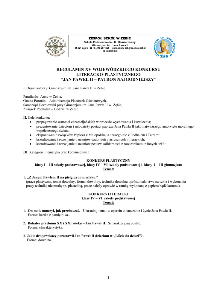 ZESPÓŁ SZKÓŁ W ZĘBIE Szkoła Podstawowa im. H. Marusarzówny Gimnazjum im. Jana Pawła II 34-521 Ząb 6 0(...)18 2071625 [email protected] [email protected] ętymś REGULAMIN XV WOJEWÓDZKIEGO KONKURSU LITERACKO-PLASTYCZNEGO “JAN PAWEŁ II – PATRON NAJGODNIEJSZY” I. Organizatorzy: Gimnazjum im. Jana Pawła II w Zębie, Parafia św. Anny w Zębie, Gmina Poronin – Administracja Placówek Oświatowych, Samorząd Uczniowski przy Gimnazjum im. Jana Pawła II w Zębie, Związek Podhalan – Oddział w Zębie. II. Cele konkursu: propagowanie wartości chrześcijańskich w procesie wychowania i kształcenia; prezentowanie dzieciom i młodzieży postaci papieża Jana Pawła II jako najwyższego autorytetu moralnego współczesnego świata; eksponowanie związków Papieża z Małopolską, a szczególnie z Podhalem i Tatrami; kształtowanie i rozwijanie u uczniów uzdolnień plastycznych i literackich; kształtowanie i rozwijanie u uczniów postaw solidarności z rówieśnikami z innych szkół. III. Kategorie i tematyka prac konkursowych: KONKURS PLASTYCZNY klasy I – III szkoły podstawowej, klasy IV – VI szkoły podstawowej i klasy I – III gimnazjum Temat: 1. „Z Janem Pawłem II na pielgrzymim szlaku.” (praca plastyczna, temat dowolny, format dowolny, technika dowolna oprócz malarstwa na szkle i wykonania pracy techniką nietrwałą np. plasteliną, prace należy oprawić w ramkę wykonaną z papieru bądź kartonu). KONKURS LITERACKI klasy IV – VI szkoły podstawowej Temat: 1. On mnie nauczył, jak przebaczać. Uzasadnij temat w oparciu o nauczanie i życie Jana Pawła II. Forma: kartka z pamiętnika.. 2. Bohater przełomu XX i XXI wieku – Jan Paweł II. Scharakteryzuj postać. Forma: charakterystyka. 3. Jakie drogowskazy pozostawił Jan Paweł II dzieciom w „Liście do dzieci”?. Forma: dowolna. 1 KONKURS LITERACKI klasy I-III gimnazjum Temat: 1. „Wszyscy członkowie rodziny, każdy wedle własnego daru, mają łaskę i odpowiedzialny obowiązek budowania dzień po dniu komunii osób, tworząc z rodziny „szkołę bogatszego człowieczeństwa”… Podstawowym czynnikiem w budowaniu takiej komunii jest wymiana wychowawcza między rodzicami i dziećmi, w której każdy daje i otrzymuje”. Zamieszczony cytat pochodzi z nauczania Jana Pawła II na temat wychowania. Jak Twoim zdaniem powinna być współczesna rodzina? Forma: dowolna. 2. Jan Paweł II w jednym z fragmentów Testamentu, który powstawał w ciągu kilku lat, umieścił refleksję: „ Non Omnis Moriar” – „Nie cały umieram”. Uzasadnij tą myśl. Forma: rozprawka.. 3. Jan Paweł II – kaznodzieja. Na czym polegał fenomen, który sprawił, że Papież przyciągał tłumy? Forma: felieton lub esej. 4. Głos Jana Pawła II we współczesnym życiu Polaków. Czy jest tylko „Głosem wołającego na pustyni”? Forma: rozprawka. KONKURS KOMPUTEROWY klasy I - III gimnazjum Temat: 1. Jan Paweł II Wielki – w służbie do końca. Ostatnie wzruszające lata życia Ojca Świętego oraz Jego ostatnia niezwykła encyklika – odejście do Domu Ojca. 2. Jan Paweł II – Apostoł Miłosierdzia 3. Jan Paweł II – Duszpasterz młodzieży. PREZENTACJA MULTIMEDIALNA DLA GIMNAZJUM Aby wziąć udział w konkursie należy wysłać prezentację multimedialną opracowaną w programie Microsoft Power Point ( *.ppt, *.pptx) lub Libre Office Impress ( *.odp). RYSUNEK W PROGRAMIE PAINT DLA SZKOŁY PODSTAWOWEJ Aby wziąć udział w konkursie należy wysłać rysunek w programie Microsoft Paint ( lub jego linuksowym odpowiednikiem np. Kolour Paint, Gnu Paint) zapisany w formacie *.bmp lub *.jpg na płycie CD lub DVD. Rysunek może być kolorowy lub w odcieniach szarości. Ponadto należy wysłać wydruk rysunku w formacie A4. Jeżeli rysunek jest kolorowy to wydruk także powinien być w kolorze. Proszę zwrócić uwagę na to, aby wersja papierowa była dobrej jakości. W związku z tym, iż rysunki będą eksponowane na pokonkursowej wystawie prosi się o wysyłanie wydruków w sztywnych teczkach formatu A4. Organizator przyjmuje wyłącznie prace indywidualne. IV. Warunki uczestnictwa w konkursach: konkurs jest przeznaczony dla uczniów szkół podstawowych i gimnazjów z woj. małopolskiego, organizator przyjmuje wyłącznie prace indywidualne, po przeprowadzeniu etapu szkolnego na szczebel wojewódzki można wytypować nie więcej niż: a) w konkursie plastycznym I – III SP – 4 prace b) w konkursie plastycznym IV – VI SP - 4 prace c) w konkursie plastycznym I – III gimnazjum – 4 prace d) w konkursie literackim IV - VI SP - 3 prace e) w konkursie literackim I – III gimnazjum - 3 prace f) w konkursie multimedialnym I – III gimnazjum - 3 prace 2 Uwaga opiekunowie ! Zachęcamy do wzięcia udziału w „mini” konkursie tj. do zaproponowania tematu i formy pracy literackiej dla klas IV – VI SP i klas I – III gimnazjum na kolejną edycję Wojewódzkiego Konkursu Literacko-Plastycznego – „Jan Paweł II – Patron Najgodniejszy”. Przewidziane dyplomy i nagrody. 1. Do każdej pracy powinna być załączona metryczka pisana drukowanymi literami najlepiej komputerowo według następującego wzoru: Imię i nazwisko uczestnika ...................................................................................... Klasa........................................................................................................................ .. Dokładny adres szkoły............................................................................................... Imię i nazwisko opiekuna........................................................................................... Aktualny telefon szkoły (wraz z numerem kierunkowym)......................................... 2. Termin nadsyłania prac: 09. 03. 2016 r. (decyduje data stempla pocztowego). Adres organizatora konkursu: GIMNAZJUM IM. JANA PAWŁA II W ZĘBIE 34-521 ZĄB 6 z dopiskiem: KONKURS 3. Przysłanie przez uczestników większej liczby prac