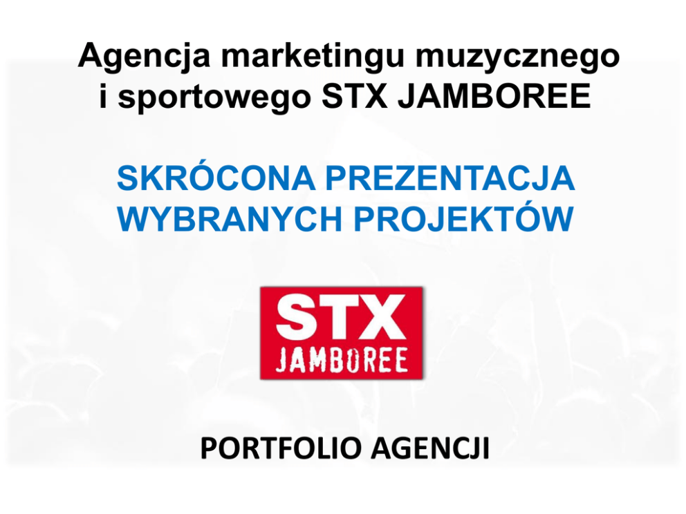 Agencjamarketingu bookingowa - oferta Agencja muzycznego i sportowego STX JAMBOREE SKRÓCONA PREZENTACJA WYBRANYCH PROJEKTÓW PORTFOLIO AGENCJI Agencja marketingu muzycznego i sportowego STX JAMBOREE (zatrudniająca 12 pracowników) ma wieloletnie doświadczenie w tworzeniu strategii komunikacji, działaniach PR oraz organizowaniu koncertów, festiwali, a także oryginalnych, „szytych na miarę klienta” imprez, eventów oraz projektów specjalnych. Kompleksowa organizacja i produkcja imprez, koncertów oraz festiwali muzycznych z pełną obsługą marketingową i PR-ową Agencja koncertowa STX JAMBOREE to grupa dwóch współpracujących ze sobą od 2005 roku spółek, czyli STX Records Sp. z o.o. (Prezes Zarządu - Stanisław Trzciński) oraz Agencja Jamboree Sp. z o.o. (Prezes Zarządu - Paweł Kwiatkowski). Marketing muzyczny, artystyczny i sportowy –platformy marketingowe, długofalowe strategie dla klientów, obsługa PR projektów Booking artystów (polskich i zagranicznych) Prawa autorskie i wykonawcze do reklam ATL i BTL Ambient media – alternatywne kanały dotarcia do odbiorców, gł. fanów muzyki Płyty Premium CD / DVD dołączane do produktów, usług i mediów Własny repertuar – wydawnictwa i promocja płyt na najwyższym poziomie Stała współpraca z warszawskim Centrum Artystycznym Fabryka Trzciny STX JAMBOREE Entertainment & Music Company ul. Kopernika 17, 00-359 Warszawa, Polska; tel. +48 22 203 64 43, fax +48 203 64 99; www.stx-jamboree.com Agencja eventowa STX JAMBOREE agencją eventową 2009 roku! Agencja marketingu muzycznego i sportowego STX JAMBOREE została wybrana Agencją Eventową 2009 roku, zostając laureatem prestiżowej nagrody BizTrendy 2009 miesięcznika Business Media / Media i Marketing Polska w kategorii „Eventy”. Zdaniem redakcji Business Media, agencja STX JAMBOREE jako „organizator eventów klasy premium, należy do najszybciej rozwijających się firm w branży marketingu muzycznego, będąc pionierem we wprowadzaniu nowych, strategicznych rozwiązań dla klientów”. Dalej czytamy, że „import gwiazd zagranicznych to specjalizacja, z której STX JAMBOREE jest znane od lat”. Natomiast doceniona została w szczególności „organizacja spektakularnych wydarzeń, takich jak festiwal PKO BP London Live, gala rozdania nagród polskiego przemysłu fonograficznego Fryderyki, czy rocznicowy koncert w Stoczni Gdańskiej z udziałem Kylie i Scorpions.” STX JAMBOREE Entertainment & Music Company ul. Kopernika 17, 00-359 Warszawa, Polska; tel. +48 22 203 64 43, fax +48 203 64 99; www.stx-jamboree.com Wybrane imprezy oraz koncerty zrealizowane przez STX JAMBOREE w Polsce i za granicą Organizacja koncertów Koncerty w Polsce takich artystów jak: Macy Gray, Grace Jones, Kylie Minogue, Scorpions, Diana Krall, Ray Charles, James Brown, Woody Allen & His New Orleans Jazz Band, Natalie Cole, Dee Dee Bridgewater, Wynton Marsalis, Paco De Lucia, Bebel Gilberto, Glenn Miller Orchestra, The Manhattan Transfer, Take 6, BBC Big Band i wielu innych Koncert „Zaczęło się w Polsce” w Stoczni Gdaoskiej 4.06.2009 r. – wielki koncert dla 100 000 widzów z okazji 20-lecia upadku komunizmu w Polsce i Europie Środkowej – w tym koncerty Kylie Minogue i Scorpions oraz 5 polskich wykonawców, a także tzw. „efekt domina” z udziałem Lecha Wałęsy (transmisja w TVP2) Jazz Jamboree - osiem edycji festiwalu - Warszawa, Sala Kongresowa (1995 - 2000 oraz 2006-2007) – najstarszy jazzowy festiwal w Europie z udziałem ok.. stu największych artystów jazzowych świata (transmisje w TVP) Gala wręczenia najważniejszych nagród polskiego przemysłu muzycznego FRYDERYK 2007, 2008, 2009, 2010, 2011 – Fabryka Trzciny (muzyka rozrywkowa) i Bazylika oo. Salezjanów (muzyka poważna i jazzowa) z udziałem czołówki polskiej sceny muzycznej (transmisje na żywo w TVP1) PKO BP London Live – Polish Music Festival Wembley Arena, Londyn (ok. 15 tysięcy widzów) – z udziałem czołówki polskiej sceny muzycznej (wrzesieo 2008, transmisja w TVP2) STX JAMBOREE Entertainment & Music Company ul. Kopernika 17, 00-359 Warszawa, Polska; tel. +48 22 203 64 43, fax +48 203 64 99; www.stx-jamboree.com Oferta bookingowa Pozytywne Wibracje Festival - międzynarodowy festiwal muzyczny (Białystok, 10 000 widzów, od 2010 roku) Solidarnie dla Powodzian - centralna konwencja dla Komitetu Wyborczego Bronisława Komorowskiego, sześciu czołowych artystów polskich, Warszawa – Agrykola, 20 000 widzów, 13 czerwca 2010 Festiwal Dialogu Czterech Kultur / Etniczne Brzmienie Czterech Kultur (Rosja/Niemcy/Izrael/Polska), Łódź, 2006 i 2007 (transmisje w TVP) Polska premiera „Liverpool Oratorio” (Paul McCartney & Carl Davis) – Kraków, 1994 Europejski Miesiąc Kultury - kompleksowa organizacja kilkunastu koncertów, Kraków (1992) Międzynarodowy Festiwal Gitarowy - Kraków (1992-1994) Z serca Polski dla Kosowa – koncert charytatywny z udziałem czołówki polskiej sceny muzycznej, Warszawa (1999 - transmisja w TVP) Coroczne wystawy w PKiN: „Piłkarska”, „Muzyczna”, „Olimpijska”, „Filmowa” – blisko 1 mln widzów (lata 2002 - 2006) STX JAMBOREE Entertainment & Music Company ul. Kopernika 17, 00-359 Warszawa, Polska; tel. +48 22 203 64 43, fax +48 203 64 99; www.stx-jamboree.com Agencja muzyczna Prix de Diane-HERMES, Dzieo Polski (40 tys. widzów), Chantilly-Francja, czerwiec 2004 Festiwal Kultury Żydowskiej (8 koncertów), Paryż, lipiec 2004 12-sto godzinny maraton koncertowy – „Chopin dans tous ses etats”, Paryż, grudzieo 2004 Zakooczenie Sezonu Kulturalnego „Nova Polska”, Paryż, grudzieo 2004 Hafengeburtstag - Polska Wioska (16 koncertów), Hamburg, maj 2005 Narodowe Święto Niepodległości w Ambasadzie Rzeczypospolitej Polskiej w Buenos Aires, (w tym koncert Andrzej Jagodzioski Trio), listopad 2005 60-lecie tygodnika Przekrój z koncertem Jana A.P. Kaczmarka – był to pierwszy występ artysty w Polsce po otrzymaniu Oskara 