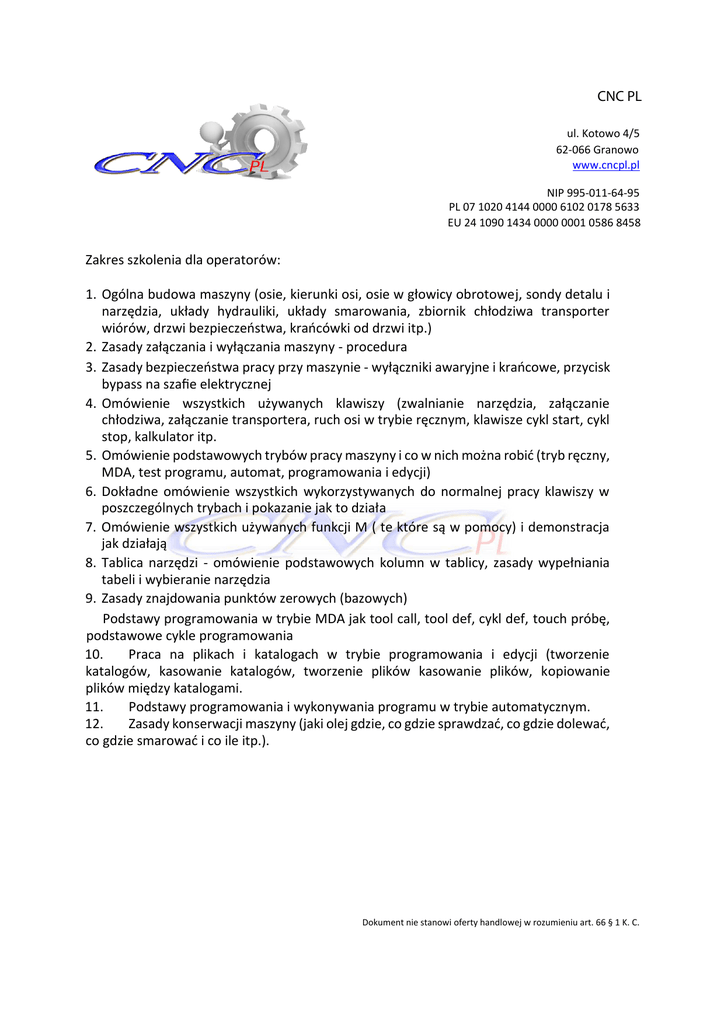 CNC PL ul. Kotowo 4/5 62-066 Granowo www.cncpl.pl NIP 995-011-64-95 PL 07 1020 4144 0000 6102 0178 5633 EU 24 1090 1434 0000 0001 0586 8458 Zakres szkolenia dla operatorów: 1. Ogólna budowa maszyny (osie, kierunki osi, osie w głowicy obrotowej, sondy detalu i narzędzia, układy hydrauliki, układy smarowania, zbiornik chłodziwa transporter wiórów, drzwi bezpieczeństwa, krańcówki od drzwi itp.) 2. Zasady załączania i wyłączania maszyny - procedura 3. Zasady bezpieczeństwa pracy przy maszynie - wyłączniki awaryjne i krańcowe, przycisk bypass na szafie elektrycznej 4. Omówienie wszystkich używanych klawiszy (zwalnianie narzędzia, załączanie chłodziwa, załączanie transportera, ruch osi w trybie ręcznym, klawisze cykl start, cykl stop, kalkulator itp. 5. Omówienie podstawowych trybów pracy maszyny i co w nich można robić (tryb ręczny, MDA, test programu, automat, programowania i edycji) 6. Dokładne omówienie wszystkich wykorzystywanych do normalnej pracy klawiszy w poszczególnych trybach i pokazanie jak to działa 7. Omówienie wszystkich używanych funkcji M ( te które są w pomocy) i demonstracja jak działają 8. Tablica narzędzi - omówienie podstawowych kolumn w tablicy, zasady wypełniania tabeli i wybieranie narzędzia 9. Zasady znajdowania punktów zerowych (bazowych) Podstawy programowania w trybie MDA jak tool call, tool def, cykl def, touch próbę, podstawowe cykle programowania 10. Praca na plikach i katalogach w trybie programowania i edycji (tworzenie katalogów, kasowanie katalogów, tworzenie plików kasowanie plików, kopiowanie plików między katalogami. 11. Podstawy programowania i wykonywania programu w trybie automatycznym. 12. Zasady konserwacji maszyny (jaki olej gdzie, co gdzie sprawdzać, co gdzie dolewać, co gdzie smarować i co ile itp.). Dokument nie stanowi oferty handlowej w rozumieniu art. 66 § 1 K. C.
