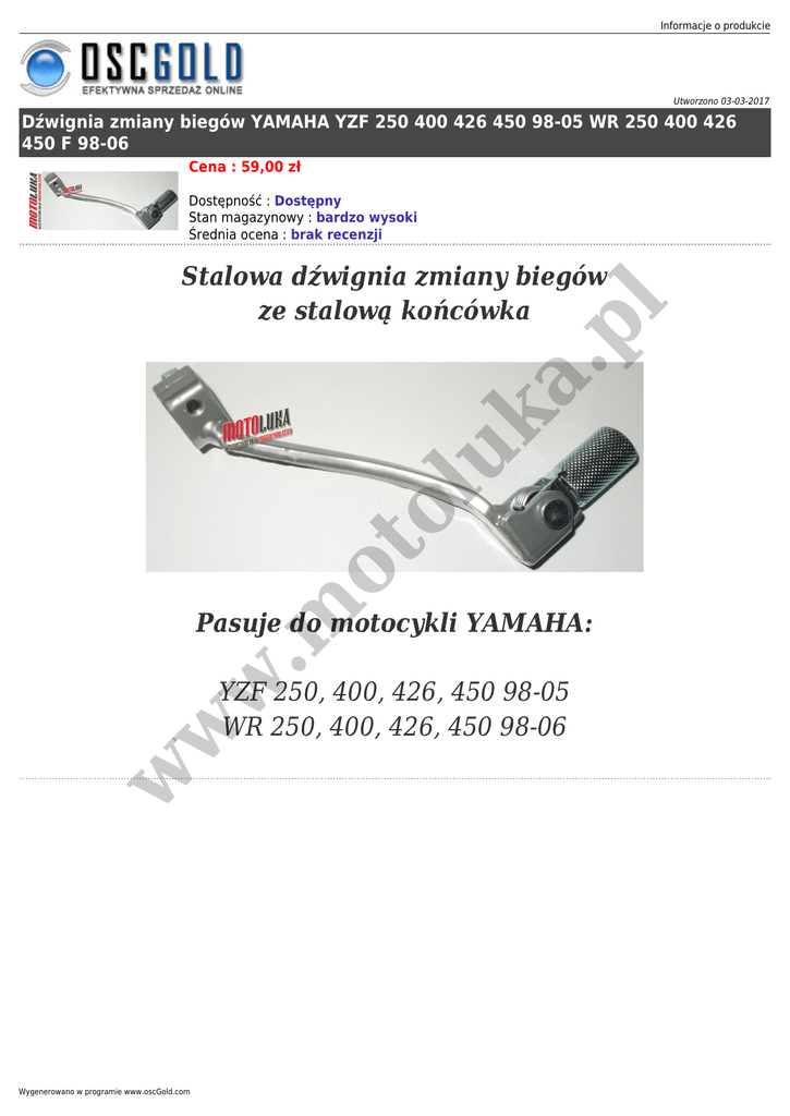 Informacje o produkcie Utworzono 03-03-2017 Dźwignia zmiany biegów YAMAHA YZF 250 400 426 450 98-05 WR 250 400 426 450 F 98-06 Cena : 59,00 zł Dostępność : Dostępny Stan magazynowy : bardzo wysoki Średnia ocena : brak recenzji .m ot ol uk a. pl Stalowa dźwignia zmiany biegów ze stalową końcówka Pasuje do motocykli YAMAHA: w w w YZF 250, 400, 426, 450 98-05 WR 250, 400, 426, 450 98-06 Wygenerowano w programie www.oscGold.com