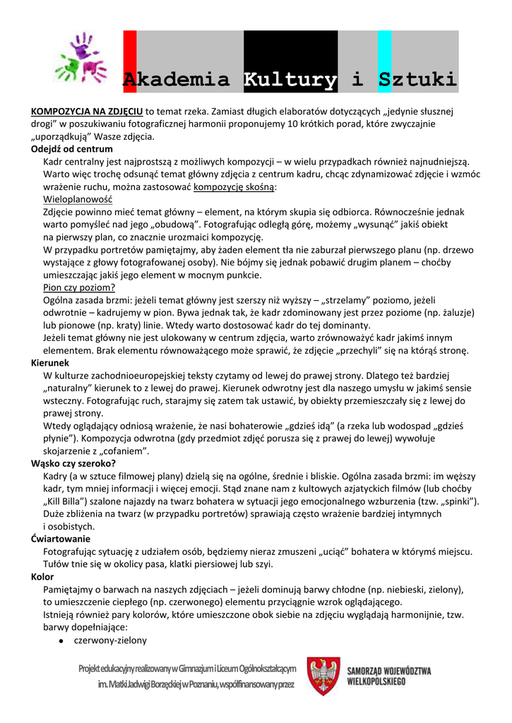 Akademia Kultury i Sztuki KOMPOZYCJA NA ZDJĘCIU to temat rzeka. Zamiast długich elaboratów dotyczących „jedynie słusznej drogi” w poszukiwaniu fotograficznej harmonii proponujemy 10 krótkich porad, które zwyczajnie „uporządkują” Wasze zdjęcia. Odejdź od centrum Kadr centralny jest najprostszą z możliwych kompozycji – w wielu przypadkach również najnudniejszą. Warto więc trochę odsunąć temat główny zdjęcia z centrum kadru, chcąc zdynamizować zdjęcie i wzmóc wrażenie ruchu, można zastosować kompozycję skośną: Wieloplanowość Zdjęcie powinno mieć temat główny – element, na którym skupia się odbiorca. Równocześnie jednak warto pomyśleć nad jego „obudową”. Fotografując odległą górę, możemy „wysunąć” jakiś obiekt na pierwszy plan, co znacznie urozmaici kompozycję. W przypadku portretów pamiętajmy, aby żaden element tła nie zaburzał pierwszego planu (np. drzewo wystające z głowy fotografowanej osoby). Nie bójmy się jednak pobawić drugim planem – choćby umieszczając jakiś jego element w mocnym punkcie. Pion czy poziom? Ogólna zasada brzmi: jeżeli temat główny jest szerszy niż wyższy – „strzelamy” poziomo, jeżeli odwrotnie – kadrujemy w pion. Bywa jednak tak, że kadr zdominowany jest przez poziome (np. żaluzje) lub pionowe (np. kraty) linie. Wtedy warto dostosować kadr do tej dominanty. Jeżeli temat główny nie jest ulokowany w centrum zdjęcia, warto zrównoważyć kadr jakimś innym elementem. Brak elementu równoważącego może sprawić, że zdjęcie „przechyli” się na którąś stronę. Kierunek W kulturze zachodnioeuropejskiej teksty czytamy od lewej do prawej strony. Dlatego też bardziej „naturalny” kierunek to z lewej do prawej. Kierunek odwrotny jest dla naszego umysłu w jakimś sensie wsteczny. Fotografując ruch, starajmy się zatem tak ustawić, by obiekty przemieszczały się z lewej do prawej strony. Wtedy oglądający odniosą wrażenie, że nasi bohaterowie „gdzieś idą” (a rzeka lub wodospad „gdzieś płynie”). Kompozycja odwrotna (gdy przedmiot zdjęć porusza się z prawej do lewej) wywołuje skojarzenie z „cofaniem”. Wąsko czy szeroko? Kadry (a w sztuce filmowej plany) dzielą się na ogólne, średnie i bliskie. Ogólna zasada brzmi: im węższy kadr, tym mniej informacji i więcej emocji. Stąd znane nam z kultowych azjatyckich filmów (lub choćby „Kill Billa”) szalone najazdy na twarz bohatera w sytuacji jego emocjonalnego wzburzenia (tzw. „spinki”). Duże zbliżenia na twarz (w przypadku portretów) sprawiają często wrażenie bardziej intymnych i osobistych. Ćwiartowanie Fotografując sytuację z udziałem osób, będziemy nieraz zmuszeni „uciąć” bohatera w którymś miejscu. Tułów tnie się w okolicy pasa, klatki piersiowej lub szyi. Kolor Pamiętajmy o barwach na naszych zdjęciach – jeżeli dominują barwy chłodne (np. niebieski, zielony), to umieszczenie ciepłego (np. czerwonego) elementu przyciągnie wzrok oglądającego. Istnieją również pary kolorów, które umieszczone obok siebie na zdjęciu wyglądają harmonijnie, tzw. barwy dopełniające: czerwony-zielony Projekt edukacyjnyrealizowany w Gimnazjum iLiceum Ogólnokształcącym im.MatkiJadwigiBorzęckiejwPoznaniu,współfinansowanyprzez Akademia Kultury i Sztuki niebieski-pomarańczowy żółty-fioletowy Symetria Symetria to jeden z kanonów piękna. Warto wykorzystać ten fakt, odnajdując ją w otaczającym świecie. Możemy czasem sobie pomóc, wykorzystując różne powierzchnie odbijające (szyby, lustra, taflę wody). Spirale Liczba pi jest jedną z najczęściej występujących w przyrodzie, dlatego wyjątkowo przyjemna dla oka jest kompozycja spiralna lub umieszczenie na zdjęciu okrągłych elementów. W fotografii istnieje szereg reguł, których powinno się przestrzegać, aby wykonać tzw. poprawne zdjęcie. Czytając kolejne artykuły o sposobie na „poprawne naświetlenie śniegu” czy o aparatach z kosmicznymi trybami programowymi, mam wrażenie, że czasem zapominamy o jednej podstawowej kwestii: fotografia pozostaje środkiem wyrazu nas samych – naszej obserwacji świata. Dlatego też o poprawności zdjęcia nie świadczy ślepe przestrzeganie wyznaczonych reguł, ale jego zgodność z tym, JAK chcemy daną scenę przedstawić. Znajomość zasad “fotograficznej poprawności” (poprawna ekspozycja, poprawne wyostrzenie, poprawny balans bieli czy nawet poprawnie użyty obiektyw) zwykle nam w tym pomaga – szczególnie na początku nauki. Nie pozwólmy jednak, aby ta wiedza nas ograniczała. I tym właśnie jest ten artykuł: zachętą do buntu. Przeciwko czemu możemy więc się buntować? Nie fotografuj pod światło To jedna z pierwszych zasad wtłaczanych do naszych głów. Dlaczego nie powinniśmy fotografować pod światło? Ponieważ dla poprawnej ekspozycji głównego tematu zdjęcia będziemy musieli prześwietlić całą resztę. I rzeczywiście w 95% przypadków efekt będzie dość mizerny. Jednak w tych 5% czai się olbrzymi potencjał. Bo po ponownym namyśle możemy dojść do wniosku, że tło wcale nie jest takie ważne. Ba, jasność za plecami naszego bohatera dodaje zdjęciu pazura! I odwrotnie: być może zdjęcie będzie znacznie bardziej wymowne, jeżeli nasz bohater będzie zaledwie sylwetą na tle dramatycznie zachmurzonego nieba. Pamiętajmy tylko o niebezpieczeństwie uszkodzenia matrycy przy zbyt długim podniesieniu lustra bezpośrednio na słońce. Zdjęcie musi mieć jeden temat główny Teoretycznie każde zdjęcie powinno mieć jeden najmocniejszy element – wątek przewodni, który poprowadzi oglądającego za rączkę do puenty. W takim razie tacy fotografowie jak Alex Webb nie mieliby czego szukać w fotografii – tymczasem to właśnie on jest jednym z najbardziej znanych fotografów National Geographic. Zdarzają się bowiem sytuacje bardziej złożone, składające się z wielu wątków, któ