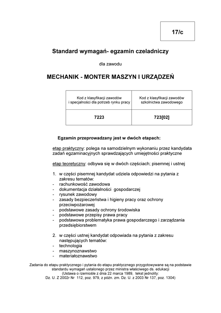 1 7 /c S ta n d a r d w y m a g a ń -e g z a m in c z e la d n ic z y dla zawodu M E C H A N IK -M O N T E R M A S Z Y N I U R Z Ą D Z E Ń Kod z klasyfikacji zawodów i sp e cjaln oś ci dla p ot r ze b r yn ku p r acy Kod z klasyfikacji zawodów szkoln ict wa zawodowe g o 7223 723[ 0 2] E g z a m in p r z e p r o w a d z a n y je s t w d w ó c h e ta p a c h : e t ap p r ak t y c zn y : p ole g a n a s am odzi e ln y m wy k on an i u p r ze z k an dy dat a zadań e g zam i n ac y j n y c h s p r awdzaj ą c y c h um i e j ę t n oś c i p r ak t y c zn e e t ap t e or e t y c zn y : odb y wa s i ę w dwó c h c zę ś c i ac h ; p i s e m n e j i us t n e j 1 . w c zę ś c i p i s e m n e j k an dy dat udzi e la odp owi e dzi n a p y t an i a z zak r e s u t e m at ó w: - r ac h un k owoś ć zawodowa - dok um e n t ac j a dzi ał aln oś c i g os p odar c ze j - r y s un e k zawodowy - zas ady b e zp i e c ze ń s t wa i h i g i e n y p r ac y or az oc h r on y p r ze c i wp oż ar owe j - p ods t awowe zas ady oc h r on y ś r odowi s k a - p ods t awowe p r ze p i s y p r awa p r ac y - p ods t awowa p r ob le m at y k a p r awa g os p odar c ze g o i zar zą dzan i a p r ze ds i ę b i or s t we m 2 . w c zę ś c i us t n e j k an dy dat odp owi ada n a p y t an i a z zak r e s u n as t ę p uj ą c y c h t e m at ó w: - t e c h n olog i a - m as zy n ozn aws t wo - m at e r i ał ozn aws t wo Z adan ia do e t ap u p r akt yczn e g o i p st an dar du wym ag ań ( U st awa o r ze m D z. U . Z 2 0 0 2 r N r 1 1 2 , p yt an ia do e t ap u u st alon e g o p r ze ioś le z dn ia 2 2 oz. 9 7 9 , z p óź n p r akt yczn e g o p r zyg z m in ist r a wł aś ciwe m ar ca 1 9 8 9 , t e kst . zm . D z. U . z 2 0 0 3 ot owywan e są n a p odst awie g o ds. e du kacji je dn olit y: N r 1 3 7 , p oz. 1 3 0 4 ) Zawód: mechanik-mo nt er mas z y n i u r z ą d z eń I. Etap teoretyczny (część pisemna i ustna egzaminu) obejmuje: Z akr es wiad o mo ś ci i u miej ę t no ś ci wł aś ciwy ch d l a kwal if ikacj i w z awo d z ie K a n d y d a t p o w in ie n u m ie ć : 1 . C zy t a ć ze zr o zu m i e n i e m i n f o r m a c j e p r ze d s t a wi o n e w f o r m i e o p i s ó w, i n s t r u k c j i , r y s u n k ó w, s zk i c ó w, wy k r e s ó w, d o k u m e n t a c j i t e c h n i c zn y c h i t e c h n o l o g i c zn y c h , a w s zc ze g ó l n o ś c i : 1.1. ok r e ś l a ć f u n k c j e z e s p oł ó w , p od z e s p oł ó w i c z ę ś c i m e c h a n iz m ó w m a s z y n i u r z ą d z e ń m e c h a n ic z n y c h ; 1.2 . r oz p oz n a w a ć p od s t a w ow e c z ę ś c i m a s z y n i u r z ą d z e ń m e c h a n ic z n y c h ; 1.3 . r oz p oz n a w a ć t y p ow e p oł ą c z e n ia r u c h ow e i s p oc z y n k ow e c z ę ś c i m a s z y n i u r z ą d z e ń m e c h a n ic z n y c h ; 1.4 . w s k a z y w a ć z a s a d y m on t a ż u i d e m on t a ż u p r os t y c h z e s p oł ó w m a s z y n i u r z ą d z e ń m e c h a n ic z n y c h ; 1.5 . r oz p oz n a w a ć oz n a c z e n ia i s y m b ol e t ol e r a n c j i i p a s ow a ń w y s t ę p u j ą c e n a r y s u n k a c h ; 1.6 . r oz p oz n a w a ć s y m b ol e i oz n a c z e n ia d ot y c z ą c e ob r ó b k i c ie p l n e j , c ie p l n o-c h e m ic z n e j i ob r ó b k i s k r a w a n ie m ; 1.7 . w y j a ś n ia ć p od s t a w ow e p oj ę c ia z w ią z a n e z e k s p l oa t a c j ą m a s z y n i u r z ą d z e ń m e c h a n ic z n y c h ; 1.8 . ok r e ś l a ć p od s t a w ow e c z y n n ik i p ow od u j ą c e p ow s t a w a n ie k or oz j i or a z s p os ob y z a b e z p ie c z a n ia m e t a l i p r z e d j e j p ow s t a w a n ie m ; 1.9 . r oz r ó ż n ia ć i c h a r a k t e r y z ow a ć r od z a j e n a p r a w , p r z e g l ą d ó w t e c h n ic z n y c h i r e m on t ó w m a s z y n i u r z ą d z e ń m e c h a n ic z n y c h . 2. P r ze t wa r za ć d a n e l i c zb o we i o p e r a c y j n e , a w s zc ze g ó l n o ś c i : 2 .1. ok r e ś l a ć k ol e j n oś ć m on t a ż u i d e m on t a ż u m a s z y n i u r z ą d z e ń m e c h a n ic z n y p od s t a w ie d ok u m e n t a c j i m on t a ż ow e j or a z d ok u m e n t a c j i t e c h n ic z n o-r u c h ow e j ; 2 .2 . ok r e ś l a ć z a k r e s p r z e g l ą d u ok r e s ow e g o, n a p r a w y b ie ż ą c e j , ś r e d n ie j i g ł ó w n e w y s t ę p u j ą c e w n ic h f a z y p r oc e s u n a p r a w c z e g o; 2 .3 . d ob ie r a ć n a p od s t a w ie n or m i k a t a l og ó w p od z e s p oł y i c z ę ś c i d o n a p r a w m a u rz ą d z e ń ; 2 .4 . d ob ie r a ć n a r z ę d z ia m on t e r s k ie , u w z g l ę d n ia j ą c t e c h n ol og ię p r a c d e m on t a m on t a ż ow y c h ; 2 .5 . d ob ie r a ć n a r z ę d z ia p om ia r ow o-k on t r ol n e ; 2 .6 . ob l ic z a ć p r z e ł oż e n ia k in e m a t y c z n e p r os t y c h m e c h a n iz m ó w n a p ę d ow y c h m iu rz ą d z e ń ; 2 .7 . w s k a z y w a ć s p os ob y n a p r a w c z ę ś c i m a s z y n i u r z ą d z e ń ; 2 .8 . d ob ie r a ć z a m ie n n e m a t e r ia ł y e k s p l oa t a c y j n e , ol e j e , s m a r y s t a ł e i c ie c z e s m a r c h ł od z ą c e ; 2 .9 . s z a c ow a ć k os z t y p r a c z w ią z a n y c h z p r z e p r ow a d z a n ie m n a p r a w or a z p r z e g m a s z y n i u r z ą d z e ń m e c h a n ic z n y c h . c h n a j or a z s z y n i ż ow oa s z y n u j ą c olą d ó w 3. B e zp i e c zn i e wy k o n y wa ć za d a n i a za wo d o we zg o d n i e z p r ze p i s a m i b e zp i e c ze ń s t wa i h i g i e n y p r a c y , o c h r o n y p r ze c i wp o ż a r o we j o r a z o c h r o n y ś r o d o wi s k a , a w s zc ze g ó l n o ś c i : 3 .1. w s k a z y w a ć z a g r oż e n ia d l a z d r ow ia z w ią z a n y c h z n a p r a w a m i, p r z e g l ą u r z ą d z e ń m e c h a n ic z n y c h ; 3 .2 . d ob ie r a ć ś r od k i oc h r on y in d y w id u a l 