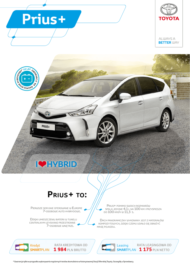 Prius+ P rius + to : Prius+ pomimo swoich rozmiarów spala jedynie 4,1 l na 100 km i przyspiesza do 100 km/h w 11,3 s. Pierwsze seryjnie oferowane w Europie 7-osobowe auto hybrydowe. Dzięki umieszczeniu baterii w tunelu centralnym uzyskano przestronne 7-osobowe wnętrze. • RATA KREDYTOWA OD 1 984 PLN BRUTTO Dach panoramiczny wykonany jest z materiałów kompozytowych, dzięki czemu udało się obniżyć masę pojazdu. • * Gwarancja tylko w przypadku wykonywania regularnych testów akumulatora w Autoryzowanej Stacji Dilerskiej Toyoty. Szczegóły u Sprzedawcy. RATA LEASINGOWA OD 1 175 PLN NETTO Ceny brutto (PLN) Cennik obowiązuje od 30 marca 2015 r. Hybrid 135 ACTIVE PREMIUM PRESTIGE 133 900 140 900 159 900 Lakier metalik Lakier biały perłowy Wyposażenie 2 300 3 200 Nawigacja Toyota Touch 2 & Go (wersja Active i Premium) ACTIVE PREMIUM PRESTIGE 7 poduszek powietrznych STD STD STD ABS + EBD + BA STD STD STD VSC+ (system stabilizacji pojazdu) STD STD STD E-TRC (elektroniczna kontrola trakcji) STD STD STD HAC (system wspomagający pokonywanie podjazdów) STD STD STD Przednie światła przeciwmgielne STD STD STD Światła do jazdy dziennej typu LED STD STD STD Światła mijania i drogowe typu LED STD STD STD Wewnętrzne lusterko elektrochromatyczne – STD STD Czujnik deszczu – STD STD Czujnik zmierzchu (automatyczne światła) – STD STD Zestaw naprawczy STD STD STD System ochrony przedzderzeniowej (PCS) – – STD Felgi aluminiowe 16" (opony 205/60 R16) STD STD – Felgi aluminiowe 17" (opony 215/50 R17) – PAKIET COMFORT STD Przyciemniana szyba tylna i tylne boczne – STD STD Dach panoramiczny wykonany z żywicy z funkcją automatycznego zamykania rolety – PAKIET SKYVIEW STD Tempomat STD STD STD Aktywny tempomat – – STD Składane i podgrzewane lusterka z kierunkowskazami STD STD STD Klimatyzacja automatyczna STD STD STD Składany trzeci rząd siedzeń (7 miejsc) STD STD STD System „Inteligentny kluczyk” (otwieranie i uruchamianie bez użycia kluczyka drzwi kierowcy/pasażera/klapy bagażnika) STD/–/– STD/STD/STD STD/STD/STD Skórzana kierownica z przyciskami do obsługi klimatyzacji, telefonu i systemu audio STD – – Skórzana kierownica z przyciskami do obsługi klimatyzacji, telefonu i wyświetlacza wielofunkcyjnego – STD STD Wyświetlacz projekcyjny HUD na przedniej szybie, wyświetlający informacje o prędkości i trybie jazdy/o manewrach podczas jazdy z włączoną nawigacją – STD/– STD/STD Inteligentny system parkowania (IPA) – – STD Centralny kolorowy wyświetlacz ciekłokrystaliczny 4,2" – STD STD Kamera cofania – STD STD Podświetlenie przestrzeni na nogi kierowcy i pasażera STD STD STD Siedzenia materiałowe STD – – Siedzenia materiałowe ze skórzanymi boczkami – STD STD Siedzenia skórzane – – PAKIET SKÓRA Podgrzewane siedzenia – STD STD Kieszenie w oparciach foteli kierowcy i pasażera STD STD STD Elektryczna regulacja podparcia lędźwiowego oraz manualna wysokości fotela kierowcy STD STD STD Elektryczna regulacja przednich foteli (8 ustawień kierowcy, 4 ustawienia pasażera) – PAKIET COMFORT STD Rolety przeciwsłoneczne w tylnych drzwiach – STD STD Roleta przestrzeni bagażowej STD STD STD Schowek na okulary STD STD STD BEZPIECZEŃSTWO WYGLĄD ZEWNĘTRZNY KOMFORT 2 500 Wyposażenie ACTIVE PREMIUM PRESTIGE System multimedialny Toyota Touch 2 (6 głośników) z ekranem dotykowym 6,1" STD STD – Nawigacja Toyota Touch 2 & Go 2 500 PLN 2 500 PLN – Nawigacja Toyota Touch 2 & Go Plus – – STD System audio JBL z 8 głośnikami – – STD Gniazda USB i Aux-In STD STD STD Pakiet Comfort: 17" felgi aluminiowe, elektryczna regulacja przednich foteli (8 ustawień kierowcy, 4 ustawienia pasażera) – 3 000 PLN – Pakiet Skyview: dach panoramiczny wykonany z żywicy z funkcją automatycznego zamykania rolety – 4 500 PLN – Pakiet Skóra: siedzenia skórzane – – 2 000 PLN Lakier metalik 2 300 PLN 2 300 PLN 2 300 PLN Lakier biały perłowy 3 200 PLN 3 200 PLN 3 200 PLN Dodatkowa rozszerzona gwarancja do 10 lat na akumulator hybrydowy1 OPCJA OPCJA OPCJA Elektroniczny system zabezpieczenia antykradzieżowego komputera i złącza diagnostycznego z możliwością dodatkowego zwiększenia jego stopnia ochrony2 STD STD STD Rozszerzenie zabezpieczenia pojazdu o elektroniczny system antykradzieżowy: ochrony wnętrza, dźwiękowej sygnalizacji włamania oraz identyfikację kierowcy poprzez kartę PROXY w przypadku kradzieży kluczyków samochodu3 880 PLN 880 PLN 880 PLN AUDIO PAKIETY WYPOSAŻENIOWE DODATKOWA OCHRONA Gwarancja tylko w przypadku wykonywania regularnych testów akumulatora w Autoryzowanej Stacji Dilerskiej Toyoty. Szczegóły u Sprzedawcy. 2 Bezobsługowy system renomowanej firmy Cobra AT, światowego lidera w branży samochodowych zabezpieczeń elektronicznych. Koszt brutto z montażem w ASD. 3 Klasa skuteczności PIMOT: profesjonalna. Koszt brutto z montażem w ASD. 1 Systemy multimedialne Toyota Touch 2 T oyota T ouch 2: • dotykowy wyświetlacz 6,1" (480x800) • kamera cofania • menu w języku polskim4 • radio CD + MP3 + WMA • zestaw głośnomówiący Bluetooth 3.0 z funkcją odczytywania SMS-ów • integracja z odtwarzaczem iPod •Bluetooth audio: możliwość słuchania muzyki z telefonu5 E lementy dodatkowe w T oyota T ouch 2 & G o : • nawigacja satelitarna • katalog miejsc użyteczności publicznej POI • komunikaty drogowe TMC oraz informacje o fotoradarach • integracja z Google Local Search • aplikacje multimedialne (m .in.: SMS, prognoza pogody , aplikacja „szklanka wody” ułatwiająca ekonomiczną jazdę) •Google Street V iew, P anoramio E lementy dodatkowe w T oyota T ouch 2 & G o P lus : • k alendarz zsynchronizowany z danymi z telefonu 5 • obsługa e - mail 5 • funkcja odczytywania SMS- ów i e - maili przez lektor a 5 • widok nawigacji 3D •3- letnia aktualizacja map gr atis Opis w języku polskim dostępny w systemie Toyota Touch 2 & Go. 5 Lista kompat
