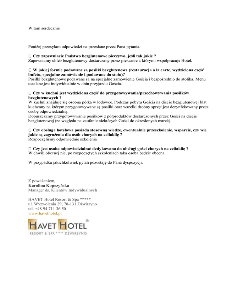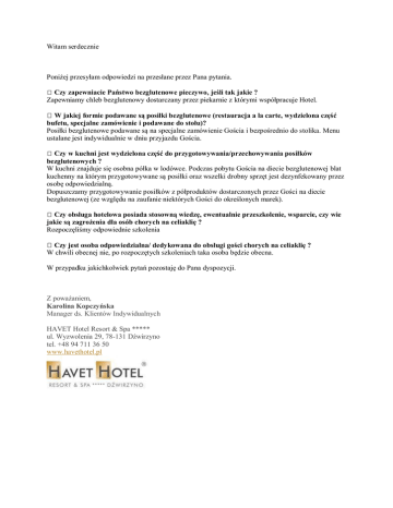 Witam serdecznie Poniżej przesyłam odpowiedzi na przesłane przez Pana pytania. Czy zapewniacie Państwo bezglutenowe pieczywo, jeśli tak jakie ? Zapewniamy chleb bezglutenowy dostarczany przez piekarnie z którymi współpracuje Hotel. W jakiej formie podawane są posiłki bezglutenowe (restauracja a la carte, wydzielona część bufetu, specjalne zamówienie i podawane do stołu)? Posiłki bezglutenowe podawane są na specjalne zamówienie Gościa i bezpośrednio do stolika. Menu ustalane jest indywidualnie w dniu przyjazdu Gościa. Czy w kuchni jest wydzielona część do przygotowywania/przechowywania posiłków bezglutenowych ? W kuchni znajduje się osobna półka w lodówce. Podczas pobytu Gościa na diecie bezglutenowej blat kuchenny na którym przygotowywane są posiłki oraz wszelki drobny sprzęt jest dezynfekowany przez osobę odpowiedzialną. Dopuszczamy przygotowywanie posiłków z półproduktów dostarczonych przez Gości na diecie bezglutenowej (ze względu na zaufanie niektórych Gości do określonych marek). Czy obsługa hotelowa posiada stosowną wiedzę, ewentualnie przeszkolenie, wsparcie, czy wie jakie są zagrożenia dla osób chorych na celiaklię ? Rozpoczęliśmy odpowiednie szkolenia Czy jest osoba odpowiedzialna/ dedykowana do obsługi gości chorych na celiaklię ? W chwili obecnej nie, po rozpoczętych szkoleniach taka osoba będzie obecna. W przypadku jakichkolwiek pytań pozostaję do Pana dyspozycji. Z poważaniem, Karolina Kopczyńska Manager ds. Klientów Indywidualnych HAVET Hotel Resort & Spa ***** ul. Wyzwolenia 29, 78-131 Dźwirzyno tel. +48 94 711 36 50 www.havethotel.pl