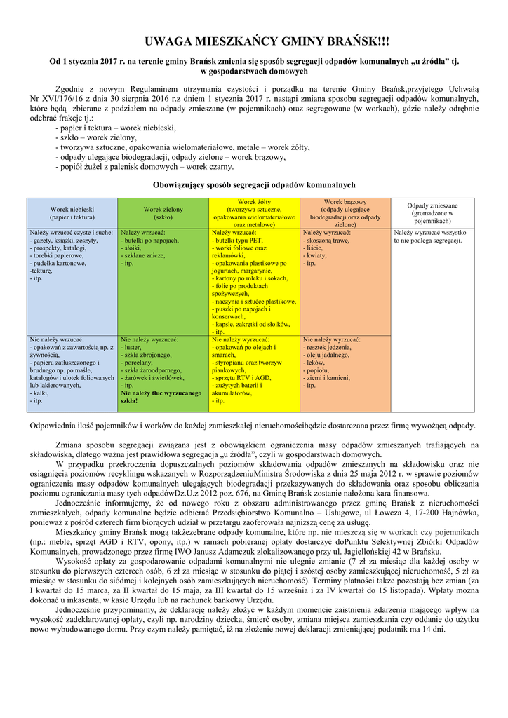 UWAGA MIESZKAŃCY GMINY BRAŃSK!!! Od 1 stycznia 2017 r. na terenie gminy Brańsk zmienia się sposób segregacji odpadów komunalnych „u źródła” tj. w gospodarstwach domowych Zgodnie z nowym Regulaminem utrzymania czystości i porządku na terenie Gminy Brańsk,przyjętego Uchwałą Nr XVI/176/16 z dnia 30 sierpnia 2016 r.z dniem 1 stycznia 2017 r. nastąpi zmiana sposobu segregacji odpadów komunalnych, które będą zbierane z podziałem na odpady zmieszane (w pojemnikach) oraz segregowane (w workach), gdzie należy odrębnie odebrać frakcje tj.: - papier i tektura – worek niebieski, - szkło – worek zielony, - tworzywa sztuczne, opakowania wielomateriałowe, metale – worek żółty, - odpady ulegające biodegradacji, odpady zielone – worek brązowy, - popiół żużel z palenisk domowych – worek czarny. Obowiązujący sposób segregacji odpadów komunalnych Worek niebieski (papier i tektura) Worek zielony (szkło) Należy wrzucać czyste i suche: - gazety, książki, zeszyty, - prospekty, katalogi, - torebki papierowe, - pudełka kartonowe, -tekturę, - itp. Należy wrzucać: - butelki po napojach, - słoiki, - szklane znicze, - itp. Nie należy wrzucać: - opakowań z zawartością np. z żywnością, - papieru zatłuszczonego i brudnego np. po maśle, katalogów i ulotek foliowanych lub lakierowanych, - kalki, - itp. Nie należy wyrzucać: - luster, - szkła zbrojonego, - porcelany, - szkła żaroodpornego, - żarówek i świetlówek, - itp. Nie należy tłuc wyrzucanego szkła! Worek żółty (tworzywa sztuczne, opakowania wielomateriałowe oraz metalowe) Należy wrzucać: - butelki typu PET, - worki foliowe oraz reklamówki, - opakowania plastikowe po jogurtach, margarynie, - kartony po mleku i sokach, - folie po produktach spożywczych, - naczynia i sztućce plastikowe, - puszki po napojach i konserwach, - kapsle, zakrętki od słoików, - itp. Nie należy wyrzucać: - opakowań po olejach i smarach, - styropianu oraz tworzyw piankowych, - sprzętu RTV i AGD, - zużytych baterii i akumulatorów, - itp. Worek brązowy (odpady ulegające biodegradacji oraz odpady zielone) Należy wyrzucać: - skoszoną trawę, - liście, - kwiaty, - itp. Odpady zmieszane (gromadzone w pojemnikach) Należy wyrzucać wszystko to nie podlega segregacji. Nie należy wyrzucać: - resztek jedzenia, - oleju jadalnego, - leków, - popiołu, - ziemi i kamieni, - itp. Odpowiednia ilość pojemników i worków do każdej zamieszkałej nieruchomościbędzie dostarczana przez firmę wywożącą odpady. Zmiana sposobu segregacji związana jest z obowiązkiem ograniczenia masy odpadów zmieszanych trafiających na składowiska, dlatego ważna jest prawidłowa segregacja „u źródła”, czyli w gospodarstwach domowych. W przypadku przekroczenia dopuszczalnych poziomów składowania odpadów zmieszanych na składowisku oraz nie osiągnięcia poziomów recyklingu wskazanych w RozporządzeniuMinistra Środowiska z dnia 25 maja 2012 r. w sprawie poziomów ograniczenia masy odpadów komunalnych ulegających biodegradacji przekazywanych do składowania oraz sposobu obliczania poziomu ograniczania masy tych odpadówDz.U.z 2012 poz. 676, na Gminę Brańsk zostanie nałożona kara finansowa. Jednocześnie informujemy, że od nowego roku z obszaru administrowanego przez gminę Brańsk z nieruchomości zamieszkałych, odpady komunalne będzie odbierać Przedsiębiorstwo Komunalno – Usługowe, ul Łowcza 4, 17-200 Hajnówka, ponieważ z pośród czterech firm biorących udział w przetargu zaoferowała najniższą cenę za usługę. Mieszkańcy gminy Brańsk mogą takżezebrane odpady komunalne, które np. nie mieszczą się w workach czy pojemnikach (np.: meble, sprzęt AGD i RTV, opony, itp.) w ramach pobieranej opłaty dostarczyć doPunktu Selektywnej Zbiórki Odpadów Komunalnych, prowadzonego przez firmę IWO Janusz Adamczuk zlokalizowanego przy ul. Jagiellońskiej 42 w Brańsku. Wysokość opłaty za gospodarowanie odpadami komunalnymi nie ulegnie zmianie (7 zł za miesiąc dla każdej osoby w stosunku do pierwszych czterech osób, 6 zł za miesiąc w stosunku do piątej i szóstej osoby zamieszkującej nieruchomość, 5 zł za miesiąc w stosunku do siódmej i kolejnych osób zamieszkujących nieruchomość). Terminy płatności także pozostają bez zmian (za I kwartał do 15 marca, za II kwartał do 15 maja, za III kwartał do 15 września i za IV kwartał do 15 listopada). Wpłaty można dokonać u inkasenta, w kasie Urzędu lub na rachunek bankowy Urzędu. Jednocześnie przypominamy, że deklarację należy złożyć w każdym momencie zaistnienia zdarzenia mającego wpływ na wysokość zadeklarowanej opłaty, czyli np. narodziny dziecka, śmierć osoby, zmiana miejsca zamieszkania czy oddanie do użytku nowo wybudowanego domu. Przy czym należy pamiętać, iż na złożenie nowej deklaracji zmieniającej podatnik ma 14 dni.