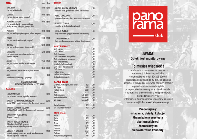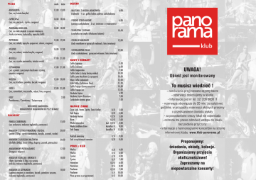 ma³a - MARGHERITA (sos, ser, œwie¿a bazylia) 11,00 13,00 - NALEŒNIK Z MUSEM JAB£KOWYM (naleœnik - 1 szt, ga³ka lodów, polewa czekoladowa) - CAPRICIOSA (sos, ser, pieczarki, szynka, oregano) 14,00 18,00 - PIEROGI CZEKOLADOWE 6,00 (pierogi czekoladowe - 3 szt, œmietana z cynamonem) - PANORAMA MEXICANA (ser, sos meksykañski z miêsem mielonym, fasol¹ czerwon¹, kukurydz¹, papryk¹ chilli) 14,00 18,00 du¿a - SZARLOTKA Z LODAMI (szarlotka na ciep³o ch³odzona lodami) 6,00 10,00 - PEPPERONI 15,00 19,00 (sos, ser, cebula, papryka pepperoni, salami, oregano) - CELINA W MALINACH 12,00 (lody waniliowe w gor¹cych malinach, bita œmietana) - VESUVIO (sos, ser, salami, œwie¿a bazylia, oregano) 14,00 17,00 - CZEKOLADOWA PASJA 12,00 (lody czekoladowe z goracymi wiœniami, bita œmietana) - RUCOLLA (sos, ser, szynka parmeñska, œwie¿a rucola) 17,00 21,00 - SZPINAKOWA (ser, szpinak z pieczonym boczkiem i szynk¹, pomidor, oregano) 17,00 21,00 - WIEJSKA (sos, ser, kie³basa, pomidor, boczek, oregano) 15,00 20,00 - SERY 4 (sos, camembert, mozzarella, rokpol, feta, oregano) 17,00 21,00 - SOSY Pomidorowy / Czosnkowy / Tysi¹ca wysp 2,00 MO¯LIWOŒÆ ZAMÓWIENIA DODATKOWYCH SK£ADNIKÓW DO PIZZY W BARZE MAKARONY - FAMILIA CARBONARA (sos carbonara, makaron tagliatelle, parmezan) 15,00 20,00 - MAKARON Z SZYNK¥ PARMEÑSK¥ i RUCOL¥ (penne (200g), szynka parmeñska, bazylia, czosnek, rucola) - MAKARON Z £OSOSIEM SMA¯ONYM (farfalle (200g), ³osoœ (100g), kapary, czosnek, pietruszka) 20,00 - MAKARONOWY PRZEK£ADANIEC (lasagne z miêsem) 17,00 - MAKARON (KURCZAK i BROKU£Y) (filet z kurczaka (120g), sos serowy, broku³y, makaron tagliatelle, parmezan) 18,00 - MAKARON ZE SZPINAKIEM (szpinak sma¿ony z czosnkiem, boczek, pomidory suszone, makaron tagliatelle, parmezan) 18,00 KAWY i HERBATY Caffe Espresso Caffe Cremme Caffe Cappuccino Caffe Latte (z du¿¹ iloœci¹ mleka) Caffe Latte Machiato (z syropem) Wien Coffe (adwokat) Irish Coffe (Tullamore Dew) Caffe Frappe (kawa mro¿ona) Caffe Frappe Ice Herbata Lipton Herbata Lipton Premium Czekolada ciemna gêsta NAPOJE ZIMNE Coca Cola, Fanta, Sprite, Tonic Kinley Sok Cappy Herbata Nestea Burn Woda mineralna Woda Ÿródlana Eden Sok Cappy grudzieñ 2013 DESERY PIZZA 5,00 6,00 7,00 10,00 10,00 12,00 15,00 10,00 12,00 6,00 7,00 7,00 0,2l 0,2l 0,25l 0,25l but. 0,25l karafka 1l karafka 1l 5,00 5,00 5,00 7,00 4,00 8,00 12,00 Koktail owocowy Sok z wyciskanych owoców 0,5l 0,3l 9,00 9,00 PIWO z KIJA Warka Warka ¯ywiec ¯ywiec Heineken Heineken Paulaner Paulaner Piwo grzane z przyprawami 0,3l 0,5l 0,3l 0,5l 0,25l 0,5l 0,33l 0,5l 0,5l 4,00 6,00 4,00 7,00 6,00 8,00 7,00 10,00 10,00 UWAGA! Obiekt jest monitorowany To musisz wiedzieæ ! - zamówienia przyjmowane s¹ przy barze - rezerwacji dokonujemy w klubie - Informacje pod nr tel. 32/ 206 6000 /1 - rezerwacja obowi¹zuje do 20 min. po ustalonej godzinie, w przypadku rezerwacji p³atnych prosimy o przedstawienie dowodu wp³aty - za pozostawione rzeczy lokal nie odpowiada - ochrona ma prawo odmówiæ wstêpu do lokalu bez podania przyczyny - informacje o harmonogramie koncertów na stronie internetowej klubu www.klub-panorama.pl Proponujemy: œniadania, obiady, kolacje. Organizujemy przyjêcia okolicznoœciowe! Zapraszamy na niepowtarzalne koncerty! z P.R.L. - MIELONE - Karminadle (kotlety mielone - 2szt, puree ziemniaczane, buraczki) 15,00 - KOTLET Z GONDOLI (sma¿ony ser w panierce, frytki, sos tatarski) 15,00 - FRYKAS BAROWY (w¹tróbka drobiowa (200g) z cebulk¹, puree ziemniaczane, ogórek kiszony) 15,00 DO PIWA - PIECZONY CHLEB (grzanki z mas³em czosnkowym - 4 szt ) 6,00 - PRZYSMAK ECIKA DO PIWA (prosto z pieca paluchy z mas³em czosnkowym - 10 szt) 8,00 - SCYPKI OSMOLONE (oscypki pieczone - 3 szt z ¿urawin¹) - CHLEB ZE SMALCEM (chleb 2-3 kromki, smalec) KARTKOWE ZESTAWY OBIADOWE DRÓB RYBY - KOKOTA W SZYNCE PARMEÑSKIEJ II 25,00 (filet z grilla (120g), ziemniaki pieczone, pomidory marynowane, mas³o czosnkowe) - P£AT £OSOSIA (filet z ³ososia sma¿ony wg wagi z mas³em i cytryn¹) 100g 15,00 - £OSOŒ W ZIO£ACH (filet z ³ososia w zio³owej panierce wg wagi, cytryna) 100g 15,00 - DORSZ PREMIUM (dorsz z grilla wg wagi, zapiekany z pomidorami i serem) 100g 15,00 - KOKOTA W PARMEZANIE 26,00 (filet z kurczaka (160g) sma¿ony w parmezanie, ziemniaki pieczone, surówka, sos s³odko - kwaœny) - KURKA Z PODWÓRKA (panierowany filet z kurczaka (160g), ziemniaki puree, surówka) 22,00 - KOKOTA SEROWO - POMIDOROWA (filet z kurczaka (120g), zapiekany z mozarell¹ i pomidorami, puree ziemniacznae ze szpinakiem) 25,00 5,00 POD WÓDKÊ - KAPUŒ (œledŸ (70g) z ogórkiem kiszonym i koperkiem) 6,00 - ŒLED ŒLISKI (œledŸ (70g) w zalewie musztardowo-miodowej) 6,00 - ŒLED BIA£Y (œledŸ (70g) w œmietanie z cebulk¹) 6,00 - GALARETKA Z NÓ¯EK - GALERT (nó¿ki w galarecie (150g) z chrzanem) 6,00 NA MOKRO - NIEDZIELNA ZUPA (rosó³ z makaronem lub ko³dunami) 7,00 - CZERWONY BARSZCZ (czysty) 4,00 - CZERWONY BARSZCZ Z WK£ADK¥ (barszcz z krokietem) 8,00 - ZABIELANY BARSZCZ Z WYSP¥ (barszcz zabielany z puree ziemniaczanym) 7,00 - ZUPA MAÑKI Z MLECZARNI (zupa serowa z grzankami) 7,00 - DIABELSKO ZUPKA Z PANORAMY (na ostro) (zupa z czerwonych warzyw i mielonego miêsa na ostro) 8,00 - SZED£ ANTEK PO ... (¯urek z puree ziemniaczanym) 8,00 - DORSZ ZAPIEKANY W PORACH 100g 15,00 (dorsz z grilla wg wagi zapiekany w porach z sosem serowym) SA£ATKOWE BREWERIE - NIEDZIELA ŒL¥ZAKA (tradycyjna rolada (150g), kluski œl¹skie, modra kapusta) 32,00 - HELA(S) POTRAFI ! (sa³ata, pomidor, ogórek zielony, oliwki, ser feta, sos vinaigrette) 15,00 - CHUCK NORRIS STEAK (antrykot z grilla (150g), sos barbecue, ziemniaki pieczone, pomidory marynowane) 32,00 - KOKOTA W SA£ACIE Z BOCZKIEM (Du¿a) (sa³ata, pomidor, ogórek zielony, kurczak, boczek, sos vinaigrette) 20,00 - Sgt. PEPPERS STEAK II (antrykot z grilla (150g), sma¿ony w kolorowym pieprzu, mas³o czosnkowe, ziemniaki pieczone, surówka) 32,00 - CARPACCIO Z WO£OWI