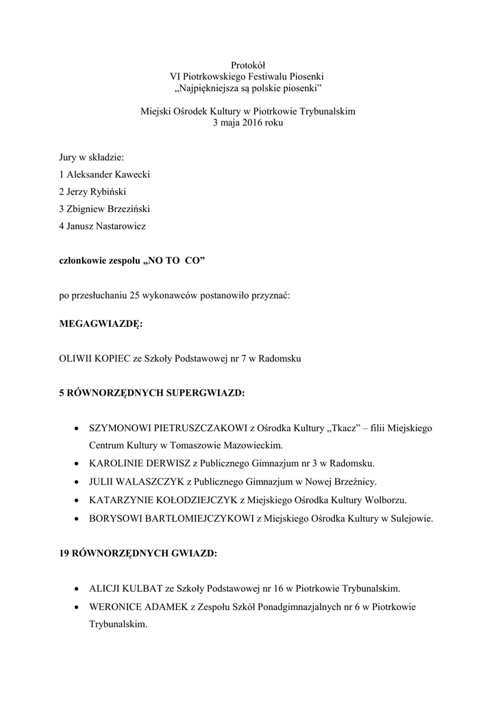 Protokół VI Piotrkowskiego Festiwalu Piosenki „Najpiękniejsza są polskie piosenki” Miejski Ośrodek Kultury w Piotrkowie Trybunalskim 3 maja 2016 roku Jury w składzie: 1 Aleksander Kawecki 2 Jerzy Rybiński 3 Zbigniew Brzeziński 4 Janusz Nastarowicz członkowie zespołu „NO TO CO” po przesłuchaniu 25 wykonawców postanowiło przyznać: MEGAGWIAZDĘ: OLIWII KOPIEC ze Szkoły Podstawowej nr 7 w Radomsku 5 RÓWNORZĘDNYCH SUPERGWIAZD:  SZYMONOWI PIETRUSZCZAKOWI z Ośrodka Kultury „Tkacz” – filii Miejskiego Centrum Kultury w Tomaszowie Mazowieckim.  KAROLINIE DERWISZ z Publicznego Gimnazjum nr 3 w Radomsku.  JULII WALASZCZYK z Publicznego Gimnazjum w Nowej Brzeźnicy.  KATARZYNIE KOŁODZIEJCZYK z Miejskiego Ośrodka Kultury Wolborzu.  BORYSOWI BARTŁOMIEJCZYKOWI z Miejskiego Ośrodka Kultury w Sulejowie. 19 RÓWNORZĘDNYCH GWIAZD:  ALICJI KULBAT ze Szkoły Podstawowej nr 16 w Piotrkowie Trybunalskim.  WERONICE ADAMEK z Zespołu Szkół Ponadgimnazjalnych nr 6 w Piotrkowie Trybunalskim.  PATRYCJI MAKOWSKIEJ ze Szkoły Podstawowej nr10 w Tomaszowie Mazowieckim.  JOANNIE KLUF ze Stowarzyszenia Simare „Edukacja przez sztukę” z Piotrkowa Trybunalskiego.  JOLANCIE KLUZOWSKIEJ z Miejskiego Ośrodka Kultury w Wolborzu.  AMELII JĘDRYCHOWICZ z Zespołu Szkolno – Gimnazjalnego nr 2 w Tomaszowie Mazowieckim.  MIŁOSZOWI NAWROCKIEMU z Gminnego Ośrodka Kultury w Gidlach.  NATALII KOPYCIŃSKIEJ z Domu Kultury „Zameczek” w Kielcach.  EMILII ROKICIE z Gminnego Ośrodka Kultury w Gidlach.  NATASZY BARTŁOMIEJCZYK z Miejskiego Ośrodka Kultury w Sulejowie.  PIOTROWI SANKOWSKIEMU z Forum Inicjatyw Twórczych w Parzęczewie.  MARTYNIE SUJCE ze Szkoły Wokalnej „Beautiful Voice” z Łodzi.  BARBARZE MOROŃ z Zespołu Szkolno – Gimnazjalnego w Pławnie.  WIKTORII WOŹNIACKIEJ ze Szkoły Wokalnej „Beautiful Voice” z Łodzi.  ALEKSANDRZE WRONIE ze Stowarzyszenia Simare „Edukacja przez sztukę” z Piotrkowa Trybunalskiego.  MARII PRZYBYLSKIEJ ze Szkoły Podstawowej nr 101 w Łodzi.  SANDRZE MAKOWSKIEJ z Miejskiego Centrum Kultury w Tomaszowie Mazowieckim.  MARII MARKIEWICZ z Gminnego Ośrodka Kultury w Gidlach.  JULII IWANICKIEJ z Ośrodka Kultury „Tkacz” – filii Miejskiego Centrum Kultury w Tomaszowie Mazowieckim. JURY: