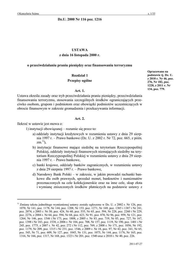©Kancelaria Sejmu s. 1/33 Dz.U. 2000 Nr 116 poz. 1216 USTAWA z dnia 16 listopada 2000 r. o przeciwdziałaniu praniu pieniędzy oraz finansowaniu terroryzmu Rozdział 1 Przepisy ogólne Art. 1. Ustawa określa zasady oraz tryb przeciwdziałania praniu pieniędzy, przeciwdziałania finansowaniu terroryzmu, stosowania szczególnych środków ograniczających przeciwko osobom, grupom i podmiotom oraz obowiązki podmiotów uczestniczących w obrocie finansowym w zakresie gromadzenia i przekazywania informacji. Art. 2. Ilekroć w ustawie jest mowa o: 1) instytucji obowiązanej – rozumie się przez to: a) oddziały instytucji kredytowych w rozumieniu ustawy z dnia 29 sierpnia 1997 r. – Prawo bankowe (Dz. U. z 2002 r. Nr 72, poz. 665, z późn. zm.1)), b) instytucje finansowe mające siedzibę na terytorium Rzeczypospolitej Polskiej, oddziały instytucji finansowych niemających siedziby na terytorium Rzeczypospolitej Polskiej w rozumieniu ustawy z dnia 29 sierpnia 1997 r. – Prawo bankowe, c) banki krajowe, oddziały banków zagranicznych, w rozumieniu ustawy z dnia 29 sierpnia 1997 r. – Prawo bankowe, d) Narodowy Bank Polski – w zakresie, w jakim prowadzi rachunki bankowe dla osób prawnych, sprzedaż monet, banknotów i numizmatów przeznaczonych na cele kolekcjonerskie oraz na inne cele, skup złota i wymianę zniszczonych środków płatniczych na podstawie ustawy z 1) Zmiany tekstu jednolitego wymienionej ustawy zostały ogłoszone w Dz. U. z 2002 r. Nr 126, poz. 1070, Nr 141, poz. 1178, Nr 144, poz. 1208, Nr 153, poz. 1271, Nr 169, poz. 1385 i 1387 i Nr 241, poz. 2074, z 2003 r. Nr 50, poz. 424, Nr 60, poz. 535, Nr 65, poz. 594, Nr 228, poz. 2260 i Nr 229, poz. 2276, z 2004 r. Nr 64, poz. 594, Nr 68, poz. 623, Nr 91, poz. 870, Nr 96, poz. 959, Nr 121, poz. 1264, Nr 146, poz. 1546 i Nr 173, poz. 1808, z 2005 r. Nr 83, poz. 719, Nr 85, poz. 727, Nr 167, poz. 1398 i Nr 183, poz. 1538, z 2006 r. Nr 104, poz. 708, Nr 157, poz. 1119, Nr 190, poz. 1401 i Nr 245, poz. 1775, z 2007 r. Nr 42, poz. 272 i Nr 112, poz. 769, z 2008 r. Nr 171, poz. 1056, Nr 192, poz. 1179, Nr 209, poz. 1315 i Nr 231, poz. 1546, z 2009 r. Nr 18, poz. 97, Nr 42, poz. 341, Nr 65, poz. 545, Nr 71, poz. 609, Nr 127, poz. 1045, Nr 131, poz. 1075, Nr 144, poz. 1176, Nr 165, poz. 1316, Nr 166, poz. 1317, Nr 168, poz. 1323 i Nr 201, poz. 1540 oraz z 2010 r. Nr 40, poz. 226. 2011-07-27 Opracowano na podstawie tj. Dz. U. z 2010 r. Nr 46, poz. 276, Nr 182, poz. 1228, z 2011 r. Nr 134, poz. 779. ©Kancelaria Sejmu s. 2/33 dnia 29 sierpnia 1997 r. o Narodowym Banku Polskim (Dz. U. z 2005 r. Nr 1, poz. 2, z późn. zm.2)), e) instytucje pieniądza elektronicznego, oddziały zagranicznych instytucji pieniądza elektronicznego oraz agentów rozliczeniowych, prowadzących działalność na podstawie ustawy z dnia 12 września 2002 r. o elektronicznych instrumentach płatniczych (Dz. U. Nr 169, poz. 1385, z późn. zm.3)), f) firmy inwestycyjne, banki powiernicze, w rozumieniu ustawy z dnia 29 lipca 2005 r. o obrocie instrumentami finansowymi (Dz. U. Nr 183, poz. 1538, z późn. zm.4)), g) zagraniczne osoby prawne prowadzące na terytorium Rzeczypospolitej Polskiej działalność maklerską oraz towarowe domy maklerskie w rozumieniu ustawy z dnia 26 października 2000 r. o giełdach towarowych (Dz. U. z 2005 r. Nr 121, poz. 1019, z późn. zm.5)) oraz spółki handlowe, o których mowa w art. 50a tej ustawy, h) Krajowy Depozyt Papierów Wartościowych S.A. – w zakresie, w jakim prowadzi rachunki papierów wartościowych, [i) podmioty prowadzące działalność – w zakresie gier losowych, zakładów wzajemnych i gier na automatach oraz gier na automatach o niskich wygranych,] <i) podmioty prowadzące działalność w zakresie gier losowych, zakładów wzajemnych i gier na automatach,> j) zakłady ubezpieczeń w zakresie ubezpieczeń na życie, w tym ubezpieczycieli krajowych, główne oddziały ubezpieczycieli z państwa niebędącego członkiem Unii Europejskiej, oddziały ubezpieczycieli z państwa członkowskiego Unii Europejskiej, pośredników ubezpieczeniowych w zakresie ubezpieczeń na życie, chyba że za ich działania odpowiedzialność ponosi ubezpieczyciel, k) fundusze inwestycyjne, towarzystwa funduszy inwestycyjnych, w rozumieniu ustawy z dnia 27 maja 2004 r. o funduszach inwestycyjnych (Dz. U. Nr 146, poz. 1546, z późn. zm.6)), l) spółdzielcze kasy oszczędnościowo-kredytowe, m) publicznego operatora w rozumieniu ustawy z dnia 12 czerwca 2003 r. – Prawo pocztowe (Dz. U. z 2008 r. Nr 189, poz. 1159 oraz z 2009 r. Nr 18, poz. 97 i Nr 168, poz. 1323), 2) Zmiany tekstu jednolitego wymienionej ustawy zostały ogłoszone w Dz. U. z 2005 r. Nr 167, poz. 1398, z 2006 r. Nr 157, poz. 1119, z 2007 r. Nr 25, poz. 162 i Nr 61, poz. 410, z 2008 r. Nr 209, poz. 1315 i 1317 oraz z 2009 r. Nr 69, poz. 589 i Nr 143, poz. 1164. 3) Zmiany wymienionej ustawy zostały ogłoszone w Dz. U. z 2004 r. Nr 91, poz. 870 i Nr 96, poz. 959, z 2006 r. Nr 157, poz. 1119, z 2008 r. Nr 171, poz. 1056 oraz z 2009 r. Nr 18, poz. 97. 4) Zmiany wymienionej ustawy zostały ogłoszone w Dz. U. z 2006 r. Nr 104, poz. 708 i Nr 157, poz. 1119, z 2008 r. Nr 171, poz. 1056, z 2009 r. Nr 13, poz. 69, Nr 42, poz. 341, Nr 77, poz. 649, Nr 78, poz. 659, Nr 165, poz. 1316, Nr 166, poz. 1317, Nr 168, poz. 1323, Nr 201, poz. 1540 i Nr 223, poz. 1776 oraz z 2010 r. Nr 44, poz. 252. 5) Zmiany tekstu jednolitego wymienionej ustawy zostały ogłoszone w Dz. U. z 2005 r. Nr 183, poz. 1537 i 1538, z 2006 r. Nr 157, poz. 1119, z 2007 r. Nr 112, poz. 769, z 2008 r. Nr 171, poz. 1056, z 2009 r. Nr 165, poz. 1316, Nr 168, poz. 1323 i Nr 201, poz. 1540 oraz z 2010 r. Nr 21, poz. 104. 6) Zmiany wymienionej ustawy zostały ogłoszone w Dz. U. z 2005 r. Nr 83, poz. 719, Nr 183, poz. 1537 i 1538 i Nr 184, poz. 1539, z 2006 r. Nr 157, poz. 1119, z 2007 r. Nr 112, poz. 769, z 2008 r. Nr 231, poz. 1546 oraz z 2009 r. Nr 18, poz. 97, Nr 42, poz. 341, Nr 168, poz. 1323 i Nr 