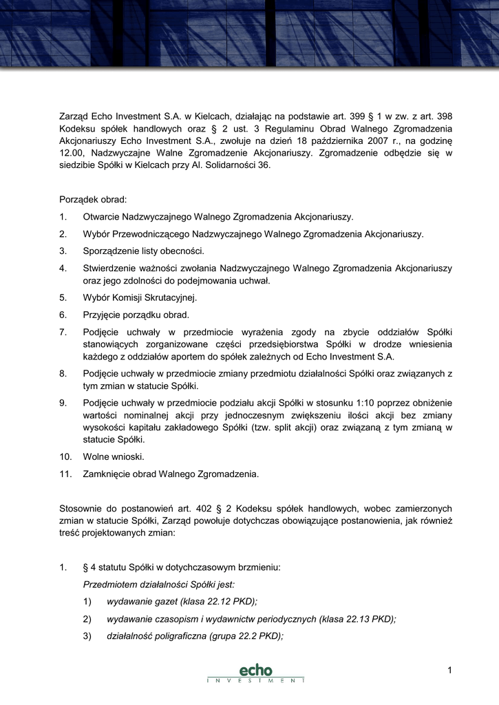 Zarząd Echo Investment S.A. w Kielcach, działając na podstawie art. 399 § 1 w zw. z art. 398 Kodeksu spółek handlowych oraz § 2 ust. 3 Regulaminu Obrad Walnego Zgromadzenia Akcjonariuszy Echo Investment S.A., zwołuje na dzień 18 października 2007 r., na godzinę 12.00, Nadzwyczajne Walne Zgromadzenie Akcjonariuszy. Zgromadzenie odbędzie się w siedzibie Spółki w Kielcach przy Al. Solidarności 36. Porządek obrad: 1. Otwarcie Nadzwyczajnego Walnego Zgromadzenia Akcjonariuszy. 2. Wybór Przewodniczącego Nadzwyczajnego Walnego Zgromadzenia Akcjonariuszy. 3. Sporządzenie listy obecności. 4. Stwierdzenie ważności zwołania Nadzwyczajnego Walnego Zgromadzenia Akcjonariuszy oraz jego zdolności do podejmowania uchwał. 5. Wybór Komisji Skrutacyjnej. 6. Przyjęcie porządku obrad. 7. Podjęcie uchwały w przedmiocie wyrażenia zgody na zbycie oddziałów Spółki stanowiących zorganizowane części przedsiębiorstwa Spółki w drodze wniesienia każdego z oddziałów aportem do spółek zależnych od Echo Investment S.A. 8. Podjęcie uchwały w przedmiocie zmiany przedmiotu działalności Spółki oraz związanych z tym zmian w statucie Spółki. 9. Podjęcie uchwały w przedmiocie podziału akcji Spółki w stosunku 1:10 poprzez obniżenie wartości nominalnej akcji przy jednoczesnym zwiększeniu ilości akcji bez zmiany wysokości kapitału zakładowego Spółki (tzw. split akcji) oraz związaną z tym zmianą w statucie Spółki. 10. Wolne wnioski. 11. Zamknięcie obrad Walnego Zgromadzenia. Stosownie do postanowień art. 402 § 2 Kodeksu spółek handlowych, wobec zamierzonych zmian w statucie Spółki, Zarząd powołuje dotychczas obowiązujące postanowienia, jak również treść projektowanych zmian: 1. § 4 statutu Spółki w dotychczasowym brzmieniu: Przedmiotem działalności Spółki jest: 1) wydawanie gazet (klasa 22.12 PKD); 2) wydawanie czasopism i wydawnictw periodycznych (klasa 22.13 PKD); 3) działalność poligraficzna (grupa 22.2 PKD); 1 4) przygotowanie terenu pod budowę (grupa 45.1 PKD); 5) wznoszenie kompletnych obiektów budowlanych lub ich części: inżynieria lądowa i wodna (grupa 45.2 PKD); 6) wykonywanie instalacji budowlanych (grupa 45.3 PKD); 7) wykonywanie robót budowlanych wykończeniowych (grupa 45.4 PKD); 8) wynajem sprzętu budowlanego i burzącego z obsługą operatorską (grupa 45.5 PKD); 9) pozostałe pośrednictwo pieniężne, gdzie indziej nie sklasyfikowane (podklasa 65.12.B PKD); 10) pozostałe pośrednictwo finansowe (grupa 65.2 PKD); 11) obsługa nieruchomości na własny rachunek (grupa 70.1 PKD); 12) wynajem nieruchomości na własny rachunek (grupa 70.2 PKD); 13) obsługa nieruchomości na zlecenie (grupa 70.3 PKD); 14) działalność prawnicza, rachunkowo – księgowa; doradztwo; zarządzanie holdingami (grupa 74.1 PKD); 15) reklama (grupa 74.4 PKD); 16) działalność w zakresie architektury i inżynierii (grupa 74.2 PKD); 17) działalność w zakresie projektowania technologicznego (grupa 74.20.A PKD); 18) działalność geodezyjna i kartograficzna (grupa 74.20.C PKD); 19) rolnictwo, łowiectwo i leśnictwo (sekcja A PKD); 20) rolnictwo, łowiectwo, włączając działalność usługową (grupa 01 PKD).” budowlanego, urbanistycznego, otrzyma następujące brzmienie: Przedmiotem działalności Spółki jest: 1) rolnictwo, łowiectwo i leśnictwo (sekcja A PKD); 2) wydawanie gazet (klasa 22.12 PKD); 3) wydawanie czasopism i wydawnictw periodycznych (klasa 22.13 PKD); 4) działalność poligraficzna (grupa 22.2 PKD); 5) przygotowanie terenu pod budowę (grupa 45.1 PKD); 6) wznoszenie kompletnych obiektów budowlanych lub ich części: inżynieria lądowa i wodna (grupa 45.2 PKD); 7) wykonywanie instalacji budowlanych (grupa 45.3 PKD); 8) wykonywanie robót budowlanych wykończeniowych (grupa 45.4 PKD); 2 2. 9) wynajem sprzętu budowlanego i burzącego z obsługą operatorską (grupa 45.5 PKD); 10) pozostałe pośrednictwo pieniężne, gdzie indziej nie sklasyfikowane (podklasa 65.12.B PKD); 11) pozostałe pośrednictwo finansowe (grupa 65.2 PKD); 12) obsługa nieruchomości na własny rachunek (grupa 70.1 PKD); 13) wynajem nieruchomości na własny rachunek (grupa 70.2 PKD); 14) obsługa nieruchomości na zlecenie (grupa 70.3 PKD); 15) wynajem samochodów osobowych (grupa 71.10.Z PKD); 16) wynajem pozostałych środków transportu lądowego (grupa 71.21.Z PKD); 17) wynajem maszyn i urządzeń (grupa 71.3 PKD); 18) działalność prawnicza, rachunkowo – księgowa; doradztwo; zarządzanie holdingami (grupa 74.1 PKD); 19) reklama (grupa 74.4 PKD); 20) działalność w zakresie architektury i inżynierii (grupa 74.2 PKD); 21) działalność w zakresie projektowania budowlanego, urbanistycznego, technologicznego (grupa 74.20.A PKD); 22) działalność geodezyjna i kartograficzna (grupa 74.20.C PKD).” § 5 statutu Spółki w dotychczasowym brzmieniu: „Kapitał zakładowy Spółki wynosi 21.000.000 zł (dwadzieścia jeden milionów) złotych i dzieli się na: - 160.000 (sto sześćdziesiąt tysięcy) akcji zwykłych, na okaziciela, serii A o wartości nominalnej po 50 (pięćdziesiąt) groszy każda; - 3.840.000 (trzy miliony osiemset czterdzieści tysięcy) akcji zwykłych, na okaziciela, serii B o wartości nominalnej po 50 (pięćdziesiąt) groszy każda; - 2.000.000 ( dwa miliony) akcji zwykłych, na okaziciela, serii C o wartości nominalnej po 50 (pięćdziesiąt) groszy każda; - 6.000.000 (sześć milionów) akcji zwykłych, na okaziciela, serii D o wartości nominalnej po 50 (pięćdziesiąt) groszy każda; - 2.000.000 (dwa miliony) akcji zwykłych, na okaziciela, serii E o wartości nominalnej po 50 (pięćdziesiąt) groszy każda; - 28.000.000 (dwadzieścia osiem milionów) akcji zwykłych, na okaziciela, serii F o wartości nominalnej po 50 (pięćdziesiąt) groszy każda”. 3 otrzyma następujące brzmienie: „Kapitał zakładowy Spółki wynosi 21.000.000 zł (dwadzieścia jeden milionów) złotych i dzieli