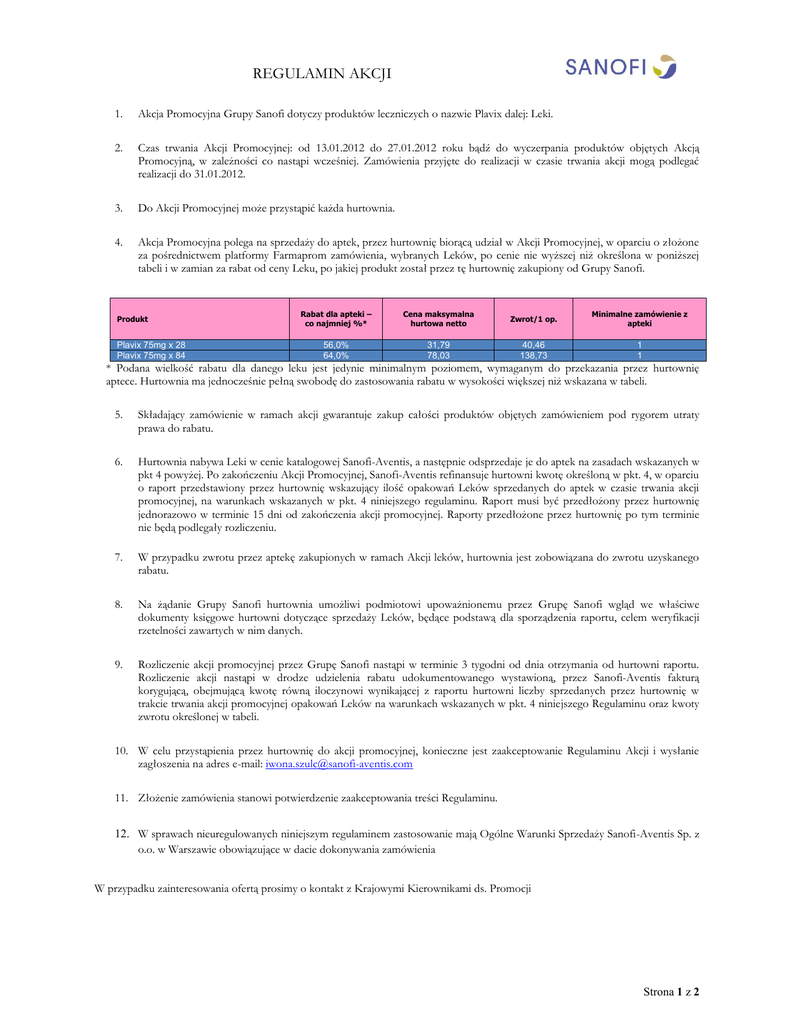 REGULAMIN AKCJI 1. Akcja Promocyjna Grupy Sanofi dotyczy produktów leczniczych o nazwie Plavix dalej: Leki. 2. Czas trwania Akcji Promocyjnej: od 13.01.2012 do 27.01.2012 roku bądź do wyczerpania produktów objętych Akcją Promocyjną, w zależności co nastąpi wcześniej. Zamówienia przyjęte do realizacji w czasie trwania akcji mogą podlegać realizacji do 31.01.2012. 3. Do Akcji Promocyjnej może przystąpić każda hurtownia. 4. Akcja Promocyjna polega na sprzedaży do aptek, przez hurtownię biorącą udział w Akcji Promocyjnej, w oparciu o złożone za pośrednictwem platformy Farmaprom zamówienia, wybranych Leków, po cenie nie wyższej niż określona w poniższej tabeli i w zamian za rabat od ceny Leku, po jakiej produkt został przez tę hurtownię zakupiony od Grupy Sanofi. Produkt Plavix 75mg x 28 Plavix 75mg x 84 Rabat dla apteki – co najmniej %* Cena maksymalna hurtowa netto Zwrot/1 op. Minimalne zamówienie z apteki 56,0% 64,0% 31,79 78,03 40,46 138,73 1 1 * Podana wielkość rabatu dla danego leku jest jedynie minimalnym poziomem, wymaganym do przekazania przez hurtownię aptece. Hurtownia ma jednocześnie pełną swobodę do zastosowania rabatu w wysokości większej niż wskazana w tabeli. 5. Składający zamówienie w ramach akcji gwarantuje zakup całości produktów objętych zamówieniem pod rygorem utraty prawa do rabatu. 6. Hurtownia nabywa Leki w cenie katalogowej Sanofi-Aventis, a następnie odsprzedaje je do aptek na zasadach wskazanych w pkt 4 powyżej. Po zakończeniu Akcji Promocyjnej, Sanofi-Aventis refinansuje hurtowni kwotę określoną w pkt. 4, w oparciu o raport przedstawiony przez hurtownię wskazujący ilość opakowań Leków sprzedanych do aptek w czasie trwania akcji promocyjnej, na warunkach wskazanych w pkt. 4 niniejszego regulaminu. Raport musi być przedłożony przez hurtownię jednorazowo w terminie 15 dni od zakończenia akcji promocyjnej. Raporty przedłożone przez hurtownię po tym terminie nie będą podlegały rozliczeniu. 7. W przypadku zwrotu przez aptekę zakupionych w ramach Akcji leków, hurtownia jest zobowiązana do zwrotu uzyskanego rabatu. 8. Na żądanie Grupy Sanofi hurtownia umożliwi podmiotowi upoważnionemu przez Grupę Sanofi wgląd we właściwe dokumenty księgowe hurtowni dotyczące sprzedaży Leków, będące podstawą dla sporządzenia raportu, celem weryfikacji rzetelności zawartych w nim danych. 9. Rozliczenie akcji promocyjnej przez Grupę Sanofi nastąpi w terminie 3 tygodni od dnia otrzymania od hurtowni raportu. Rozliczenie akcji nastąpi w drodze udzielenia rabatu udokumentowanego wystawioną, przez Sanofi-Aventis fakturą korygującą, obejmującą kwotę równą iloczynowi wynikającej z raportu hurtowni liczby sprzedanych przez hurtownię w trakcie trwania akcji promocyjnej opakowań Leków na warunkach wskazanych w pkt. 4 niniejszego Regulaminu oraz kwoty zwrotu określonej w tabeli. 10. W celu przystąpienia przez hurtownię do akcji promocyjnej, konieczne jest zaakceptowanie Regulaminu Akcji i wysłanie zagłoszenia na adres e-mail: [email protected] 11. Złożenie zamówienia stanowi potwierdzenie zaakceptowania treści Regulaminu. 12. W sprawach nieuregulowanych niniejszym regulaminem zastosowanie mają Ogólne Warunki Sprzedaży Sanofi-Aventis Sp. z o.o. w Warszawie obowiązujące w dacie dokonywania zamówienia W przypadku zainteresowania ofertą prosimy o kontakt z Krajowymi Kierownikami ds. Promocji Strona 1 z 2 Cardio – Paweł Szczuka tel. 508030874 Gastro –Eugeniusz Pytel tel. 502736917 Apteczny –Sławomir Kamiński tel. 507008406 Alergo, Specjalistyczny – Izabella Olszewska tel. 607370679 Strona 2 z 2