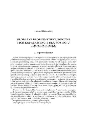 Andrzej Kassenberg GLOBALNe PROBLEMy EKOLOGICZNe i ich konsekwencje dla ROZWOJU GOSPODARCZEGO 1. Wprowadzenie Celem niniejszego opracowania jest ukazanie najbardziej palących globalnych problemów ekologicznych w kontekście wyzwań, jakie stawiają one przed obecną i przyszłą gospodarką. Skala tych problemów z roku na rok staje się coraz bardziej poważna i można zaryzykować stwierdzenie, że świat stanął przed widmem kryzysu ekologicznego mogącego w istotny sposób zaburzyć funkcjonowanie gospodarek poszczególnych krajów, jak też prowadzić do poważnych problemów społecznych na niewyobrażalną dzisiaj skalę. W coraz większym stopniu przenosimy rozwiązywanie tych problemów na przyszłe pokolenia, gdyż funkcjonujące obecnie systemy polityczno-gospodarcze oraz mechanizmy finansowe pod tym względem nie wspierają w wystarczający sposób interesów naszych dzieci i wnuków. One bowiem będą ponosić skutki zaniechania i związane z tym koszty, których my w imię przyszłych korzyści nie chcemy ponosić. Na tle tych rozważań rodzi się pytanie, w jakim stopniu powinniśmy uwzględniać interes przyszłych pokoleń, a w jakim one powinny radzić sobie same – gdzie jest tzw. granica sprawiedliwości międzypokoleniowej. Istnieje bardzo bogata literatura na temat globalnych problemów ekologicznych. Jej przykładem może być opracowanie opublikowane na początku 2009 r. przez Europejską Agencję Środowiska, w którym zidentyfikowano osiem kluczowych problemów, z jakimi w najbliższym czasie musi poradzić sobie Unia Europejska. Zaliczono do nich (Kluczowe problemy… 2009): 1)ograniczenie emisji gazów cieplarnianych, 2)adaptację do skutków zmian klimatycznych, 136 Andrzej Kassenberg 3)ochronę różnorodności biologicznej, 4)zanieczyszczenie powietrza, 5)rolnictwo a środowisko, 6)zasoby morza, 7)energię, w tym bioenergię, 8)gospodarkę odpadami. Analizując różne propozycje identyfikowania globalnych problemów ekologicznych, można je sprowadzić do trzech podstawowych, a mianowicie: – nadmiernego zawłaszczania zasobów przyrodniczych oraz obciążenia środowiska, jakie stwarza wzrost gospodarczy i powiązana z nim konsumpcja, – zmian klimatu o charakterze globalnym, – utraty bogactwa różnorodności biologicznej. 2. Obciążenie środowiska a wzrost gospodarczy Wytwarzanie dóbr konsumpcyjnych, zwłaszcza materialnych, prowadzi do coraz większego zaangażowania zasobów przyrodniczych mimo poprawy efektywności ich wykorzystania. Jest to związane zarówno z rosnącą liczbą ludności, jak i z rozprzestrzenianiem się nadkonsumpcyjnego modelu życia na coraz to nowe obszary. Jednocześnie owo wytwarzanie jest obarczone degradacją środowiska z odprowadzaniem do niego zanieczyszczeń w różnych formach, określane mianem balastu ekologicznego (rys. 1). Z biegiem czasu masa dóbr, które są użyteczne, staje się relatywnie w stosunku do balastu ekologicznego coraz mniejsza. Jeżeli balast ten będzie się stawał coraz większy, to według Hermana Daly’ego (2005) istnieje punkt, w którym użyteczność wzrostu gospodarczego staje się dyskusyjna, a w krańcowym przypadku wzrost taki staje się nieużyteczny. Zdaniem tego autora jeśli będziemy dalej wytwarzać coraz więcej zanieczyszczeń (balast ekologiczny), a tak się właśnie dzieje, to możemy doprowadzić do takiej degradacji środowiska, którą będzie można uznać za katastrofalną. Jeżeli przyjrzymy się wybranym bardzo powszechnie używanym produktom, jakimi są np. samochód czy telefon komórkowy, to ich balast ekologiczny jest znaczący: odpowiednio 15 ton (bez zużycia wody) i 75 kg (Welfens i in. 1999). Należy wziąć pod uwagę bardzo dużą dynamikę wzrostu produkcji tych dóbr i coraz powszechniejsze ich używanie. Jednocześnie w wyniku częstej wymiany wiele z zakupionych wcześniej aparatów telefonicznych, mimo że są sprawne, nie jest użytkowanych (tzw. efekt szuflady), np. w wyniku wprowadzania aparatów nowej generacji, a także ze względu na oddziaływanie reklamy (tzw. gadżety). Globalne problemy ekologiczne... Pozyskanie materiałów Krajowe wydobycie: – paliwa kopalne – minerały – biomasa Balast ekologiczny wydobycia 137 Gospodarka Materiały zawarte w obiektach (stan) Przepływy materiałowe (roczne) Import Balast ekologiczny importu Balast ekologiczny Odprowadzane zanieczyszczenia: – powietrze – ścieki – odpady – inne Balast ekologiczny wydobycia Eksport Recykling Balast ekologiczny eksportu Rys. 1. Schemat przepływów materiałowych w gospodarce (bez wody i powietrza) Źródło: (Economy-wide… 2001). Podstawową przyczyną takiej sytuacji jest znacząca niedoskonałość gospodarki rynkowej, która napędzana jest coraz większą konsumpcją. Za M. Carleyem i P. Spapensem (2000) można wyróżnić cztery podstawowe słabości rynku: 1)brak ujmowania w cenie dóbr i usług kosztów zewnętrznych, co dotyczy zwłaszcza zagadnień społecznych (dezintegracja) i ekologicznych (degradacja)1. Jednocześnie na szeroką skalę stosowane są subsydia do dóbr szkodliwych dla środowiska, czyli o charakterze antyekologicznym. Często przeznaczamy znacznie więcej subsydiów na działania niekorzystne dla środowiska niż na korzystne. Przykładowo, w 2010 r. subsydia wspierające paliwa kopalne na świecie wyniosły 312 mld dolarów amerykańskich przy 57 mld dolarów amerykańskich subsydiów dla odnawialnych źródeł energii, tj. prawie 5,5 razy mniej (World… 2010). Natomiast na 270–290 mld euro przeznaczonych w Unii Europejskiej na subsydia w transporcie prawie połowa dotyczyła transportu drogowego, czyli tego o największym negatywnym oddziaływaniu na środowisko (Size… 2007); 2)operowanie krótkookresową perspektywą, co przyczynia się do niedoszacowania pełnych kosztów (np. kosztów zaniechania) i nieuwzględniania perspekty1 Przykładowo w dniu 1 stycznia 2006 r. ceny energii elektrycznej w krajach Unii Eu
