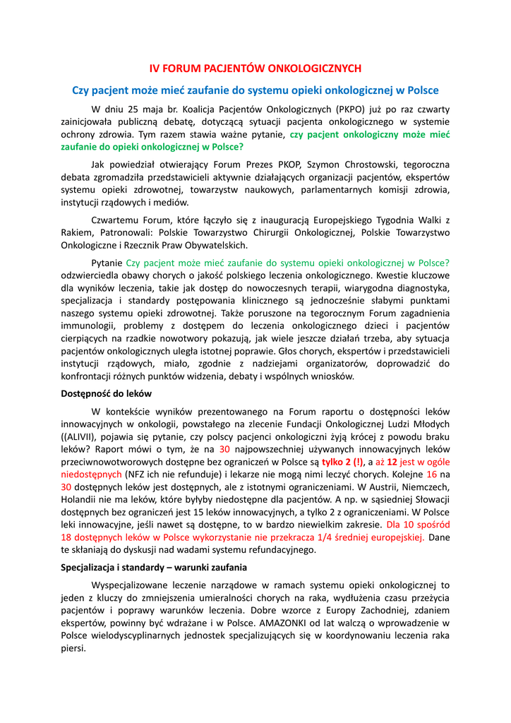 IV FORUM PACJENTÓW ONKOLOGICZNYCH Czy pacjent może mieć zaufanie do systemu opieki onkologicznej w Polsce W dniu 25 maja br. Koalicja Pacjentów Onkologicznych (PKPO) już po raz czwarty zainicjowała publiczną debatę, dotyczącą sytuacji pacjenta onkologicznego w systemie ochrony zdrowia. Tym razem stawia ważne pytanie, czy pacjent onkologiczny może mieć zaufanie do opieki onkologicznej w Polsce? Jak powiedział otwierający Forum Prezes PKOP, Szymon Chrostowski, tegoroczna debata zgromadziła przedstawicieli aktywnie działających organizacji pacjentów, ekspertów systemu opieki zdrowotnej, towarzystw naukowych, parlamentarnych komisji zdrowia, instytucji rządowych i mediów. Czwartemu Forum, które łączyło się z inauguracją Europejskiego Tygodnia Walki z Rakiem, Patronowali: Polskie Towarzystwo Chirurgii Onkologicznej, Polskie Towarzystwo Onkologiczne i Rzecznik Praw Obywatelskich. Pytanie Czy pacjent może mieć zaufanie do systemu opieki onkologicznej w Polsce? odzwierciedla obawy chorych o jakość polskiego leczenia onkologicznego. Kwestie kluczowe dla wyników leczenia, takie jak dostęp do nowoczesnych terapii, wiarygodna diagnostyka, specjalizacja i standardy postępowania klinicznego są jednocześnie słabymi punktami naszego systemu opieki zdrowotnej. Także poruszone na tegorocznym Forum zagadnienia immunologii, problemy z dostępem do leczenia onkologicznego dzieci i pacjentów cierpiących na rzadkie nowotwory pokazują, jak wiele jeszcze działań trzeba, aby sytuacja pacjentów onkologicznych uległa istotnej poprawie. Głos chorych, ekspertów i przedstawicieli instytucji rządowych, miało, zgodnie z nadziejami organizatorów, doprowadzić do konfrontacji różnych punktów widzenia, debaty i wspólnych wniosków. Dostępność do leków W kontekście wyników prezentowanego na Forum raportu o dostępności leków innowacyjnych w onkologii, powstałego na zlecenie Fundacji Onkologicznej Ludzi Młodych ((ALIVII), pojawia się pytanie, czy polscy pacjenci onkologiczni żyją krócej z powodu braku leków? Raport mówi o tym, że na 30 najpowszechniej używanych innowacyjnych leków przeciwnowotworowych dostępne bez ograniczeń w Polsce są tylko 2 (!), a aż 12 jest w ogóle niedostępnych (NFZ ich nie refunduje) i lekarze nie mogą nimi leczyć chorych. Kolejne 16 na 30 dostępnych leków jest dostępnych, ale z istotnymi ograniczeniami. W Austrii, Niemczech, Holandii nie ma leków, które byłyby niedostępne dla pacjentów. A np. w sąsiedniej Słowacji dostępnych bez ograniczeń jest 15 leków innowacyjnych, a tylko 2 z ograniczeniami. W Polsce leki innowacyjne, jeśli nawet są dostępne, to w bardzo niewielkim zakresie. Dla 10 spośród 18 dostępnych leków w Polsce wykorzystanie nie przekracza 1/4 średniej europejskiej. Dane te skłaniają do dyskusji nad wadami systemu refundacyjnego. Specjalizacja i standardy – warunki zaufania Wyspecjalizowane leczenie narządowe w ramach systemu opieki onkologicznej to jeden z kluczy do zmniejszenia umieralności chorych na raka, wydłużenia czasu przeżycia pacjentów i poprawy warunków leczenia. Dobre wzorce z Europy Zachodniej, zdaniem ekspertów, powinny być wdrażane i w Polsce. AMAZONKI od lat walczą o wprowadzenie w Polsce wielodyscyplinarnych jednostek specjalizujących się w koordynowaniu leczenia raka piersi. Istotnym problemem polskiej rzeczywistości onkologicznej jest brak obowiązujących standardów postępowania klinicznego. Standardy i rekomendacje publikowane przez towarzystwa naukowe stanowią tylko miękkie zalecenia, a nie obowiązek dla klinicystów. Pacjenci wykluczeni IV Forum było też okazją do dyskusji na temat sytuacji pacjentów cierpiących na rzadkie nowotwory. Jak wygląda ich diagnostyka, leczenie i dlaczego – jak sami o sobie mówią - czują się wykluczeni? System ochrony zdrowia nie rozwiązał w tym zakresie problemu optymalnego dostępu do leczenia, pomimo wyraźnych zaleceń Unii Europejskiej. Immunoterapia – szansa dla chorych na raka? Ważnym tematem podjętym na Forum było zagadnienie immunologii, które budzi wielkie nadzieje pacjentów. Tradycyjne leczenie onkologiczne, skojarzone z innowacyjnymi terapiami, mającymi na celu zaangażowanie systemu odpornościowego organizmu do waliki z nowotworem, ma według opinii ekspertów wielkie szanse na sukces. Kierowani nadzieją pacjenci zadają wiele pytań o dostęp do tego typu terapii w Polsce. Organizatorzy zaprosili do udziału w Forum przedstawiciela PSFO. Uczestniczył w nim dr Jerzy Łazowski.