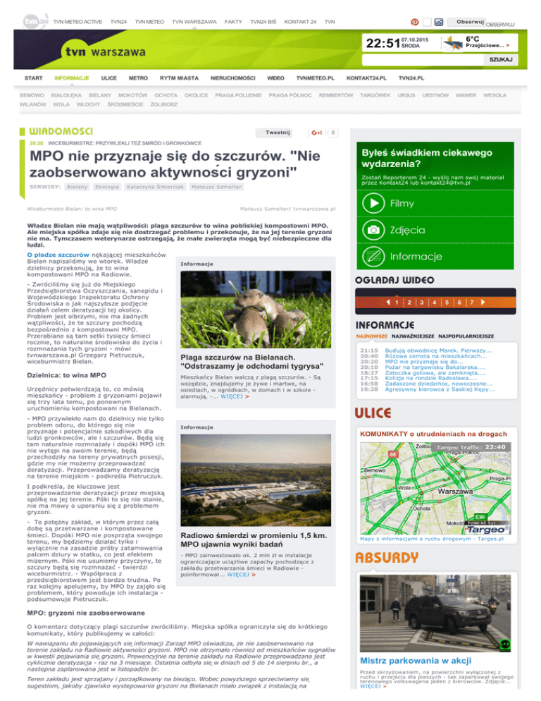 TVN METEO ACTIVE TVN24 TVN METEO TVN WARSZAWA FAKTY TVN24 BIŚ KONTAKT 24 TVN Obserwuj OBSERWUJ 22:5107.10.2015 ŚRODA 6°C Przejściowe... > SZUKAJ START INFORMACJE ULICE METRO RYTM MIASTA NIERUCHOMOŚCI WIDEO TVNMETEO.PL KONTAKT24.PL TVN24.PL BEMOWO BIAŁOŁĘKA BIELANY MOKOTÓW OCHOTA OKOLICE PRAGA POŁUDNIE PRAGA PÓŁNOC REMBERTÓW TARGÓWEK URSUS URSYNÓW WAWER WESOŁA WILANÓW WOLA WŁOCHY ŚRÓDMIEŚCIE ŻOLIBORZ Tweetnij 0 20:20 WICEBURMISTRZ: PRZYWLEKLI TEŻ SMRÓD I GRONKOWCE MPO nie przyznaje się do szczurów. "Nie zaobserwowano aktywności gryzoni" SERWISY: Bielany Ekologia Katarzyna Śmierciak Mateusz Szmelter Wiceburmistrz Bielan: to wina MPO Byłeś świadkiem ciekawego wydarzenia? Zostań Reporterem 24 - wyślij nam swój materiał przez Kontakt24 lub [email protected] Filmy Mateusz Szmelter/ tvnwarszawa.pl Władze Bielan nie mają wątpliwości: plaga szczurów to wina pobliskiej kompostowni MPO. Ale miejska spółka zdaje się nie dostrzegać problemu i przekonuje, że na jej terenie gryzoni nie ma. Tymczasem weterynarze ostrzegają, że małe zwierzęta mogą być niebezpieczne dla ludzi. O pladze szczurów nękającej mieszkańców Bielan napisaliśmy we wtorek. Władze dzielnicy przekonują, że to wina kompostowani MPO na Radiowie. - Zwróciliśmy się już do Miejskiego Przedsiębiorstwa Oczyszczania, sanepidu i Wojewódzkiego Inspektoratu Ochrony Środowiska o jak najszybsze podjęcie działań celem deratyzacji tej okolicy. Problem jest olbrzymi, nie ma żadnych wątpliwości, że te szczury pochodzą bezpośrednio z kompostowni MPO. Przerabiane są tam setki tysięcy śmieci rocznie, to naturalne środowisko do życia i rozmnażania tych gryzoni - mówi tvnwarszawa.pl Grzegorz Pietruczuk, wiceburmistrz Bielan. Dzielnica: to wina MPO Urzędnicy potwierdzają to, co mówią mieszkańcy - problem z gryzoniami pojawił się trzy lata temu, po ponownym uruchomieniu kompostowani na Bielanach. - MPO przywlekło nam do dzielnicy nie tylko problem odoru, do którego się nie przyznaje i potencjalnie szkodliwych dla ludzi gronkowców, ale i szczurów. Będą się tam naturalnie rozmnażały i dopóki MPO ich nie wytępi na swoim terenie, będą przechodziły na tereny prywatnych posesji, gdzie my nie możemy przeprowadzać deratyzacji. Przeprowadzamy deratyzację na terenie miejskim - podkreśla Pietruczuk. Zdjęcia Informacje Informacje 1 2 3 4 5 6 7 NAJNOWSZE NAJWAŻNIEJSZE NAJPOPULARNIEJSZE Plaga szczurów na Bielanach. "Odstraszamy je odchodami tygrysa" Mieszkańcy Bielan walczą z plagą szczurów. - Są wszędzie, znajdujemy je żywe i martwe, na osiedlach, w ogródkach, w domach i w szkole alarmują. -... WIĘCEJ > 21:15 20:40 20:20 20:10 18:27 17:15 16:58 16:28 Budują obwodnicę Marek. Pierwszy... Różowa zemsta na mieszkańcach... MPO nie przyznaje się do... Pożar na targowisku Bakalarska.... Zatoczka gotowa, ale zamknięta.... Kolizja na rondzie Radosława.... Zadaszone dziedzińce, nowoczesne... Agresywny kierowca z Saskiej Kępy... Informacje KOMUNIKATY o utrudnieniach na drogach 22:40 I podkreśla, że kluczowe jest przeprowadzenie deratyzacji przez miejską spółkę na jej terenie. Póki to się nie stanie, nie ma mowy o uporaniu się z problemem gryzoni. - To potężny zakład, w którym przez całą dobę są przetwarzane i kompostowane śmieci. Dopóki MPO nie posprząta swojego terenu, my będziemy działać tylko i wyłącznie na zasadzie próby zatamowania palcem dziury w statku, co jest efektem mizernym. Póki nie usuniemy przyczyny, te szczury będą się rozmnażać - twierdzi wiceburmistrz. - Współpraca z przedsiębiorstwem jest bardzo trudna. Po raz kolejny apelujemy, by MPO by zajęło się problemem, który powoduje ich instalacja podsumowuje Pietruczuk. Radiowo śmierdzi w promieniu 1,5 km. MPO ujawnia wyniki badań Mapy z informacjami o ruchu drogowym - Targeo.pl - MPO zainwestowało ok. 2 mln zł w instalacje ograniczające uciążliwe zapachy pochodzące z zakładu przetwarzania śmieci w Radiowie poinformował... WIĘCEJ > MPO: gryzoni nie zaobserwowane O komentarz dotyczący plagi szczurów zwróciliśmy. Miejska spółka ograniczyła się do krótkiego komunikaty, który publikujemy w całości: W nawiązaniu do pojawiających się informacji Zarząd MPO oświadcza, że nie zaobserwowano na terenie zakładu na Radiowie aktywności gryzoni. MPO nie otrzymało również od mieszkańców sygnałów w kwestii pojawiania się gryzoni. Prewencyjnie na terenie zakładu na Radiowie przeprowadzana jest cyklicznie deratyzacja - raz na 3 miesiące. Ostatnia odbyła się w dniach od 5 do 14 sierpniu br., a następna zaplanowana jest w listopadzie br. Teren zakładu jest sprzątany i porządkowany na bieżąco. Wobec powyższego sprzeciwiamy się sugestiom, jakoby zjawisko występowania gryzoni na Bielanach miało związek z instalacją na Mistrz parkowania w akcji Przed skrzyżowaniem, na powierzchni wyłączonej z ruchu i przejściu dla pieszych - tak zaparkował swojego terenowego volkswagena jeden z kierowców. Zdjęcie... WIĘCEJ > Radiowie. Szczury mogą być niebezpieczne dla ludzi Mateusz Szmleter/ tvnwarszawa.pl Zobacz więcej absurdów > Ekspert: szczury są niebezpieczne Ale na potwierdzenie swoich zarzutów mieszkańcy pokazują zdjęcia i filmy ze szczurami na posesjach. Tymczasem weterynarze ostrzegają przed gryzoniami. Lista chorób, które mogą przenosić jest długa: dżuma, leptospiroza, wścieklizna, wirusowe zapalenie wątroby typu E. - To zwierzęta wszędobylskie, ale zawsze żyjące w okolicy człowieka. Są stadne, zakładają duże kolonie, żyją w sporych grupach. Wszystkożerne, inteligentne, szybko się uczą i rozmnażają. Potrafią w jednym miocie mieć nawet do 17 młodych. Łatwo policzyć, że z jednej matki mamy nawet do stu młodych osobników w ciągu roku - mówi Milena Wojtyś-Gajda, lekarz weterynarii, specjalizująca się w leczeniu małych gryzoni. I dodaje, że żywiące się odpadami zwierzęta p
