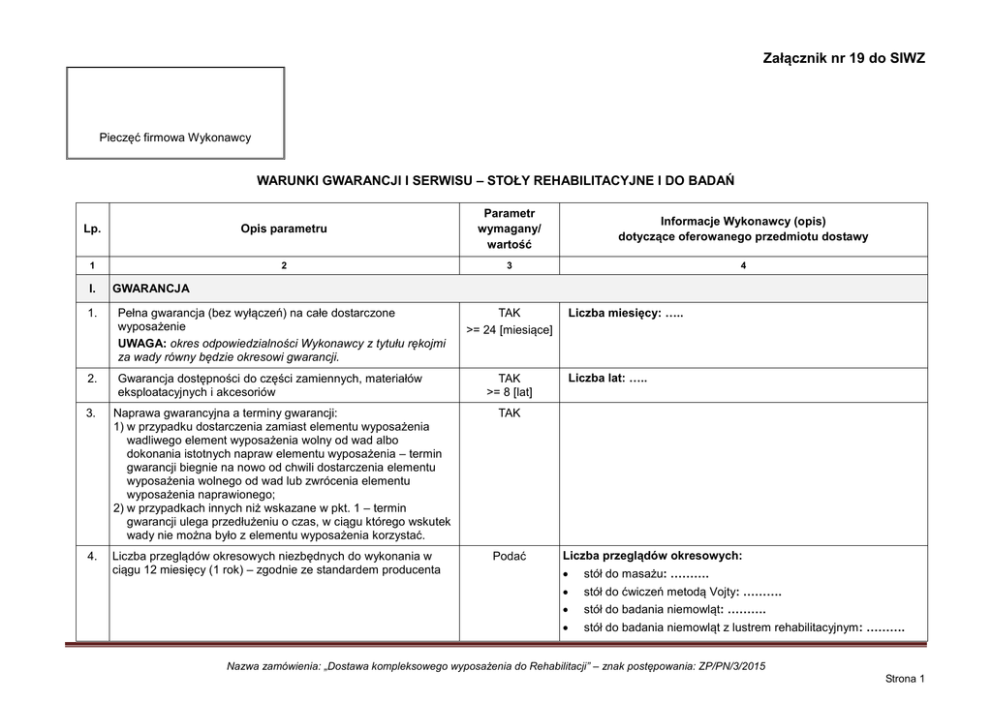 Załącznik nr 19 do SIWZ Pieczęć firmowa Wykonawcy WARUNKI GWARANCJI I SERWISU – STOŁY REHABILITACYJNE I DO BADAŃ Lp. Opis parametru Parametr wymagany/ wartość Informacje Wykonawcy (opis) dotyczące oferowanego przedmiotu dostawy 1 2 3 4 1. Pełna gwarancja (bez wyłączeń) na całe dostarczone wyposażenie UWAGA: okres odpowiedzialności Wykonawcy z tytułu rękojmi za wady równy będzie okresowi gwarancji. TAK >= 24 [miesiące] 2. Gwarancja dostępności do części zamiennych, materiałów eksploatacyjnych i akcesoriów I. GWARANCJA 3. Naprawa gwarancyjna a terminy gwarancji: 1) w przypadku dostarczenia zamiast elementu wyposażenia wadliwego element wyposażenia wolny od wad albo dokonania istotnych napraw elementu wyposażenia – termin gwarancji biegnie na nowo od chwili dostarczenia elementu wyposażenia wolnego od wad lub zwrócenia elementu wyposażenia naprawionego; 2) w przypadkach innych niż wskazane w pkt. 1 – termin gwarancji ulega przedłużeniu o czas, w ciągu którego wskutek wady nie można było z elementu wyposażenia korzystać. 4. Liczba przeglądów okresowych niezbędnych do wykonania w ciągu 12 miesięcy (1 rok) – zgodnie ze standardem producenta Liczba miesięcy: ….. Liczba lat: ….. TAK >= 8 [lat] TAK Podać Liczba przeglądów okresowych: stół do masażu: ………. stół do ćwiczeń metodą Vojty: ………. stół do badania niemowląt: ………. stół do badania niemowląt z lustrem rehabilitacyjnym: ………. Nazwa zamówienia: „Dostawa kompleksowego wyposażenia do Rehabilitacji” – znak postępowania: ZP/PN/3/2015 Strona 1 stół pionizacyjny (elektryczny, trzy pasy stabilizacyjne): ………. stół rehabilitacyjny: ………. stół wyciągowy: ………. stopnie/podnóżki antypoślizgowe: ………. Należy podać liczbę przeglądów okresowych (w okresie 12 miesięcy), a także opisać zakres czynności przeglądowych. II. WARUNKI SERWISU 5. Wszystkie czynności serwisowe, w tym przeglądy konserwacyjne, w okresie gwarancji – w cenie przedmiotu dostawy TAK 6. Czas reakcji serwisu („przyjęte zgłoszenie – podjęta naprawa”): do 24 godzin w dni robocze*, a w przypadku zgłoszenia awarii w piątek, sobotę lub w inny dzień ustawowo wolny od pracy, czas reakcji może być wydłużony do 72 godzin, po pisemnym uzgodnieniu z osobą zgłaszającą awarię UWAGA: czas reakcji serwisu będzie liczony od chwili telefonicznego zgłoszenia awarii potwierdzonego faksem lub pocztą elektroniczną, a przez "podjęcie naprawy" rozumie się osobistą obecność uprawnionego pracownika Wykonawcy przy uszkodzonym elemencie wyposażenia lub odbiór elementu wyposażenia lub uszkodzonej części składowej elementu wyposażenia na koszt Wykonawcy (np. pocztą kurierską). TAK 7. Możliwość zgłoszeń awarii 24h/dobę, 365 dni/rok TAK 8. Wymiana podzespołu na nowy – natychmiastowa lub co najwyżej po pierwszej nieskutecznej próbie jego naprawy TAK 9. 10. Wymiana elementu wyposażenia na nowe: co najmniej dwukrotna awaria uniemożliwiająca wykorzystywanie elementu wyposażenia zgodnie z przeznaczeniem będzie uprawniała Zamawiającego do żądania wymiany wadliwego elementu wyposażenia na nowe wolne od wad Zakończenie działań serwisowych – najpóźniej w ciągu 5-ch (pięciu) dni roboczych* od dnia zgłoszenia awarii, a w przypadku konieczności importu części zamiennych – nie może przekroczyć 7-miu* (siedmiu) dni roboczych liczonych od dnia zgłoszenia awarii. W przypadku konieczności wymiany całego elementu TAK TAK Nazwa zamówienia: „Dostawa kompleksowego wyposażenia do Rehabilitacji” – znak postępowania: ZP/PN/3/2015 Strona 2 wyposażenia – dostawa i montaż wymienionego elementu wyposażenia nie może przekroczyć 2-ch (dwóch) tygodni od dnia zgłoszenia awarii. 11. Struktura serwisowa gwarantująca realizację wymogów stawianych w niniejszej specyfikacji TAK 12. Elementy wyposażenia pozbawione są blokad serwisowych, które po upływie gwarancji utrudniałyby pracownikom technicznym szpitala lub innemu wykonawcy usług serwisowych, niż tzw. autoryzowany serwis producenta dostęp do elementu wyposażenia lub jego elementów i ich serwisowanie przez inny niż Wykonawca umowy podmiot, w przypadku nie korzystania przez Zamawiającego z serwisu pogwarancyjnego Wykonawcy (dotyczy wykonywania przeglądów, napraw z wymianą części, instalacji urządzeń peryferyjnych, akcesoriów, przystawek, itp.). TAK Załączyć wykaz podmiotów (serwisów i/lub serwisantów) uprawnionych do obsługi serwisowej oferowanego przedmiotu dostawy, dane teleadresowe, sposób kontaktu i liczbę osób serwisu własnego lub podwykonawcy posiadającego uprawnienia do tego typu działalności – patrz Rozdział 8 dział A ust. 7 pkt. 4 SIWZ. * „dzień roboczy” – oznacza dni tygodnia od poniedziałku do piątku, z wyłączeniem dni ustawowo wolnych od pracy. Data: …………………………… Uprawniony przedstawiciel Wykonawcy ……………………………………….. (pieczątka i podpis) Nazwa zamówienia: „Dostawa kompleksowego wyposażenia do Rehabilitacji” – znak postępowania: ZP/PN/3/2015 Strona 3