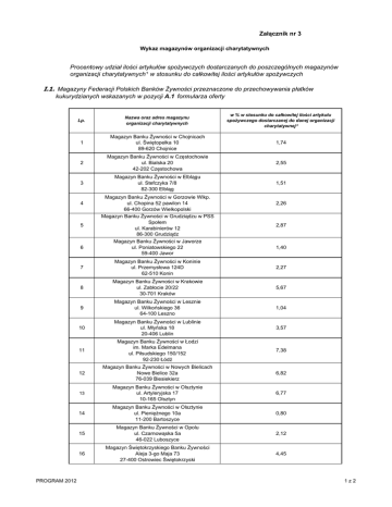Załącznik nr 3 Wykaz magazynów organizacji charytatywnych Procentowy udział ilości artykułów spożywczych dostarczanych do poszczególnych magazynów organizacji charytatywnych¹ w stosunku do całkowitej ilości artykułów spożywczych I.1. Magazyny Federacji Polskich Banków Żywności przeznaczone do przechowywania płatków kukurydzianych wskazanych w pozycji A.1 formularza oferty Lp. Nazwa oraz adres magazynu organizacji charytatywnych w % w stosunku do całkowitej ilości artykułu spożywczego dostarczanej do danej organizacji charytatywnej ² 1 Magazyn Banku Żywności w Chojnicach ul. Świętopełka 10 89-620 Chojnice 1,74 2 Magazyn Banku Żywności w Częstochowie ul. Bialska 20 42-202 Częstochowa 2,55 3 Magazyn Banku Żywności w Elblągu ul. Stefczyka 7/8 82-300 Elbląg 1,51 4 5 6 PROGRAM 2012 Magazyn Banku Żywności w Gorzowie Wlkp. ul. Chopina 52 pawilon 14 66-400 Gorzów Wielkopolski Magazyn Banku Żywności w Grudziądzu w PSS Społem ul. Karabinierów 12 86-300 Grudziądz Magazyn Banku Żywności w Jaworze ul. Poniatowskiego 22 59-400 Jawor 2,26 2,87 1,40 7 Magazyn Banku Żywności w Koninie ul. Przemysłowa 124D 62-510 Konin 2,27 8 Magazyn Banku Żywności w Krakowie ul. Zabłocie 20/22 30-701 Kraków 5,67 9 Magazyn Banku Żywności w Lesznie ul. Wilkońskiego 36 64-100 Leszno 1,04 10 Magazyn Banku Żywności w Lublinie ul. Młyńska 18 20-406 Lublin 3,57 11 Magazyn Banku Żywności w Łodzi im. Marka Edelmana ul. Piłsudskiego 150/152 92-230 Łódź 7,38 12 Magazyn Banku Żywności w Nowych Bielicach Nowe Bielice 32a 76-039 Biesiekierz 6,82 13 Magazyn Banku Żywności w Olsztynie ul. Artyleryjska 17 10-165 Olsztyn 6,77 14 Magazyn Banku Żywności w Olsztynie ul. Pieniężnego 10a 11-200 Bartoszyce 0,80 15 Magazyn Banku Żywności w Opolu ul. Czarnowąska 5a 46-022 Luboszyce 2,12 16 Magazyn Świętokrzyskiego Banku Żywności Aleja 3-go Maja 73 27-400 Ostrowiec Świętokrzyski 4,45 1z2 17 Magazyn Pilskiego Banku Żywności ul. Motylewska 24 64-920 Piła 4,21 18 Magazyn Wielkopolskiego Banku Żywności ul. Ceglana 4 60-001 Poznań 5,75 19 Magazyn Radomskiego Banku Żywności ul. Limanowskiego 134 26-612 Radom 2,85 20 Magazyn Śląskiego Banku Żywności ul. Janasa 15 41-500 Chorzów 4,49 21 Magazyn Podkarpackiego Banku Żywności ul. Konopnickiej 18 35-211 Rzeszów 4,28 22 Magazyn Banku Żywności w Siedlcach ul. Starzyńskiego 4 08-110 Siedlce 1,44 23 Magazyn Banku Żywności Suwałki – Białystok ul. Przytorowa 19 16-400 Suwałki 0,95 24 Magazyn Banku Żywności Suwałki – Białystok ul. Węglowa 8 15-121 Białystok 1,85 25 Magazyn Stowarzyszenia Tarnobrzeski Bank Żywności ul. Sienkiewicza 145 39-400 Tarnobrzeg 1,88 26 Magazyn Banku Żywności w Tczewie Rukosin 4 83-113 Turze 2,41 27 Magazyn Banku Żywności w Toruniu ul. Wały Gen. Sikorskiego 27/29 87-100 Toruń 2,59 28 Magazyn Banku Żywności SOS w Warszawie ul. Stanisława Bodycha 97 Reguły 05-820 Piastów 1 4,89 29 Magazyn Banku Żywności we Wrocławiu ul. Rogowska 117D 54-440 Wrocław 3,55 30 Magazyn Kieleckiego Banku Żywności ul. Chłopska 20B 25-720 Kielce 1,00 31 Magazyn Banku Żywności w Płocku ul. Targowa 7 09-400 Płock 1,00 32 Magazyn Wałbrzyskiego Banku Żywności ul.Moniuszki 45a 58-300 Wałbrzych 0,64 33 Magazyn Banku Żywności w Słupsku ul. Słoneczna 16 lok. E 76-200 Słupsk 1,00 34 Magazyn Banku Żywności w Ciechanowie ul. Śmiecińska 9 06-400 Ciechanów 1,50 35 Magazyn Pomorskiego Banku Żywności ul. Hutnicza 40 06-400 Gdańsk 0,50 100,00 PROGRAM 2012 2z2