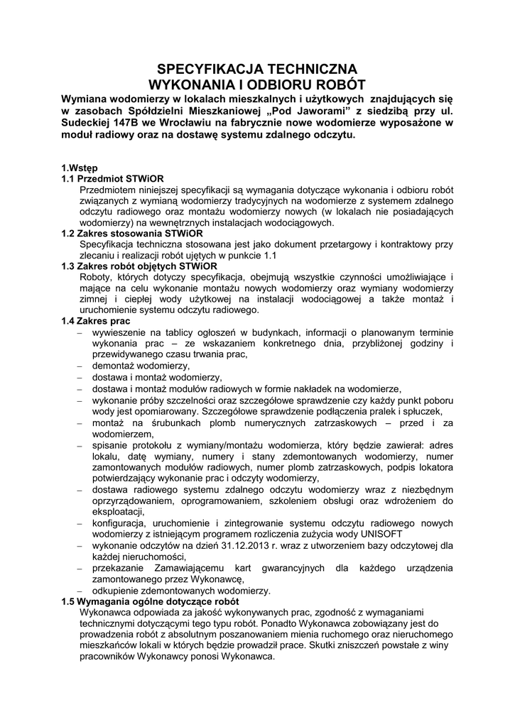 SPECYFIKACJA TECHNICZNA WYKONANIA I ODBIORU ROBÓT Wymiana wodomierzy w lokalach mieszkalnych i użytkowych znajdujących się w zasobach Spółdzielni Mieszkaniowej „Pod Jaworami” z siedzibą przy ul. Sudeckiej 147B we Wrocławiu na fabrycznie nowe wodomierze wyposażone w moduł radiowy oraz na dostawę systemu zdalnego odczytu. 1.Wstęp 1.1 Przedmiot STWiOR Przedmiotem niniejszej specyfikacji są wymagania dotyczące wykonania i odbioru robót związanych z wymianą wodomierzy tradycyjnych na wodomierze z systemem zdalnego odczytu radiowego oraz montażu wodomierzy nowych (w lokalach nie posiadających wodomierzy) na wewnętrznych instalacjach wodociągowych. 1.2 Zakres stosowania STWiOR Specyfikacja techniczna stosowana jest jako dokument przetargowy i kontraktowy przy zlecaniu i realizacji robót ujętych w punkcie 1.1 1.3 Zakres robót objętych STWiOR Roboty, których dotyczy specyfikacja, obejmują wszystkie czynności umożliwiające i mające na celu wykonanie montażu nowych wodomierzy oraz wymiany wodomierzy zimnej i ciepłej wody użytkowej na instalacji wodociągowej a także montaż i uruchomienie systemu odczytu radiowego. 1.4 Zakres prac wywieszenie na tablicy ogłoszeń w budynkach, informacji o planowanym terminie wykonania prac – ze wskazaniem konkretnego dnia, przybliżonej godziny i przewidywanego czasu trwania prac, demontaż wodomierzy, dostawa i montaż wodomierzy, dostawa i montaż modułów radiowych w formie nakładek na wodomierze, wykonanie próby szczelności oraz szczegółowe sprawdzenie czy każdy punkt poboru wody jest opomiarowany. Szczegółowe sprawdzenie podłączenia pralek i spłuczek, montaż na śrubunkach plomb numerycznych zatrzaskowych – przed i za wodomierzem, spisanie protokołu z wymiany/montażu wodomierza, który będzie zawierał: adres lokalu, datę wymiany, numery i stany zdemontowanych wodomierzy, numer zamontowanych modułów radiowych, numer plomb zatrzaskowych, podpis lokatora potwierdzający wykonanie prac i odczyty wodomierzy, dostawa radiowego systemu zdalnego odczytu wodomierzy wraz z niezbędnym oprzyrządowaniem, oprogramowaniem, szkoleniem obsługi oraz wdrożeniem do eksploatacji, konfiguracja, uruchomienie i zintegrowanie systemu odczytu radiowego nowych wodomierzy z istniejącym programem rozliczenia zużycia wody UNISOFT wykonanie odczytów na dzień 31.12.2013 r. wraz z utworzeniem bazy odczytowej dla każdej nieruchomości, przekazanie Zamawiającemu kart gwarancyjnych dla każdego urządzenia zamontowanego przez Wykonawcę, odkupienie zdemontowanych wodomierzy. 1.5 Wymagania ogólne dotyczące robót Wykonawca odpowiada za jakość wykonywanych prac, zgodność z wymaganiami technicznymi dotyczącymi tego typu robót. Ponadto Wykonawca zobowiązany jest do prowadzenia robót z absolutnym poszanowaniem mienia ruchomego oraz nieruchomego mieszkańców lokali w których będzie prowadził prace. Skutki zniszczeń powstałe z winy pracowników Wykonawcy ponosi Wykonawca. 2. Materiały Na etapie składania oferty Wykonawca jako załącznik przedłoży karty katalogowe oferowanych urządzeń. 1) Wodomierze jednostrumieniowe suchobieżne do wody ciepłej (T≥90), do wody zimnej (T≥30), DN 15 mm, przystosowany do montażu nakładki radiowej, nominalny strumień objętości 2,5 m3/h klasa metrologiczna – min. R100-H/R50-V urządzenia muszą być fabrycznie nowe i posiadać cechę legalizacyjną nadaną w roku realizacji dostawy do zamawiającego korpus wodomierza metalowy, możliwość odczytu wzrokowego z widocznym wskaźnikiem pracy wodomierza odporność na ingerencję zewnętrznym polem magnetycznym wodomierz będą montowane w poziomie, w wypadku gdy warunki w szachcie instalacyjnym na to nie pozwolą muszą zostać zamontowane w taki sposób aby ich funkcjonowanie było prawidłowe 2) Nakładki na wodomierze Preferowany system jednokierunkowy komunikacji między nakładką a urządzeniem odczytującym Wymagana wytrzymałość baterii min. 10 lat, oraz zabezpieczenie baterii przed możliwością jej nieuprawnionego demontażu Wymagany alarm niskiego poziomu baterii ‹ 1 rok, Nakładka musi mieć możliwość zamontowania na wodomierzu bez konieczności jego demontażu Nakładka musi być montowana w sposób uniemożliwiający jej demontaż bez naruszania plomb, Wymagana automatyczna rejestracja w module stanu wodomierza na ostatni dzień miesiąca i dodatkowo opcjonalnie wybrany dzień miesiąca Wymagana rejestracja prób zakłócania polem magnetycznym w module, opcjonalnie generacja automatycznego alarmu Wymagana rejestracja próby rozłączenia modułu i wodomierza, opcjonalnie generacja automatycznego alarmu Wymagany alarm cofania wody wraz z dokładnym wskazaniem ilości cofniętej wody Wymagany alarm wycieku wody oraz braku poboru wody 3) Radiowy system zdalnego odczytu wodomierzy realizowany przez zastosowanie modułów (nakładek na wodomierze) wraz z niezbędnym oprzyrządowaniem oraz innymi elementami i częściami niezbędnymi do prawidłowego funkcjonowania całego systemu, oprogramowaniem, szkoleniem obsługi oraz wdrożeniem do eksploatacji wg następujących wymogów technicznych: Wymagana możliwość odczytu modułu „w ruchu” – poprzez przejście inkasenta, Wymagana historia pełnego rozbioru wody w m3 – za 13 miesięcy, Możliwość eksportu pliku do formatu csv, co umożliwi eksport do bazy danych, arkuszy kalkulacyjnych i integracje z systemami rozliczeniowymi, Wymagana możliwość rejestracji alarmów: przepływ wsteczny, próby zakłócania pracy polem magnetycznym, przerwanie komunikacji pomiędzy wodomierzem a modułem, wyciek wody, brak poboru wody – zatrzymanie licznika, przekroczenie przepływów maksymalnych, niski poziom baterii. 3. Sprzęt Wykonawca zobowiązany jest używać sprzętu sprawnego technicznie, posiadającego odpowiednie zabezpieczenia i spełniającego wszelkie wymogi pod względem BHP. Niedopuszczalne jest korzystanie ze sprzętu uszkodzonego. 4. Wykon