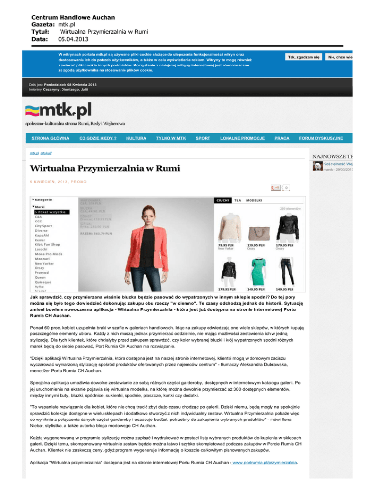 Centrum Handlowe Auchan Gazeta: mtk.pl Tytu³: Wirtualna Przymierzalnia w Rumi Data: 05.04.2013 W witrynach portalu mtk.pl są używane pliki cookie służące do ulepszenia funkcjonalności witryn oraz Tak, zgadzam się dostosowania ich do potrzeb użytkowników, a także w celu wyświetlania reklam. Witryny te mogą również Nie, chce wiedzie zawierać pliki cookie innych podmiotów. Korzystanie z niniejszej witryny internetowej jest równoznaczne ze zgodą użytkownika na stosowanie plików cookie. Dziś jest: Poniedziałek 08 Kwietnia 2013 Imieniny: Cezaryny, Dionizego, Julii społeczno-kulturalna strona Rumi, Redy i Wejherowa STRONA GŁÓWNA CO GDZIE KIEDY ? KULTURA TYLKO W MTK SPORT LOKALNE PROMOCJE PRACA FORUM DYSKUSYJNE mtk.pl artykul/ NAJNOWSZE TEMATY Kościelność Wejherowskiego Wirtualna Przymierzalnia w Rumi marek - 29/03/2013 5 K W I E C I EŃ, 2 0 1 3 , P R O M O 0 Jak sprawdzić, czy przymierzana właśnie bluzka będzie pasować do wypatrzonych w innym sklepie spodni? Do tej pory można się było tego dowiedzieć dokonując zakupu obu rzeczy "w ciemno". Te czasy odchodzą jednak do historii. Sytuację zmieni bowiem nowoczesna aplikacja - Wirtualna Przymierzalnia - która jest już dostępna na stronie internetowej Portu Rumia CH Auchan. Ponad 60 proc. kobiet uzupełnia braki w szafie w galeriach handlowych. Idąc na zakupy odwiedzają one wiele sklepów, w których kupują poszczególne elementy ubioru. Każdy z nich muszą jednak przymierzać oddzielnie, nie mając możliwości zestawienia ich w jedną stylizację. Dla tych klientek, które chciałyby przed zakupem sprawdzić, czy kolor wybranej bluzki i krój wypatrzonych spodni różnych marek będą do siebie pasować, Port Rumia CH Auchan ma rozwiązanie. "Dzięki aplikacji Wirtualna Przymierzalnia, która dostępna jest na naszej stronie internetowej, klientki mogą w domowym zaciszu wyczarować wymarzoną stylizację spośród produktów oferowanych przez najemców centrum" - tłumaczy Aleksandra Dubrawska, menedżer Portu Rumia CH Auchan. Specjalna aplikacja umożliwia dowolne zestawianie ze sobą różnych części garderoby, dostępnych w internetowym katalogu galerii. Po jej uruchomieniu na ekranie pojawia się wirtualna modelka, na której można dowolnie przymierzać aż 300 dostępnych elementów, między innymi buty, bluzki, spódnice, sukienki, spodnie, płaszcze, kurtki czy dodatki. "To wspaniałe rozwiązanie dla kobiet, które nie chcą tracić zbyt dużo czasu chodząc po galerii. Dzięki niemu, będą mogły na spokojnie sprawdzić kolekcje dostępne w wielu sklepach i dodatkowo stworzyć z nich indywidualny zestaw. Wirtualna Przymierzalnia pokaże więc co wyniknie z połączenia danych części garderoby i oszacuje budżet, potrzebny do zakupienia wybranych produktów" - mówi Ilona Niebał, stylistka, a także autorka bloga modowego CH Auchan. Każdą wygenerowaną w programie stylizację można zapisać i wydrukować w postaci listy wybranych produktów do kupienia w sklepach galerii. Dzięki temu, skomponowany wirtualnie zestaw będzie można łatwo i szybko skompletować podczas zakupów w Porcie Rumia CH Auchan. Klientek nie zaskoczą ceny, gdyż program wygeneruje informację o koszcie całkowitym planowanych zakupów. Aplikacja "Wirtualna przymierzalnia" dostępna jest na stronie internetowej Portu Rumia CH Auchan - www.portrumia.pl/przymierzalnia. Centrum Handlowe Auchan Gazeta: mtk.pl Tytu³: Wirtualna Przymierzalnia w Rumi Data: 05.04.2013 KOMENTARZE Dodaj komentarz... Dodaj komentarz Wtyczka społecznościowa Facebooka Tagi: Zakupy Redzkie Absurdy Artur - 18/03/2013 - 22:12 Nowe Forum czupakabra - 13/03/2013 - 11:35 Dziury...uszkodzone Koło...co Dalej J - 14/03/2013 - 07:16 NOWE FORUM! rasta - 10/03/2013 - 14:44 REDAKCJA Masz dla nas temat? Napisz, zadzwoń lub wyślij SMS [email protected] tel. 794 040 777 Jesteś dziennikarzem? Chcesz zarobić dodatkowe pieniądze? Pisz dla nas! Jeśli Twoje teksty okażą się popularne, chętnie zapłacimy! KOMUNIKAT Witamy na nowej odsłonie witryny mtk.pl, aktualnie jesteśmy na etapie uzupełniania treści naszego portalu. Aktualnie pracujemy nad działem "Praca" oraz "Lokalne promocje". Prace potrwają do końca marca. Forum dyskusyjne zostało uruchomione, można pisać i testować nowe możliwości takie jak np. pełna integracja z Facebookiem! Obserwuj +7 REKLAMA ■ Zasady dotyczące plików cookie (c) 2013 Małe Trójmiasto Kaszubskie. Wszelkie prawa zastrzeżone.