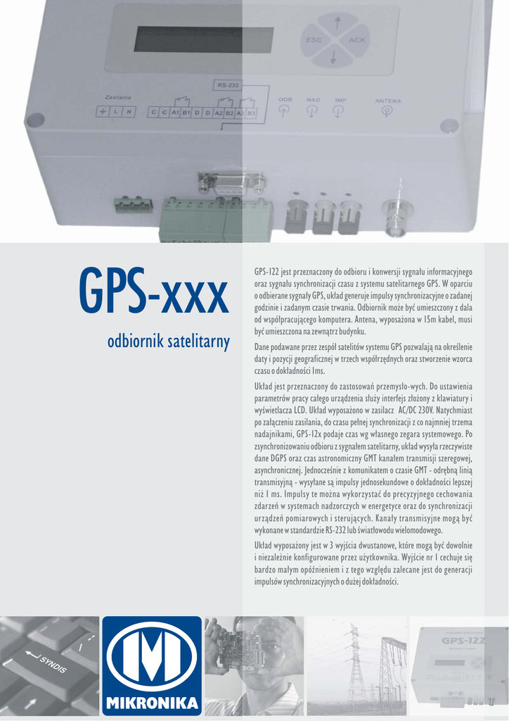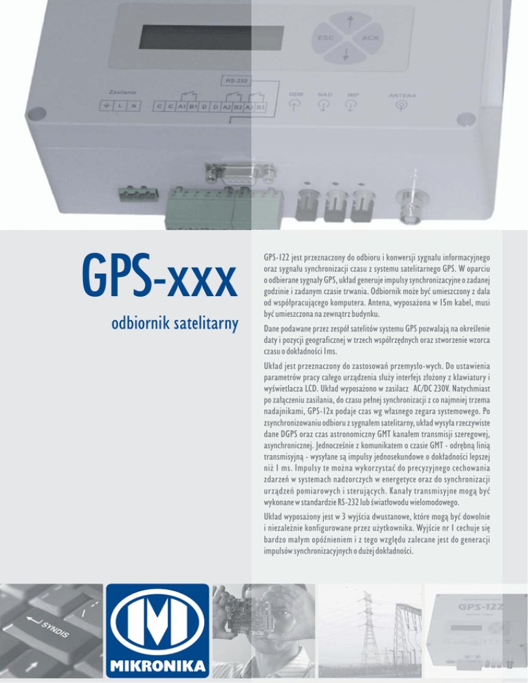 GPS-xxx odbiornik satelitarny GPS-122 jest przeznaczony do odbioru i konwersji sygnału informacyjnego oraz sygnału synchronizacji czasu z systemu satelitarnego GPS. W oparciu o odbierane sygnały GPS, układ generuje impulsy synchronizacyjne o zadanej godzinie i zadanym czasie trwania. Odbiornik może być umieszczony z dala od współpracującego komputera. Antena, wyposażona w 15m kabel, musi być umieszczona na zewnątrz budynku. Dane podawane przez zespół satelitów systemu GPS pozwalają na określenie daty i pozycji geograficznej w trzech współrzędnych oraz stworzenie wzorca czasu o dokładności 1ms. Układ jest przeznaczony do zastosowań przemysło-wych. Do ustawienia parametrów pracy całego urządzenia służy interfejs złożony z klawiatury i wyświetlacza LCD. Układ wyposażono w zasilacz AC/DC 230V. Natychmiast po załączeniu zasilania, do czasu pełnej synchronizacji z co najmniej trzema nadajnikami, GPS-12x podaje czas wg własnego zegara systemowego. Po zsynchronizowaniu odbioru z sygnałem satelitarny, układ wysyła rzeczywiste dane DGPS oraz czas astronomiczny GMT kanałem transmisji szeregowej, asynchronicznej. Jednocześnie z komunikatem o czasie GMT - odrębną linią transmisyjną - wysyłane są impulsy jednosekundowe o dokładności lepszej niż 1 ms. Impulsy te można wykorzystać do precyzyjnego cechowania zdarzeń w systemach nadzorczych w energetyce oraz do synchronizacji urządzeń pomiarowych i sterujących. Kanały transmisyjne mogą być wykonane w standardzie RS-232 lub światłowodu wielomodowego. Układ wyposażony jest w 3 wyjścia dwustanowe, które mogą być dowolnie i niezależnie konfigurowane przez użytkownika. Wyjście nr 1 cechuje się bardzo małym opóźnieniem i z tego względu zalecane jest do generacji impulsów synchronizacyjnych o dużej dokładności. Przykładowy schemat połączenia układu w systemie Sat.2 Sat.1 Sat.3 Sat.4 GPS-1xx antena odbiornik sygnałów GPS max 12m IBM PC RS-232 lub interfejs OPTO zasilacz dane GPS system dyspozytorski SYNDIS separator GPS impuls 1s wyjścia sterujące max 200m TDMARK Usynchr TDMARK synchronizacja Widok urządzenia antena GPS firmy FURUNO złącze interfejsu RS-232 terminal LCD złącze zasilania kabel antenowy długość: 15m DBAMY O ŚRODOWISKO! PAPIER Z RECYKLINGU, UDZIAŁ MAKULATURY 75%, CERTYFIKAT NR TT-COC-2043 wyjścia synchronizacyjne interfejs światłowodowy złącze do anteny GPS www.mikronika.pl