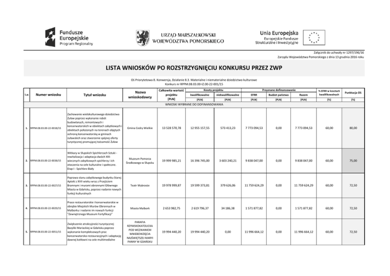 Załącznik do uchwały nr 1297/196/16 Zarządu Województwa Pomorskiego z dnia 13 grudnia 2016 roku LISTA WNIOSKÓW PO ROZSTRZYGNIĘCIU KONKURSU PRZEZ ZWP Oś Priorytetowa 8. Konwersja, Działanie 8.3. Materialne i niematerialne dziedzictwo kulturowe Konkurs nr RPPM.08.03.00-IZ.00-22-001/15 L.p. Numer wniosku Tytuł wniosku Nazwa wnioskodawcy Całkowita wartość projektu [PLN] Koszty projektu Przyznane dofinansowanie kwalifikowalne niekwalifikowalne EFRR Budżet państwa Razem % EFRR w kosztach kwalifikowalnych Punktacja OS [PLN] [PLN] [PLN] [PLN] [PLN] [%] [%] WNIOSKI WYBRANE DO DOFINANSOWANIA 1. RPPM.08.03.00-22-0018/15 Zachowanie wielokulturowego dziedzictwa Żuław poprzez wykonanie robót budowlanych, remontowych i konserwatorskich w obiektach zabytkowych i obiektach położonych na terenach objętych ochroną konserwatorską w gminach żuławskich oraz stworzenie spójnej oferty turystycznej promującej tożsamość Żuław 2. RPPM.08.03.00-22-0038/15 Witkacy w Słupskich Spichlerzach Sztuki rewitalizacja i adaptacja dwóch XIXwiecznych zabytkowych spichlerzy i ich otoczenia na cele kulturalne i społeczne. Etap I - Spichlerz Biały Gmina Cedry Wielkie 13 528 570,78 12 955 157,55 573 413,23 7 773 094,53 0,00 7 773 094,53 60,00 80,00 Muzeum Pomorza Środkowego w Słupsku 19 999 985,21 16 396 745,00 3 603 240,21 9 838 047,00 0,00 9 838 047,00 60,00 75,00 3. RPPM.08.03.00-22-0027/15 Poprawa stanu zabytkowego budynku Starej Apteki z XVII wieku wraz z Przejściem Bramnym i murami obronnymi Głównego Miasta w Gdańsku, poprzez nadanie nowych funkcji kulturalnych Teatr Wybrzeże 19 978 999,87 19 599 373,81 379 626,06 11 759 624,29 0,00 11 759 624,29 60,00 72,50 4. RPPM.08.03.00-22-0029/15 Prace restauratorskie i konserwatorskie w obrębie Miejskich Murów Obronnych w Malborku i nadanie im nowych funkcji "Zewnętrznego Muzeum Fortyfikacji" Miasto Malbork 2 653 982,75 2 619 796,37 34 186,38 1 571 877,82 0,00 1 571 877,82 60,00 72,50 5. RPPM.08.03.00-22-0051/15 Zwiększenie atrakcyjności turystycznej Bazyliki Mariackiej w Gdańsku poprzez wykonanie kompleksowych prac konserwatorsko-restauracyjnych i adaptację dawnej kotłowni na cele multimedialne PARAFIA RZYMSKOKATOLICKA POD WEZWANIEM WNIEBOWZIĘCIA NAJŚWIĘTSZEJ MARYI PANNY W GDAŃSKU 19 994 440,20 19 994 440,20 0,00 11 996 664,12 0,00 11 996 664,12 60,00 72,50 6. RPPM.08.03.00-22-0001/15 Adaptacja zabytkowego zespołu willowo parkowego przy ul. Jakuba Goyki 1-3 oraz części Parku Północnego w Sopocie na potrzeby ArtInkubatora i biblioteki publicznej Gmina Miasta Sopotu 19 023 687,86 15 459 782,81 3 563 905,05 9 275 869,69 0,00 9 275 869,69 60,00 72,50 7. RPPM.08.03.00-22-0019/15 Renowacja obiektów wpisanych do rejestru zabytków na terenie Gminy Krokowa i nadanie im nowych funkcji turystycznych wraz z kompleksowym zagospodarowaniem przestrzeni publicznych Gmina Krokowa 8 903 096,70 8 903 096,70 0,00 5 341 858,02 0,00 5 341 858,02 60,00 67,50 8. RPPM.08.03.00-22-0016/15 "Restauracja Kościoła Mariackiego i Kościoła Parafia Najświętszej Maryi Najświętszego Serca Jezusowego w Słupsku Panny Królowej Różańca jako elementów europejskiego Szlaku Świętego w Słupsku Jakubowego” 5 674 888,78 5 674 888,78 0,00 3 404 933,27 0,00 3 404 933,27 60,00 67,50 9. RPPM.08.03.00-22-0041/15 Rewaloryzacja i adaptacja Wozowni Artyleryjskiej wraz z otoczeniem, na potrzeby Centrum Hewelianum w Gdańsku Gmina Miasta Gdańska 10 079 561,59 8 154 115,11 1 925 446,48 4 892 469,07 0,00 4 892 469,07 60,00 65,00 10. RPPM.08.03.00-22-0033/15 Gniew - miasto z charakterem Gmina Gniew 6 892 194,42 6 892 194,42 0,00 4 135 316,65 0,00 4 135 316,65 60,00 65,00 11. RPPM.08.03.00-22-0037/15 Restauracja Kościoła p. w. NajświętszejMaryi Parafia Rzymsko-katolicka Panny Wniebowziętej – Gwiazda Morza w p.w Najświętszej Maryi Sopocie, w celu zwiększenia jego Panny Wniebowziętej dostępności i atrakcyjności turystycznej Gwiazda Morza w Sopocie 9 252 143,40 9 247 653,90 4 489,50 5 548 592,34 0,00 5 548 592,34 60,00 62,50 12. RPPM.08.03.00-22-0017/15 Przywracanie blasku Drodze Królewskiej w Gdańsku - rewitalizacja Ratusza Głównego Miasta i Dworu Artusa Muzeum Historyczne Miasta Gdańska 6 409 362,04 5 288 552,59 1 120 809,45 3 173 131,55 0,00 3 173 131,55 60,00 62,50 13. RPPM.08.03.00-22-0023/15 Renowacja zabytkowego mostu na rzece Boruji oraz iluminacja średniowiecznego zamku wraz z zagospodarowaniem historycznego otoczenia w miejscowości Bytów Gmina Bytów 4 938 634,50 4 938 634,50 0,00 2 963 180,70 0,00 2 963 180,70 60,00 62,50 14. RPPM.08.03.00-22-0007/15 Rewaloryzacja i adaptacja do pełnienia funkcji kulturalnych zabytkowego Domu Marynarza Szwedzkiego w Gdyni i utworzenie w nim Konsulatu Kultury Centrum Kultury w Gdyni 10 214 004,36 6 711 520,48 3 502 483,88 4 026 912,29 0,00 4 026 912,29 60,00 60,00 15. RPPM.08.03.00-22-0043/15 Rewaloryzacja i adaptacja kościoła św. Jana w Gdańsku na Centrum św. Jana – etap II Nadbałtyckie Centrum Kultury w Gdańsku 9 318 779,13 8 026 966,25 1 291 812,88 4 816 179,75 0,00 4 816 179,75 60,00 60,00 16. RPPM.08.03.00-22-0028/15 Utworzenie Książnicy prof. Gerarda Labudy jako unikatowego zbioru dziedzictwa kulturowego Pomorza poprzez adaptację budynków Zespołu Pałacowo – Ogrodowo – Parkowego przy Muzeum Piśmiennictwa i Muzyki Kaszubsko-Pomorskiej w Wejherowie na potrzeby obsługi ruchu turystycznego regionu Powiat Wejherowski 3 844 130,83 3 844 130,83 0,00 2 306 478,50 0,00 2 306 478,50 60,00 57,50 17. RPPM.08.03.00-22-0050/15 „Przywrócenie walorów historycznych Starej Osady Rybackiej w Ustce poprzez zabezpieczenie i ekspozycję ruin kościoła pw. św. Mikołaja oraz nadanie obszarowi charakteru produktu turystycznego” Gmina Miasto Ustka 4 337 125,87 4 337 125,87 0,00 2 602 275,52 0,00 2 602 275,52 60,00 57,50 18. RPPM.08.03.00-22-0002/15 Skarby Lęborka – ukazanie dziedzictwa kulturowego miasta przez odratowanie i wyeksponowanie elementów zabytkowego centrum Gmina Miasto Lębo